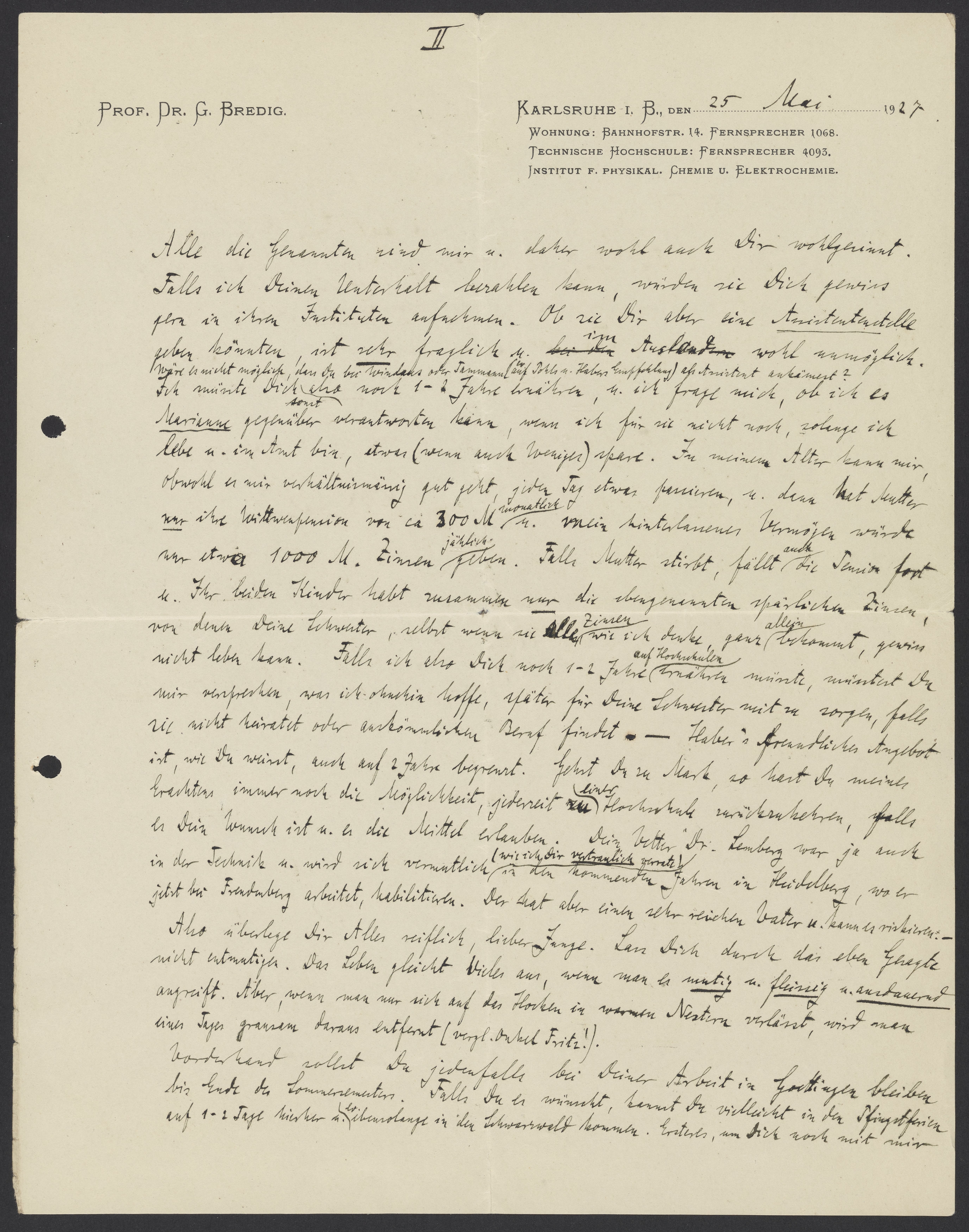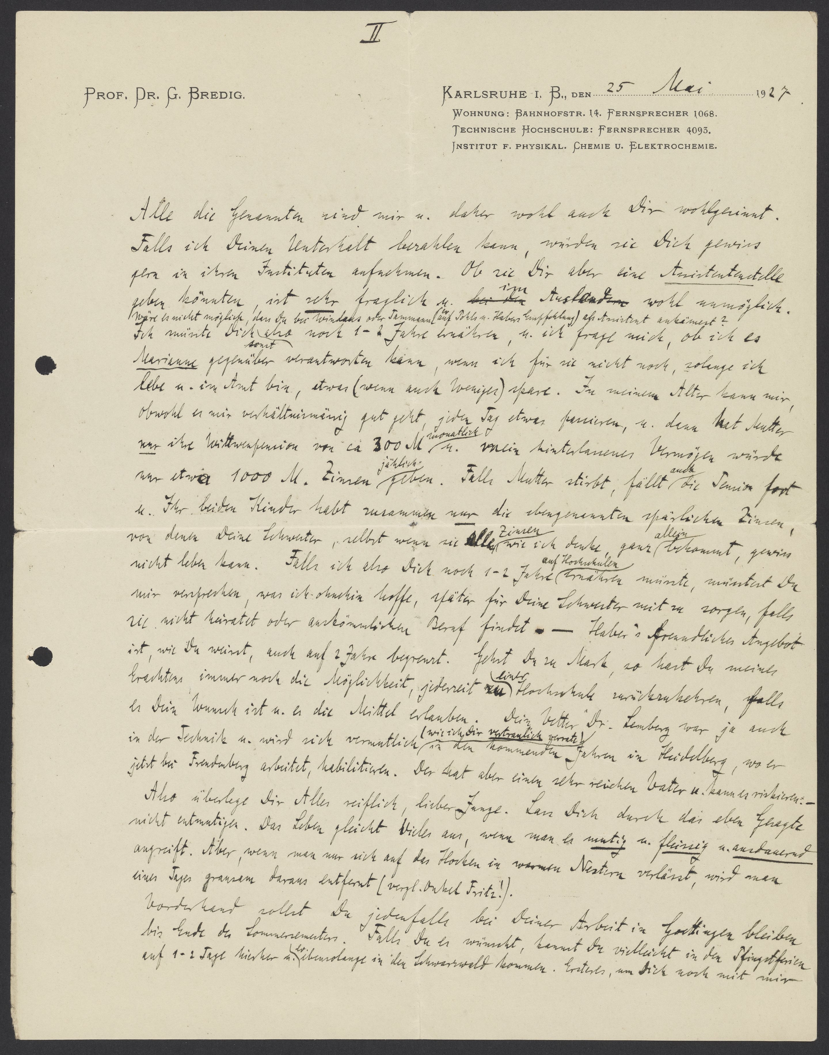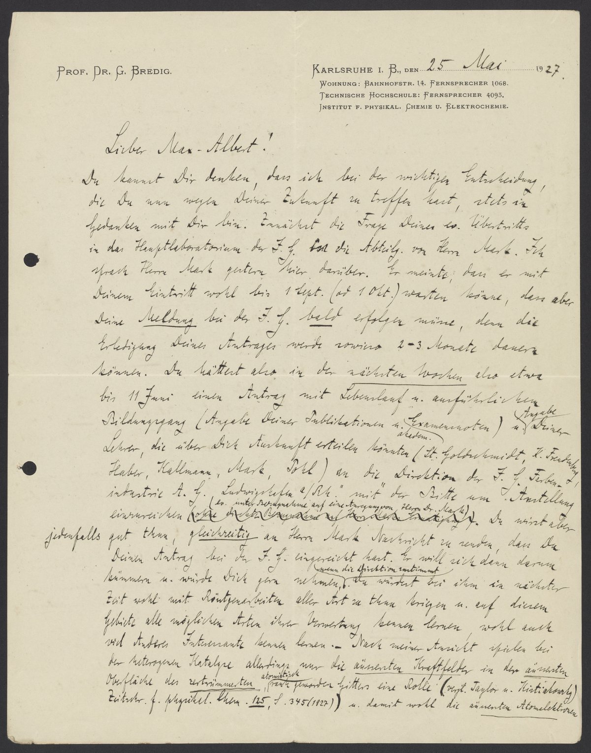 Bredig, Georg. “Letter from Georg Bredig to Max Bredig, May 25, 1927,” May 25, 1927. Papers of Georg and Max Bredig, Box 7, Folder 9. Science History Institute. Philadelphia. https://digital.sciencehistory.org/works/oxdlko0.