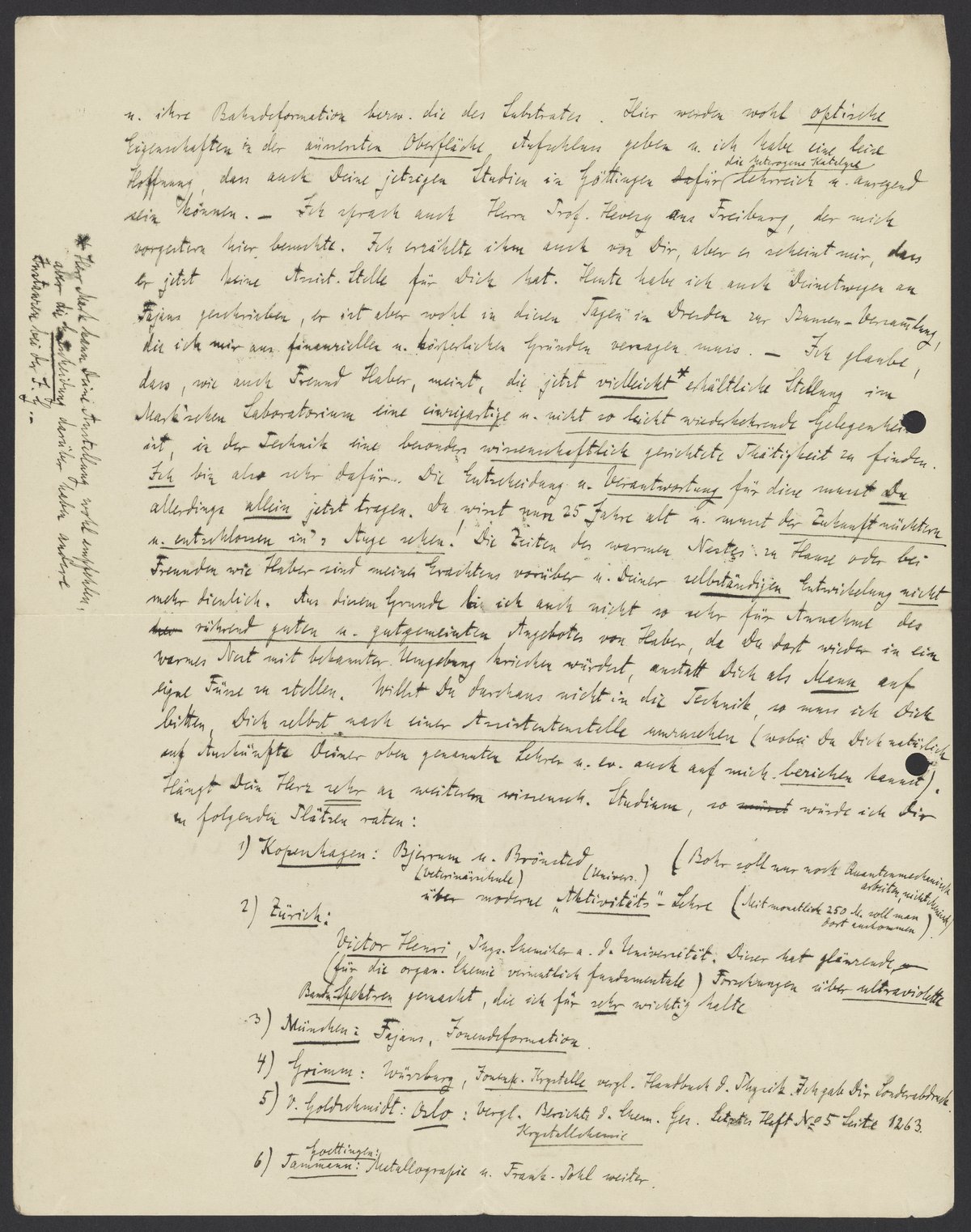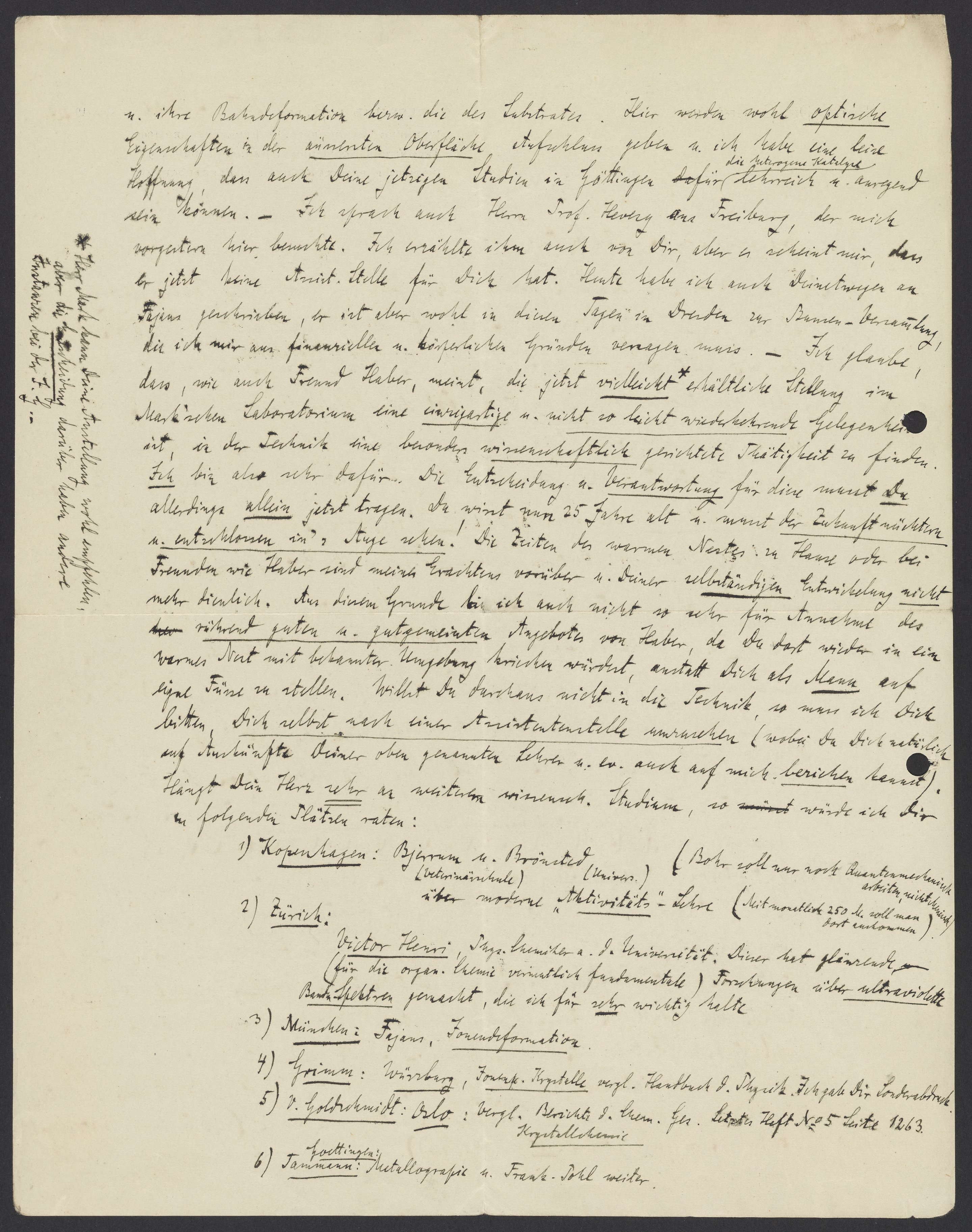 Optical properties in the outermost surface will probably provide information here and I somehow hope that your current studies in Göttingen can also be instructive and motivating regarding heterogeneous catalysis. I also spoke to Professor Hevesy from Freiburg, who visited me here the day before yesterday. I also told him about you, but I think that he doesn’t have an assistant position for you now. Today, I also wrote to Fajans about you, but he is probably in Dresden at the moment for the Bunsen conference, which I must miss for financial and health reasons. Haber and I believe the position in Mark's laboratory that is now possibly* available is a unique, and not easily recurring opportunity to find. Moreover, it is a scientifically oriented position in industry. Hence, I’m very much for it. However, you alone must bear the responsibility and reach a decision about this now. You are now 25 years old and must face the future soberly and resolutely! In my opinion, the times of a warm nest at home or with friends like Haber are over and no longer conducive to your independent development. For this reason, I am not really in favor of you accepting Haber's touchingly good and well-intentioned offer, since you would crawl back into a warm nest with familiar surroundings instead of standing on your own two feet as a man. If you don't want to go into industry at all, I must ask you to look for an assistantship independently (whereby you can of course refer to information from your aforementioned teachers and possibly also to me). If your heart is in further scientific studies, I would point you to the following places: