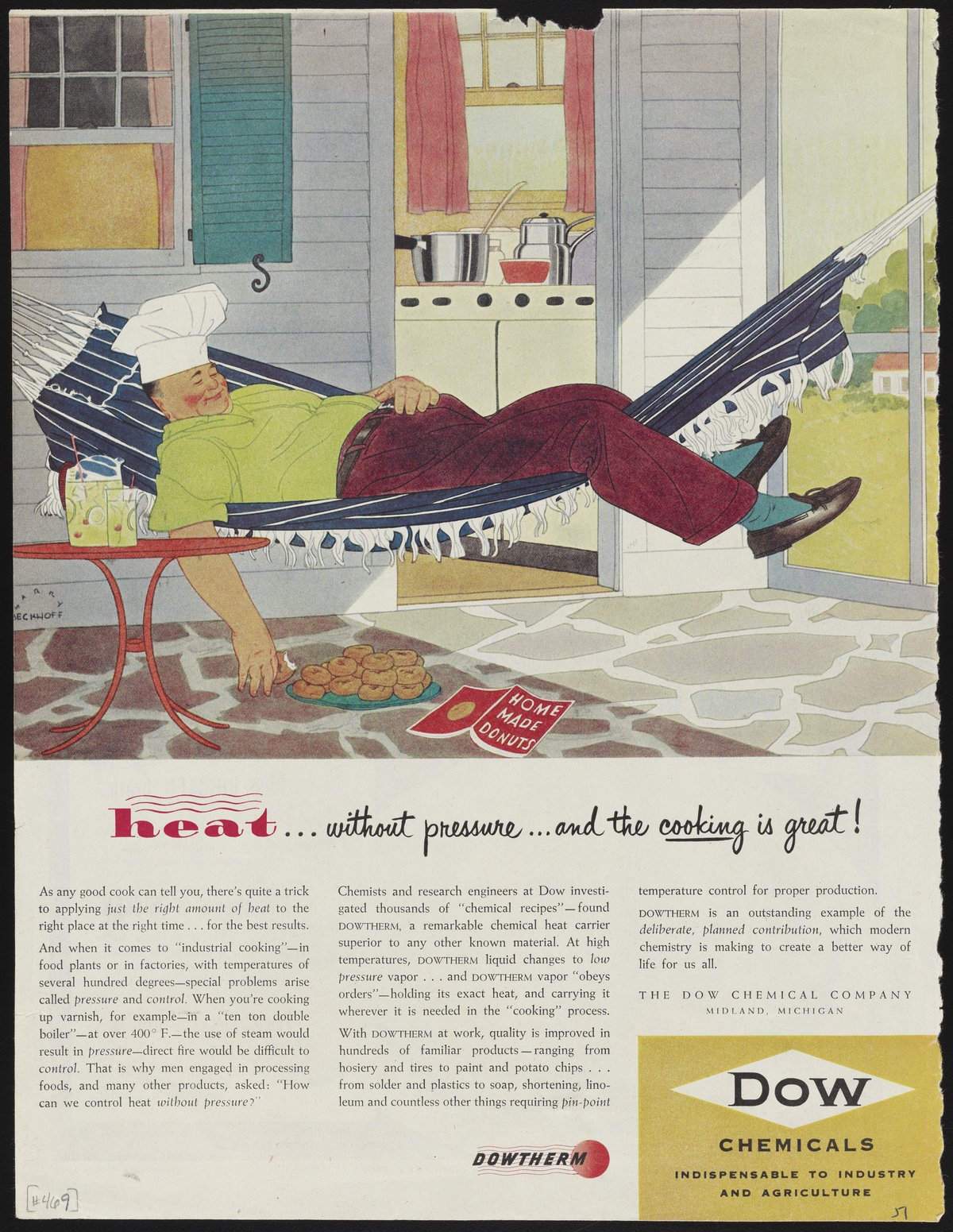 Color print advertisement for Dowtherm, a heat transfer fluid manufactured and sold by the Dow Chemical Company. The advertisement features an illustrated depiction of a man relaxing in a hammock with a plate of homemade donuts. The accompanying text details the use of Dowtherm to control and regulate heat during the production of a range of materials, including paint, soap, and plastics.