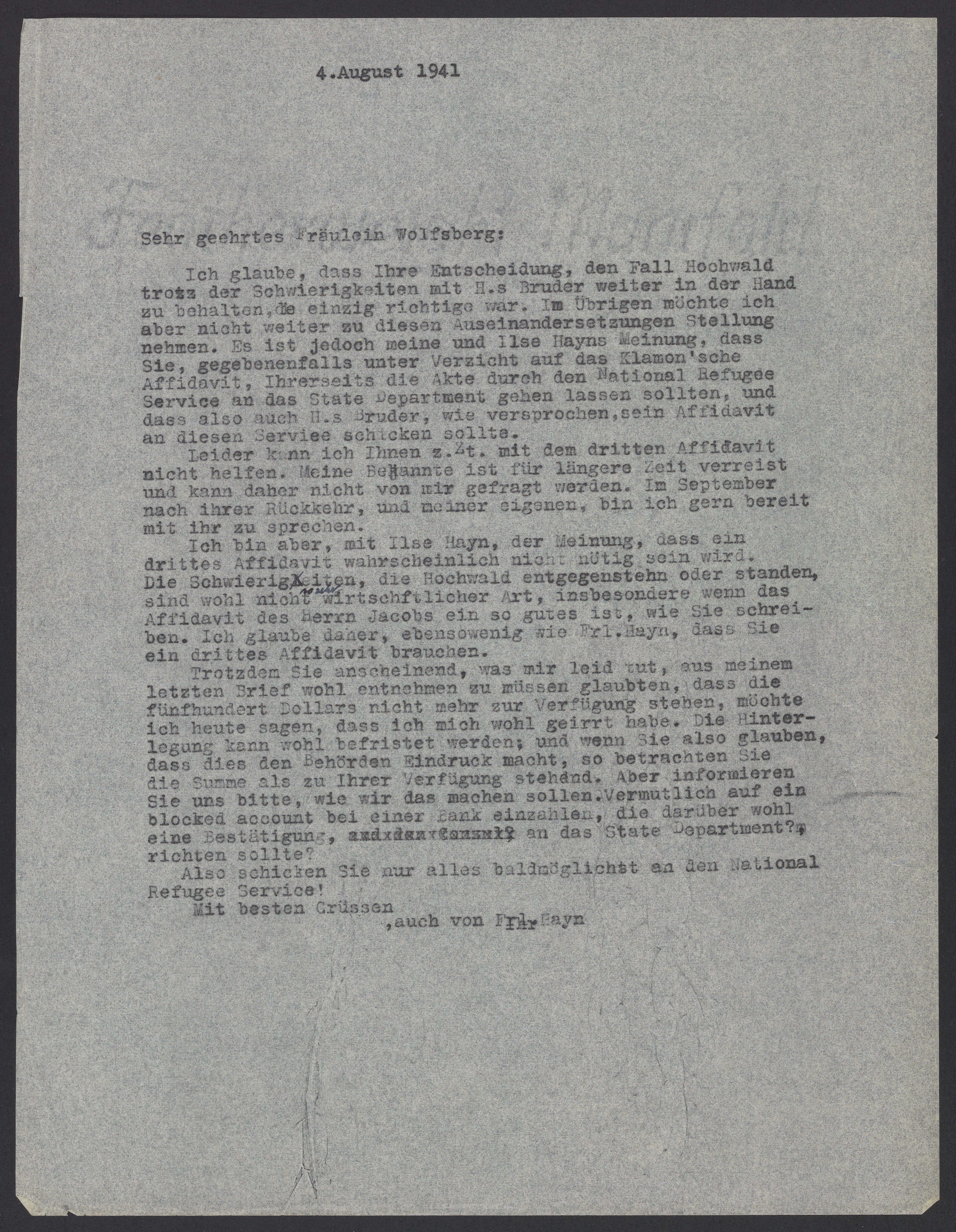 Letter from Max Bredig to Ilse Wolfsberg, August 4, 1941
