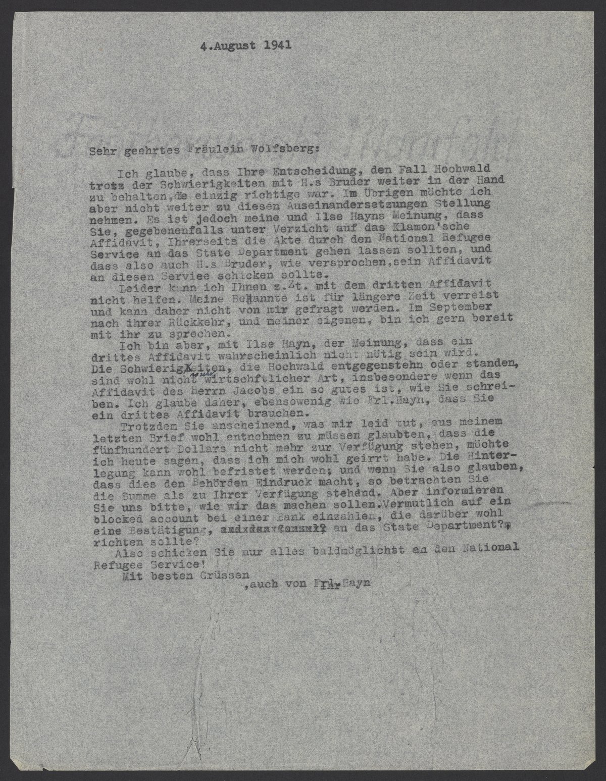 Ich glaube, dass Ihre Entscheidung, den Fall Hochwald trotz der Schwierigkeit mit H.s Bruder weiter in der Hand zu behalten, die einzig richtige war. Im Übrigen möchte ich aber nicht weiter zu diesen Auseinandersetzungen Stellung nehmen. Es ist jedoch meine und Ilse Hayns Meinung, dass Sie, gegebenenfalls unter Verzicht auf das Klamon’sche Affidavit, Ihrerseits die Akte durch den National Refugee Service an das State Department gehen lassen sollten, und dass also auch H.s Bruder, wie versprochen, sein Affidavit an diesen Service schicken sollte.