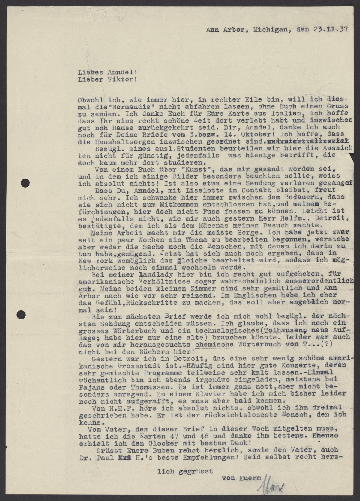 Letter from Max Bredig to Marianne Homburger and Viktor Homburger, November 1937