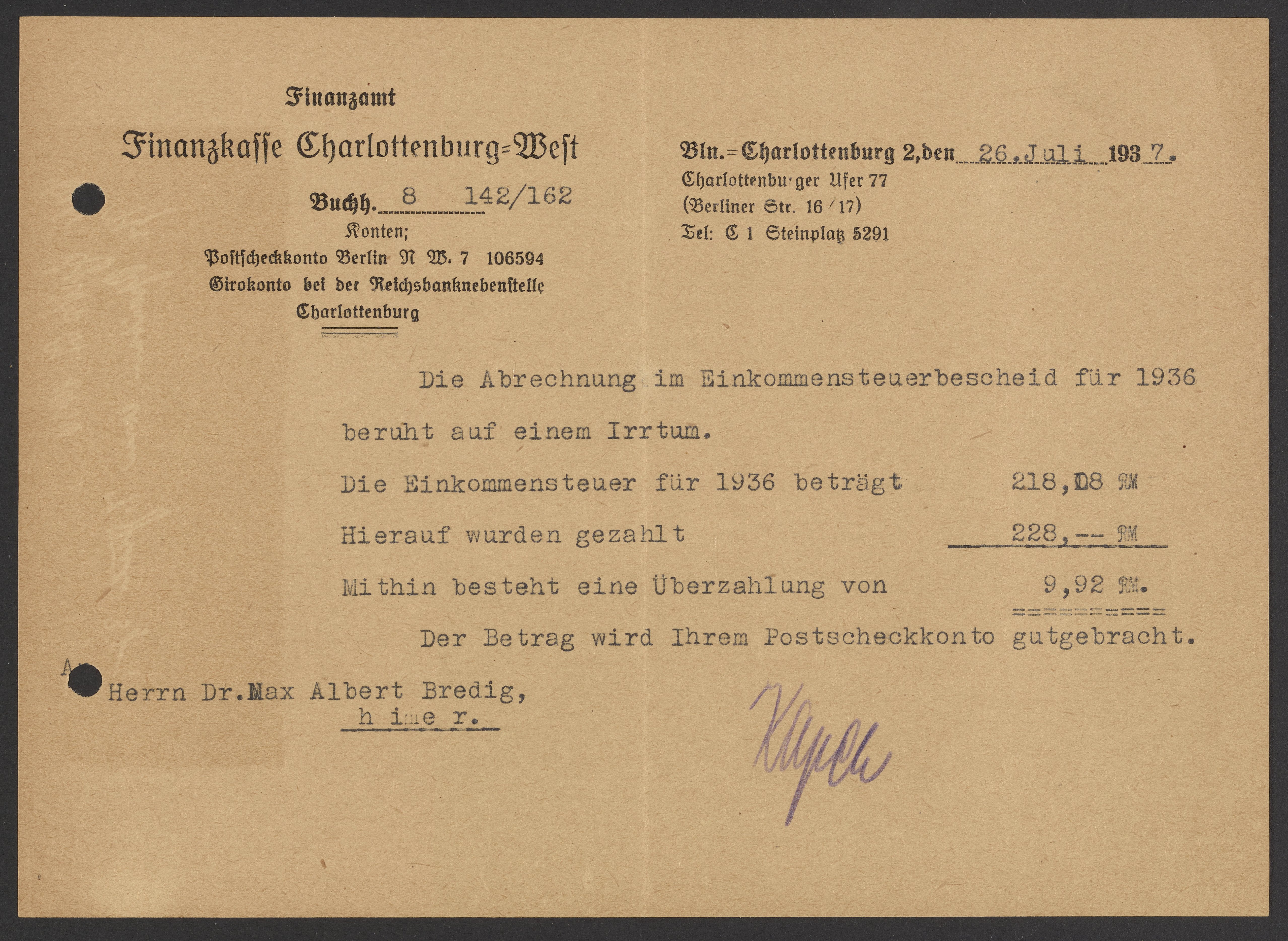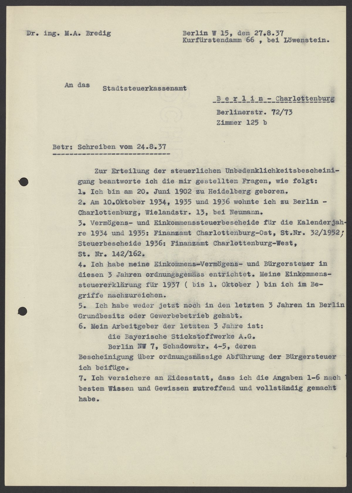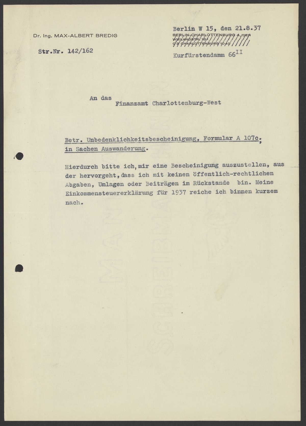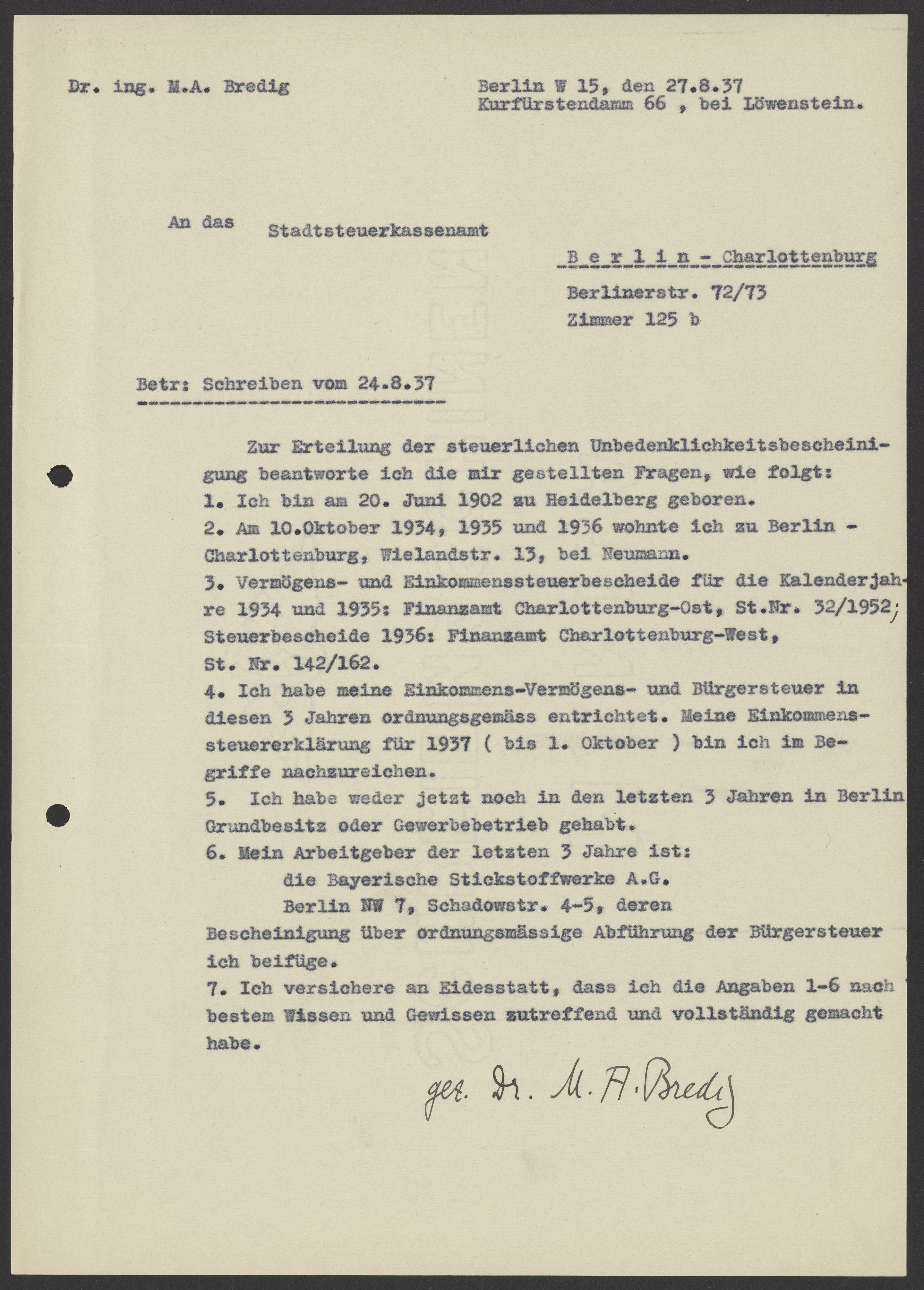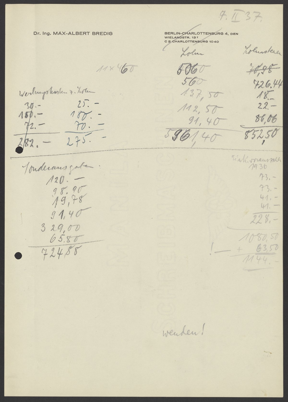 Financial documents of Max Bredig, 1937