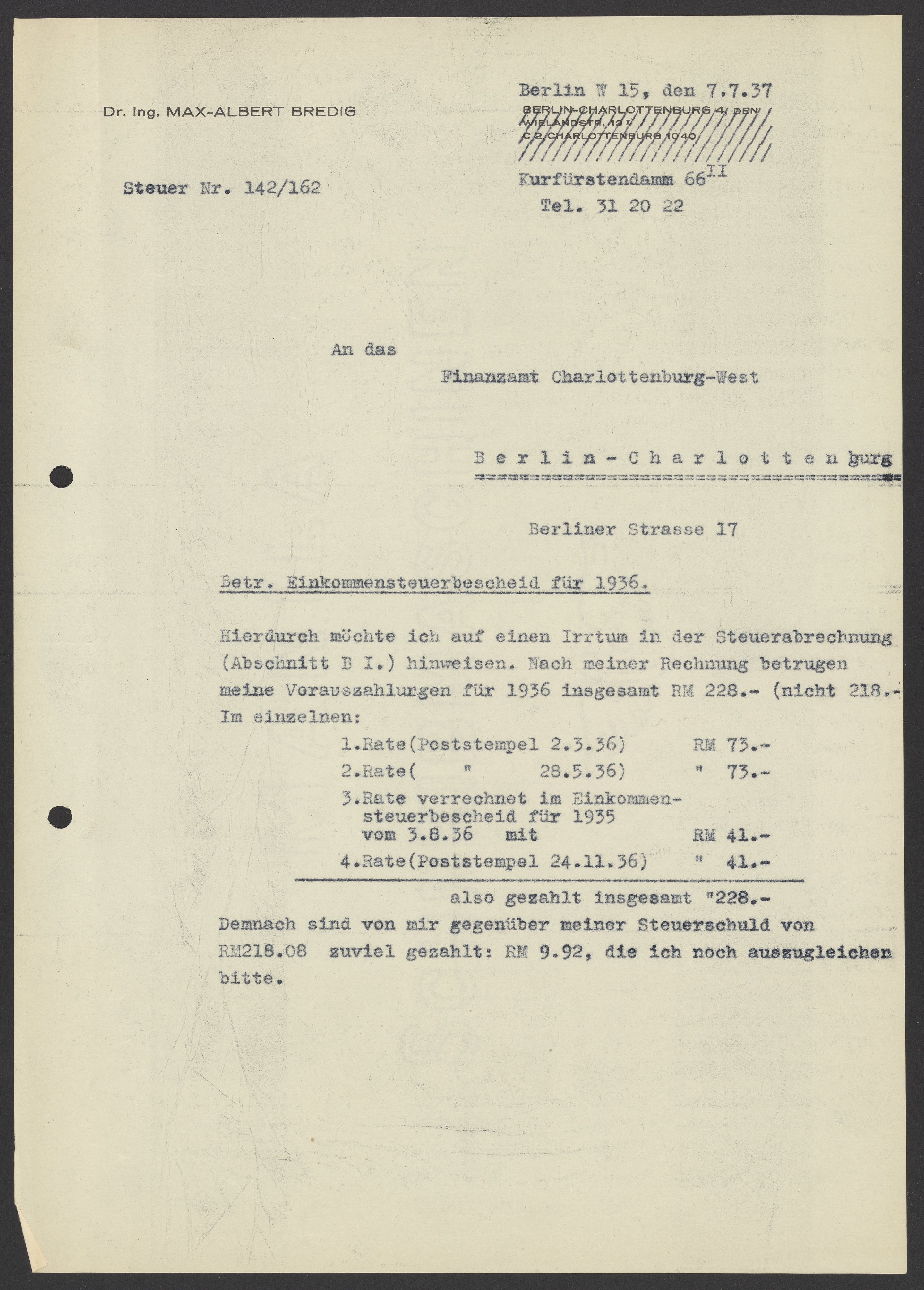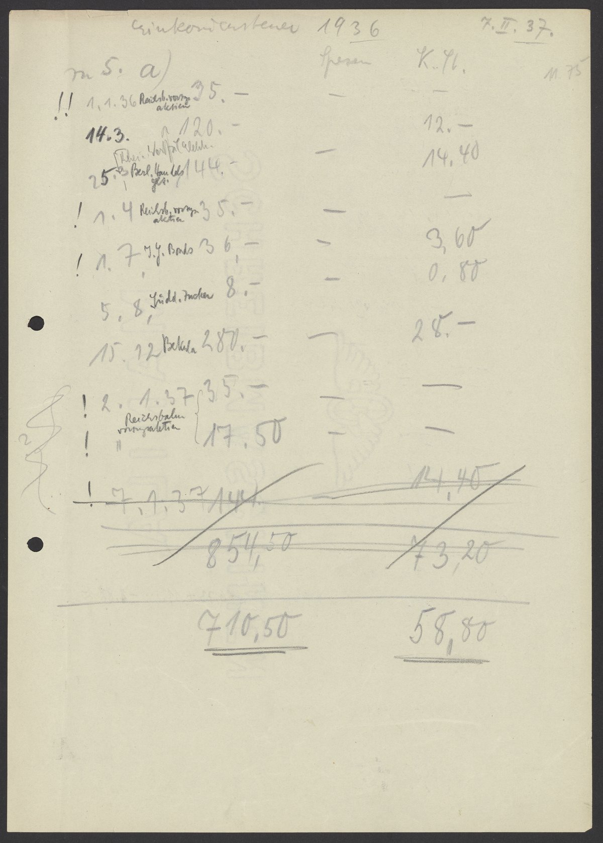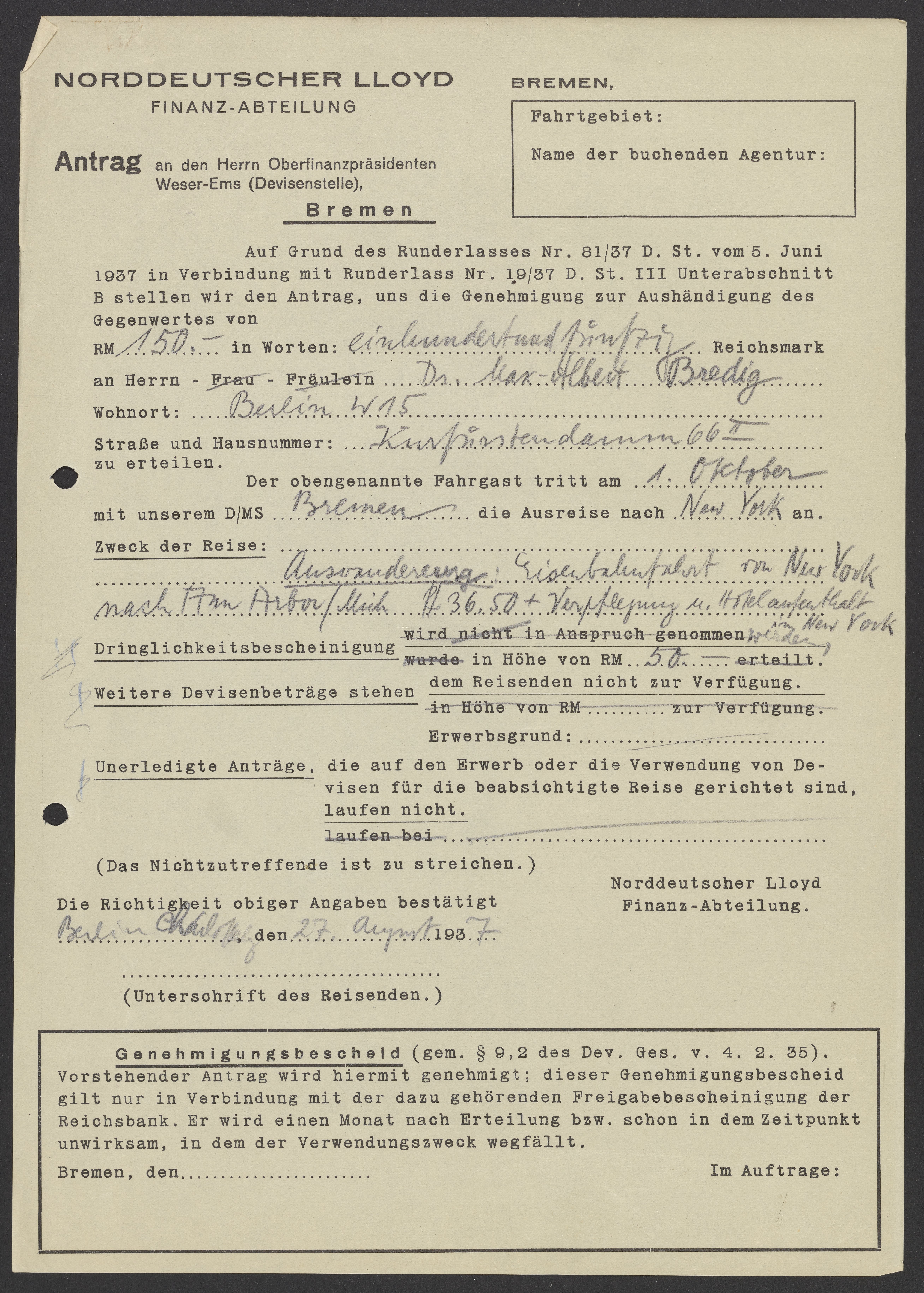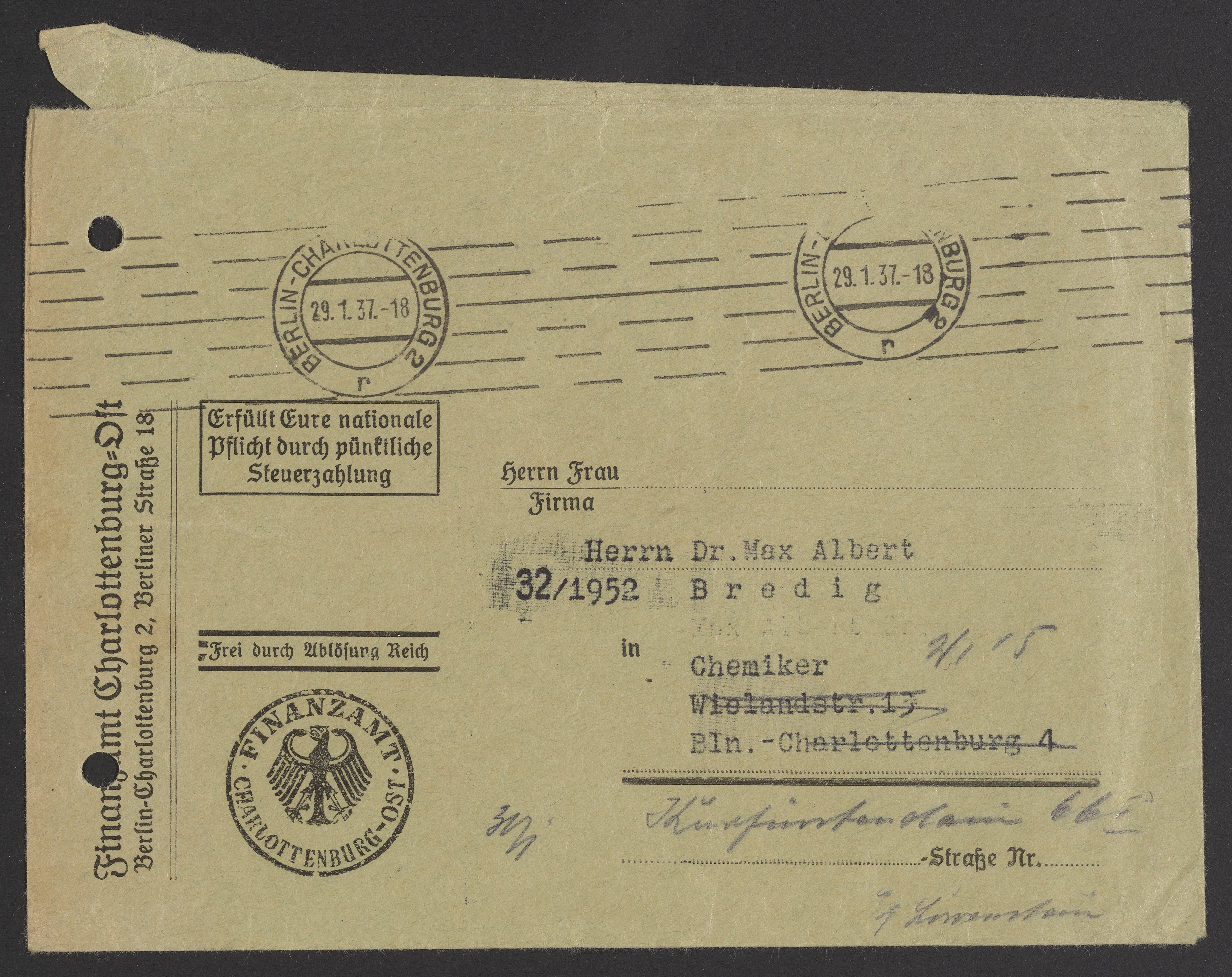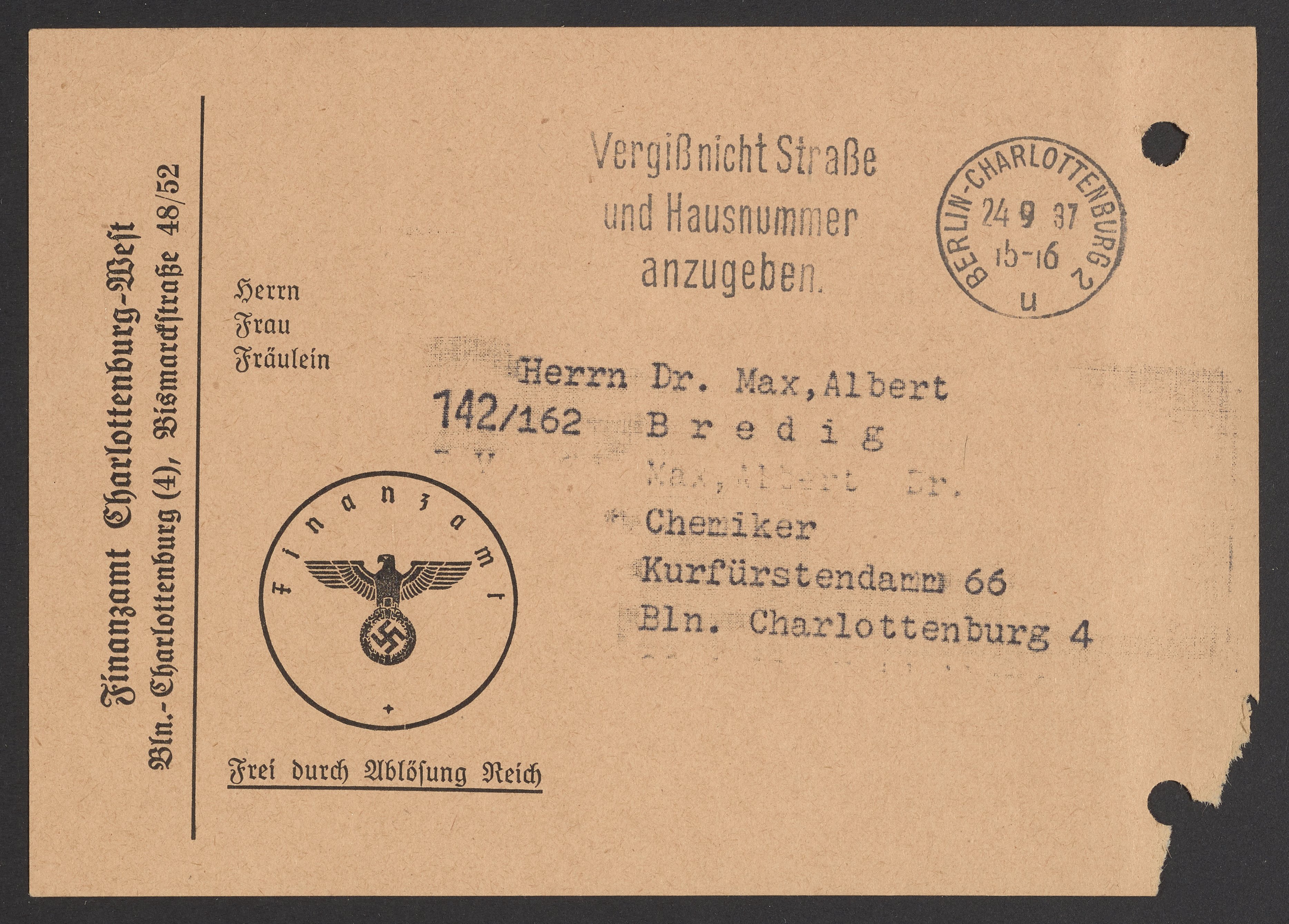 Financial documents of Max Bredig, 1937