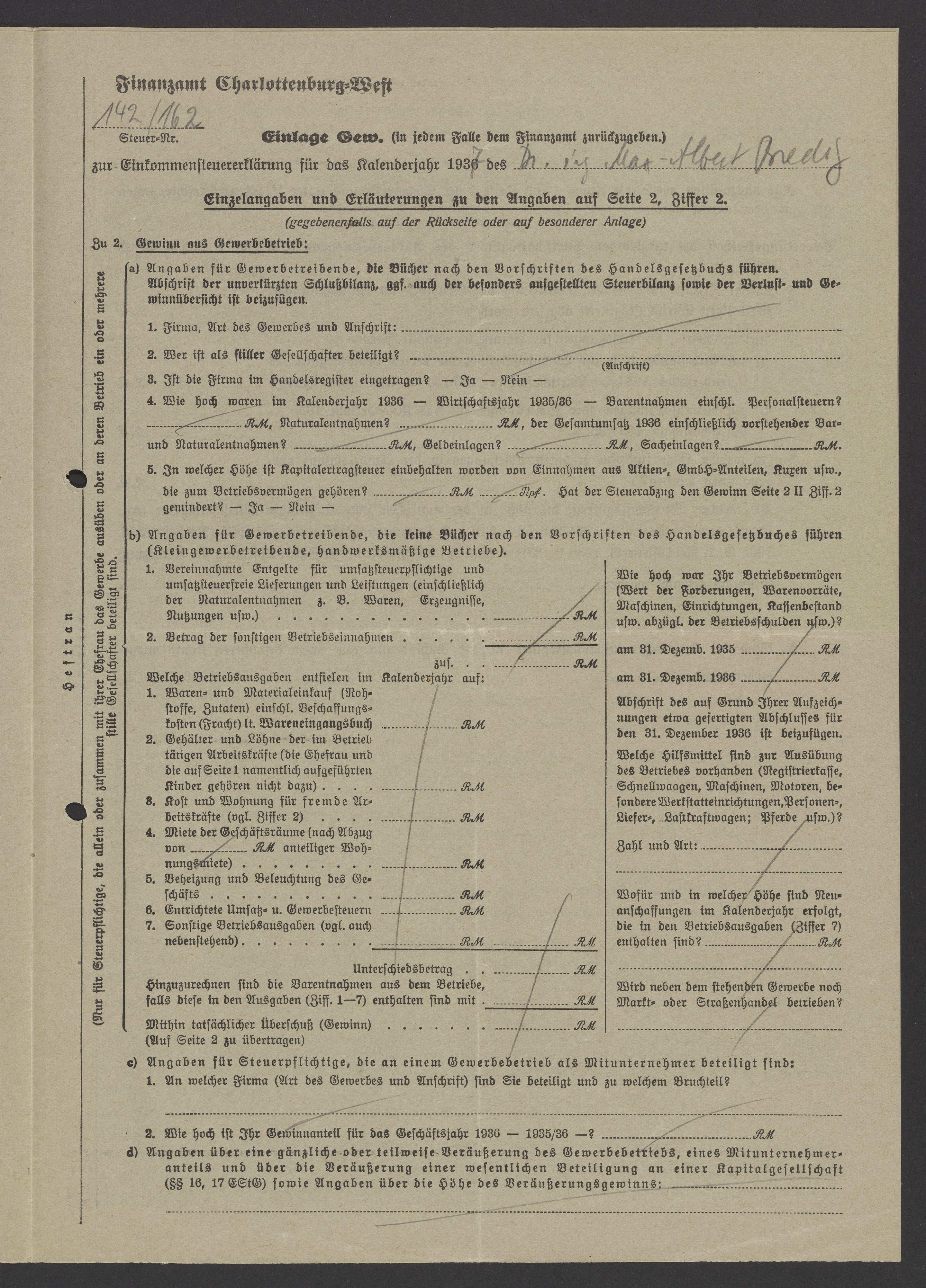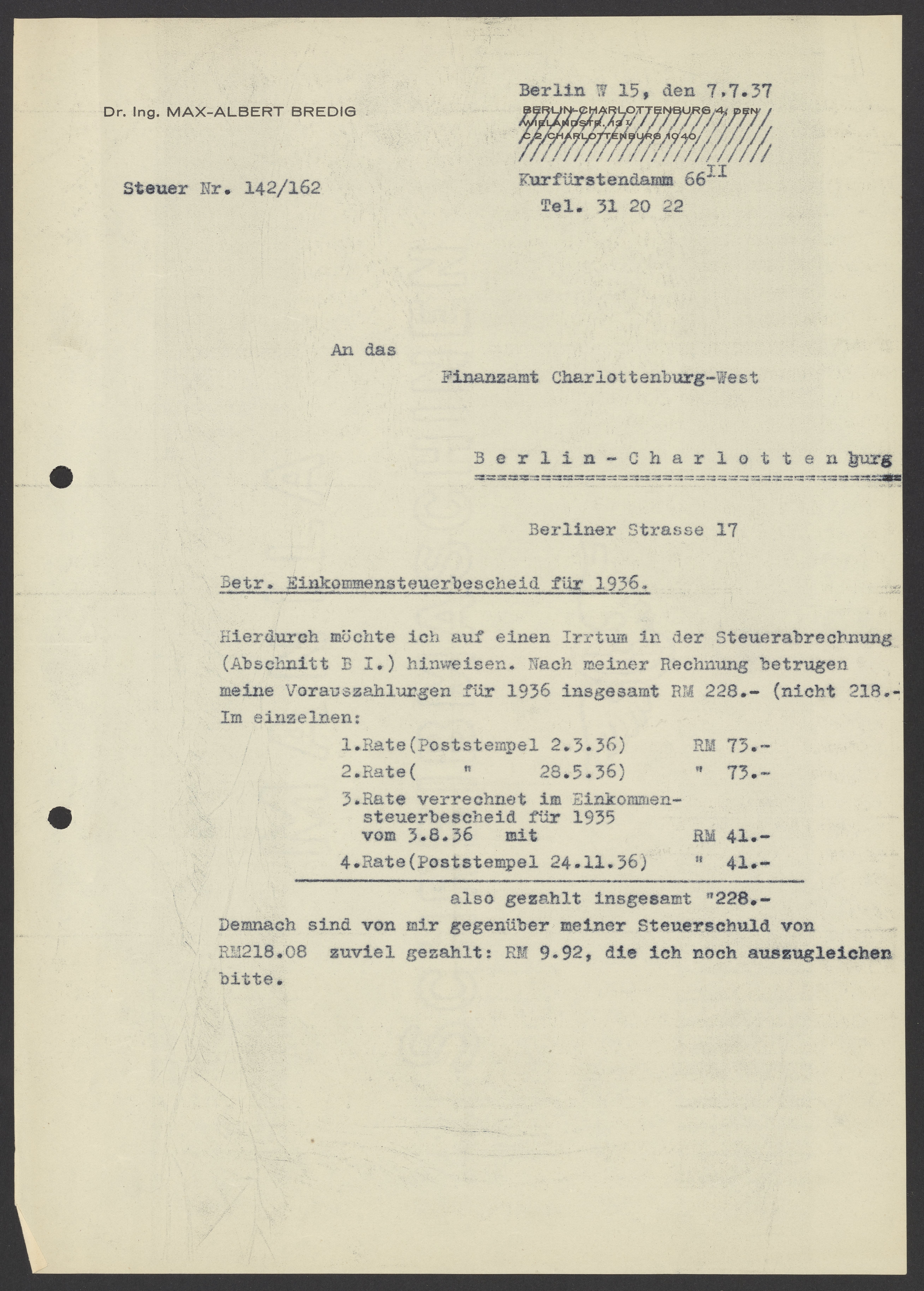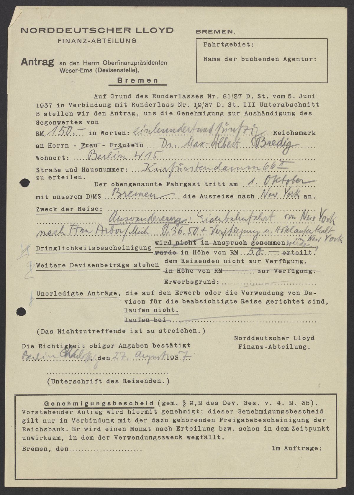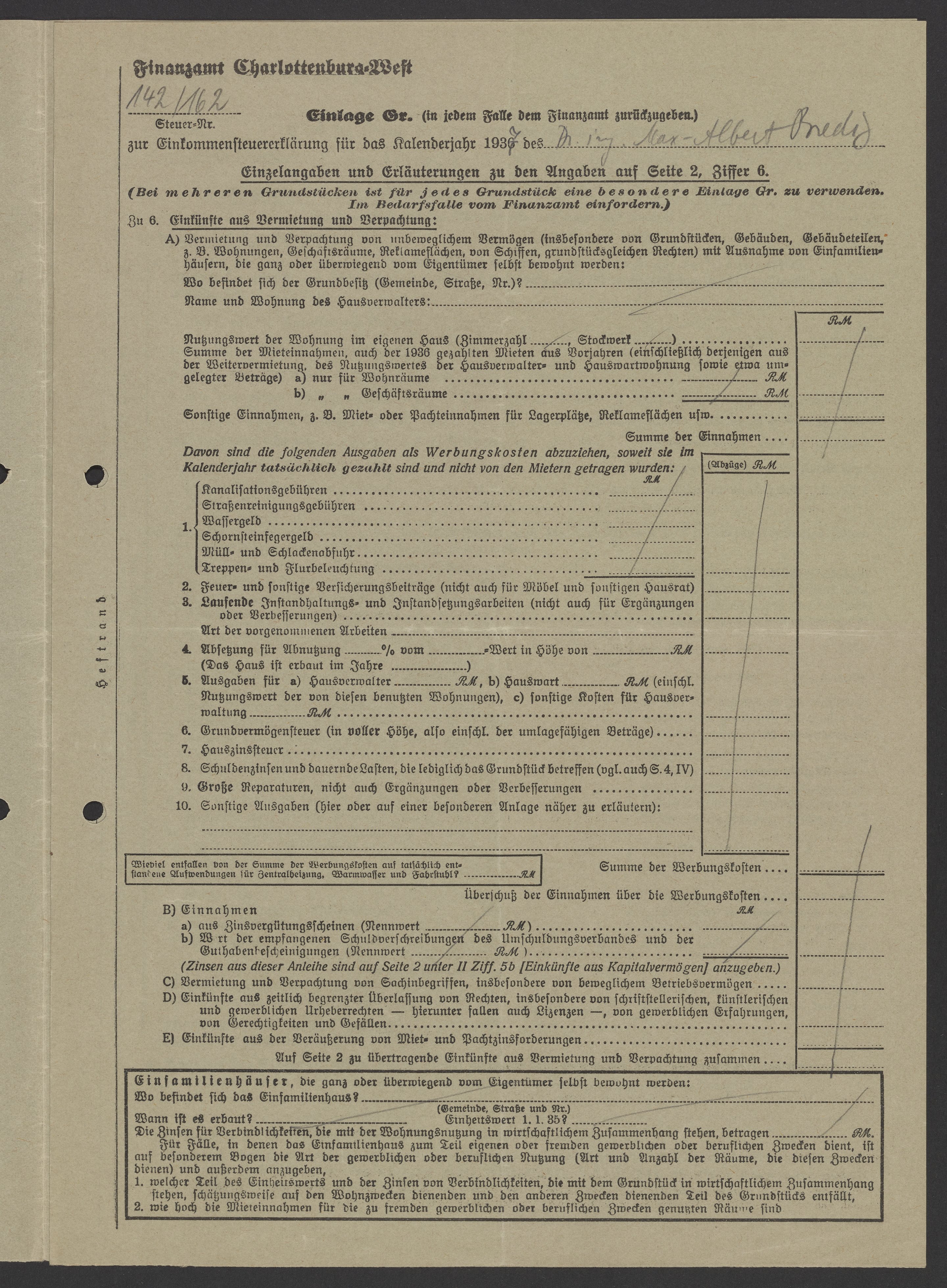 Financial documents of Max Bredig, 1937