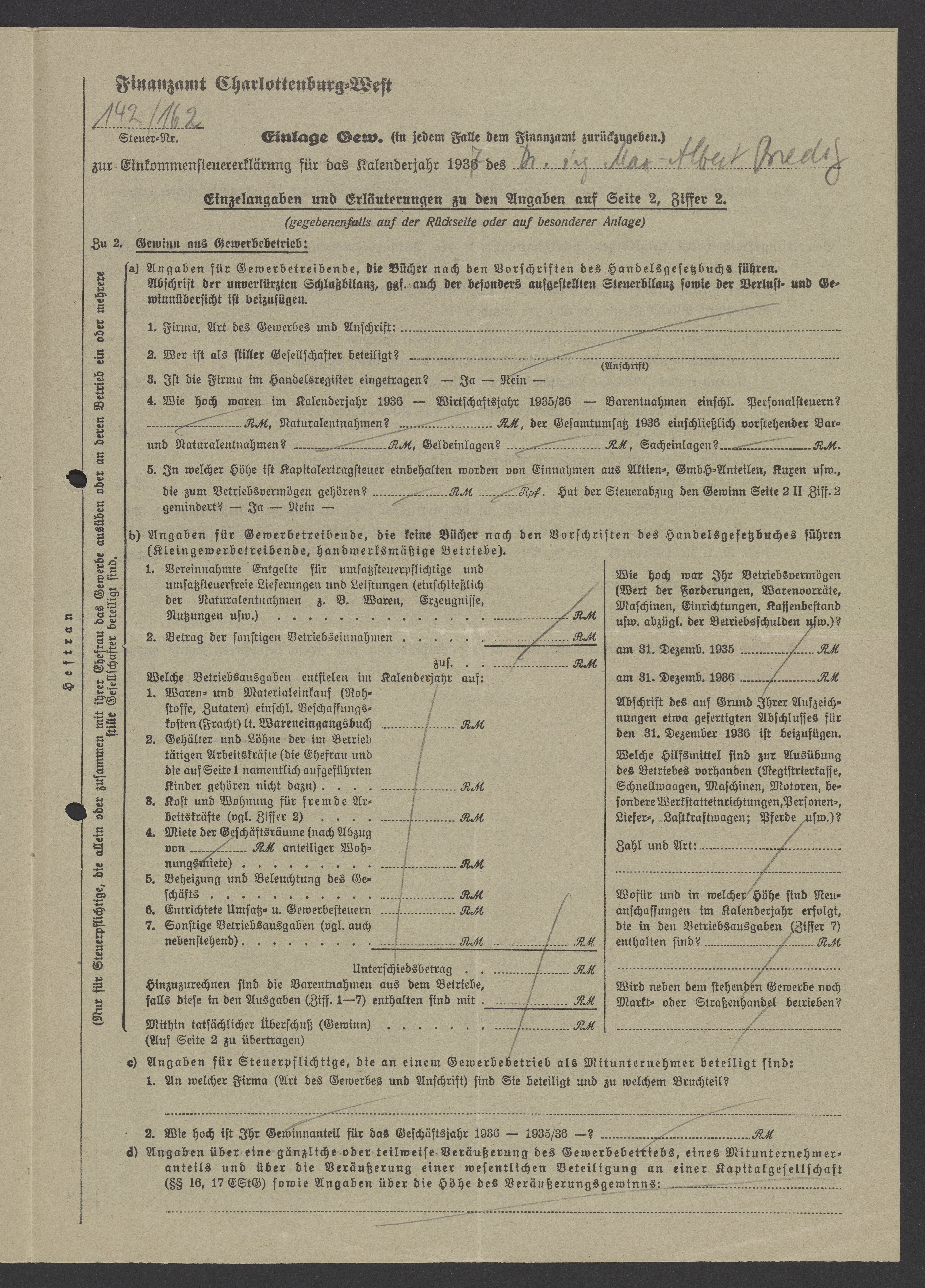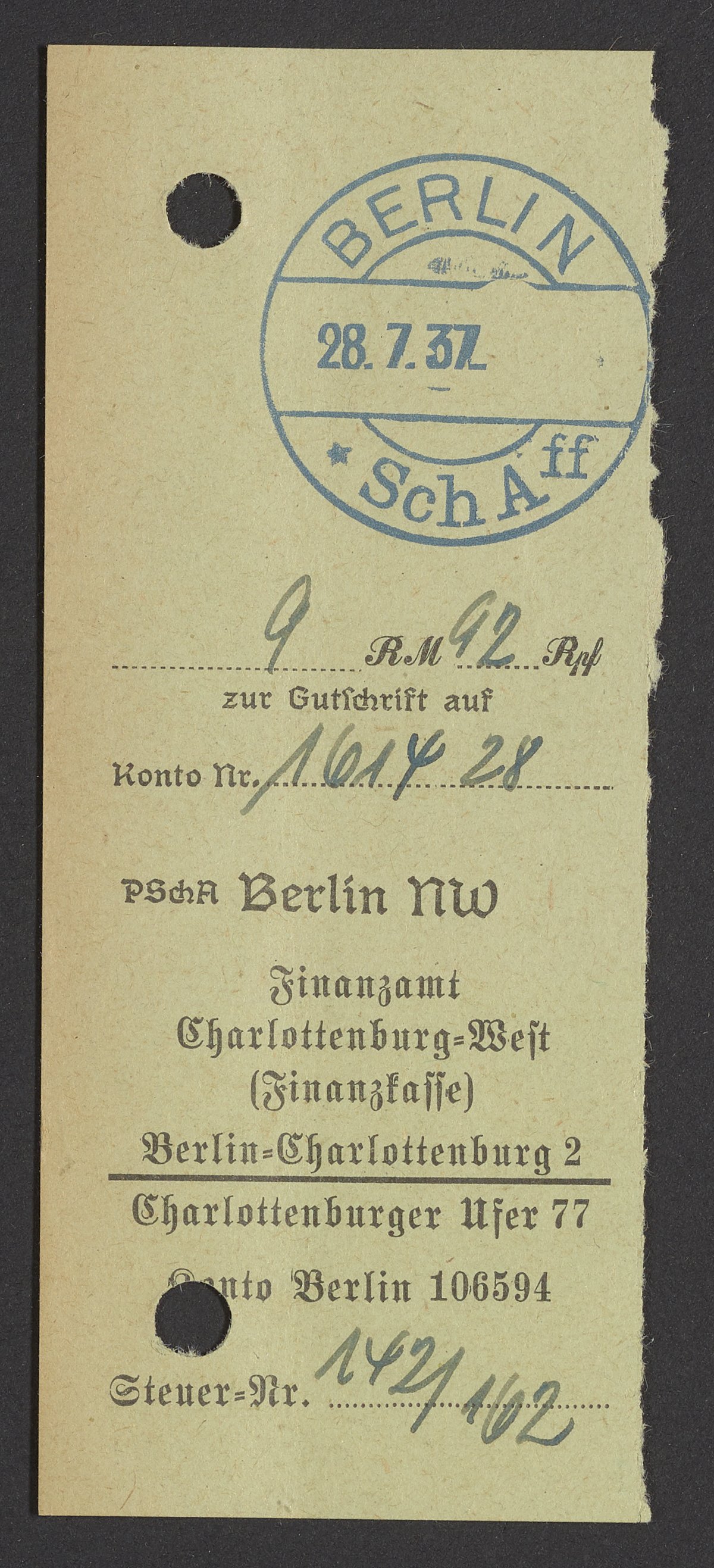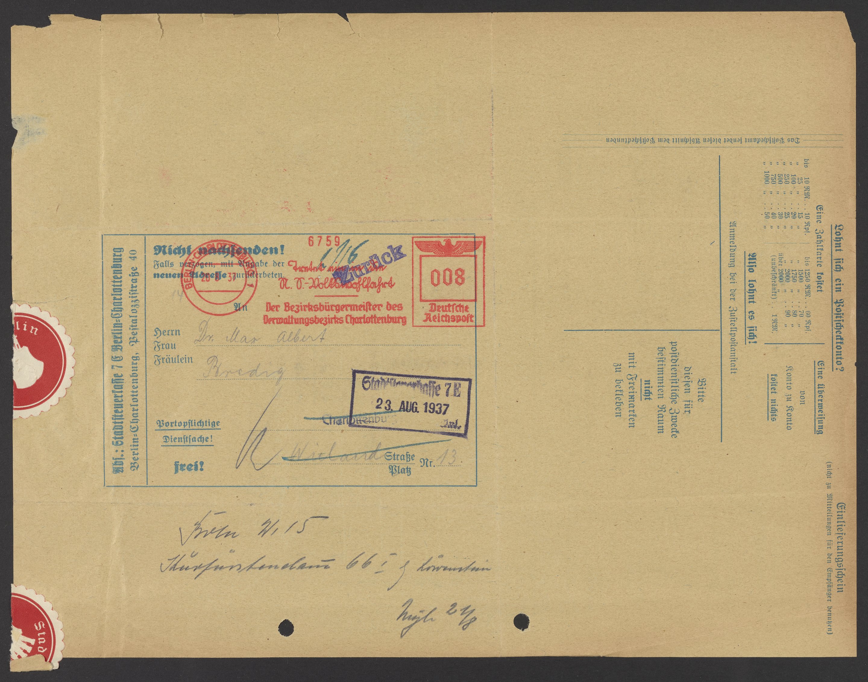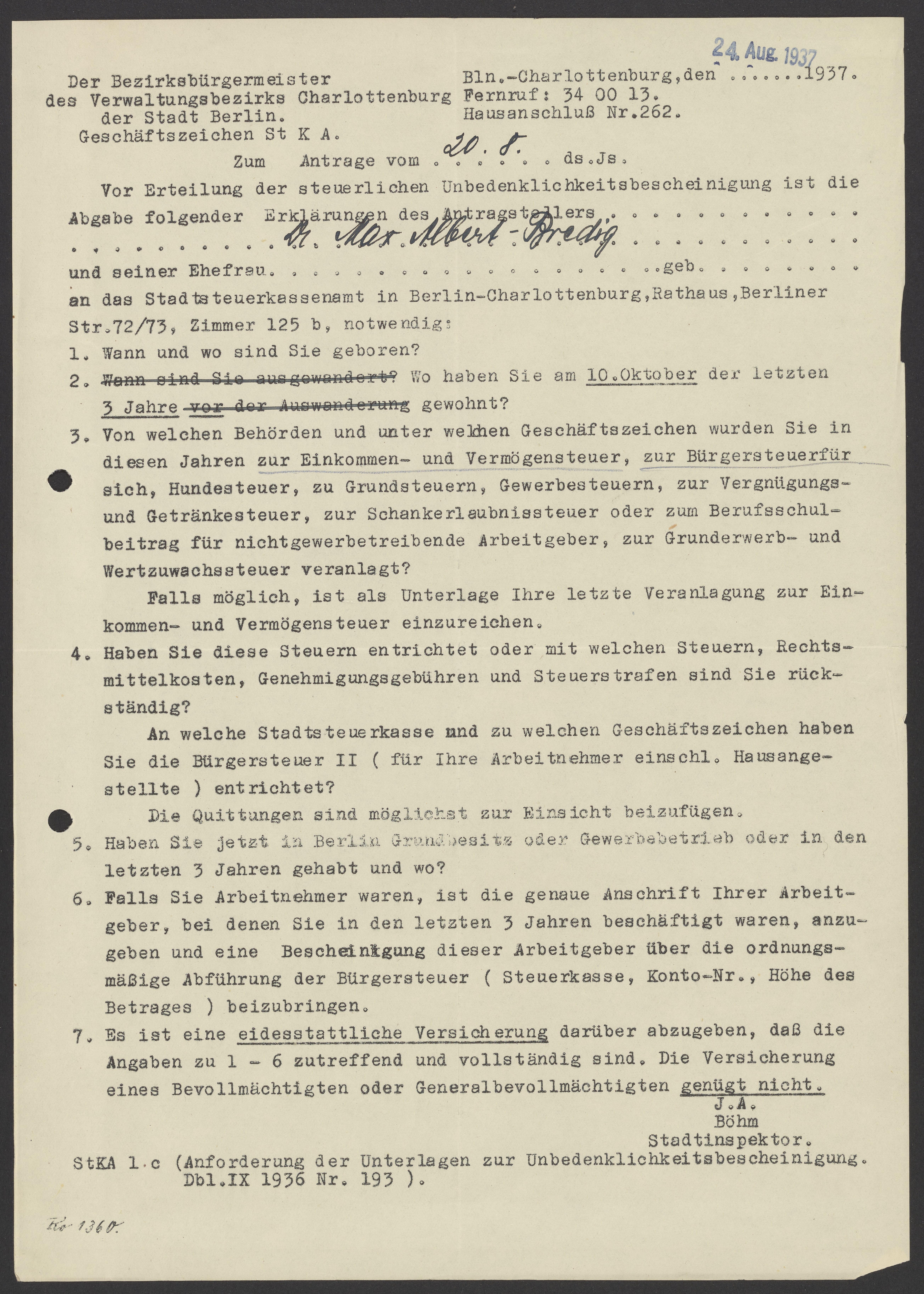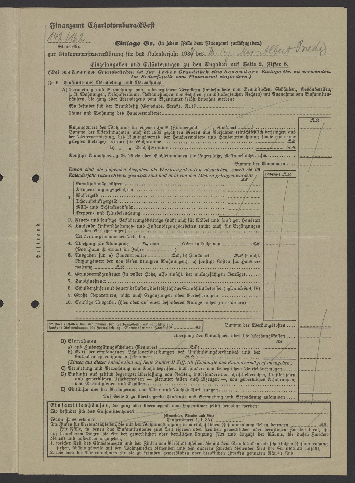 Financial documents of Max Bredig, 1937