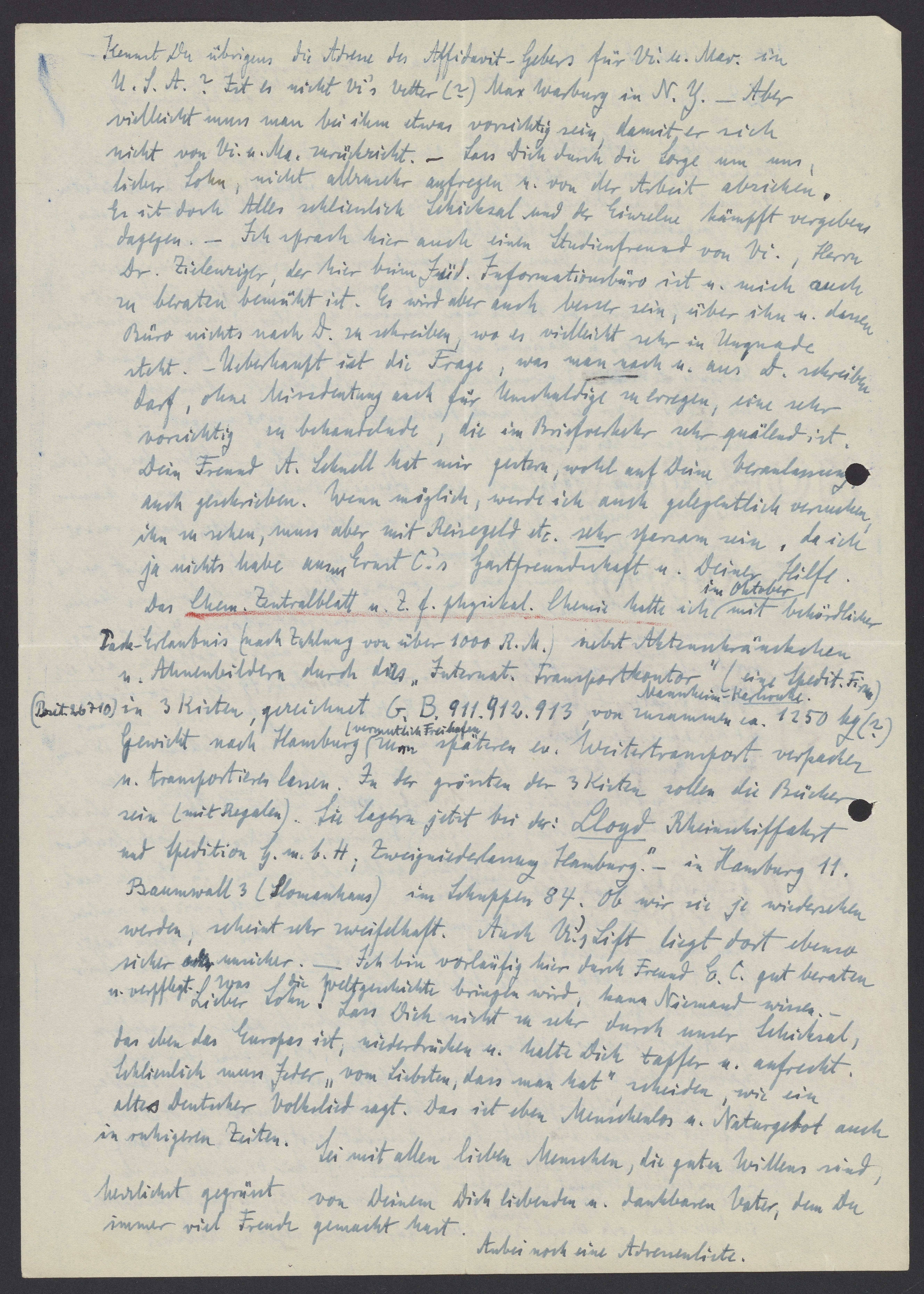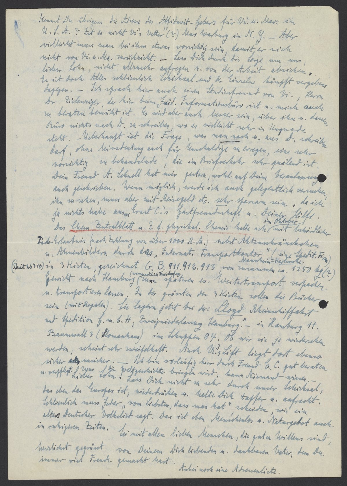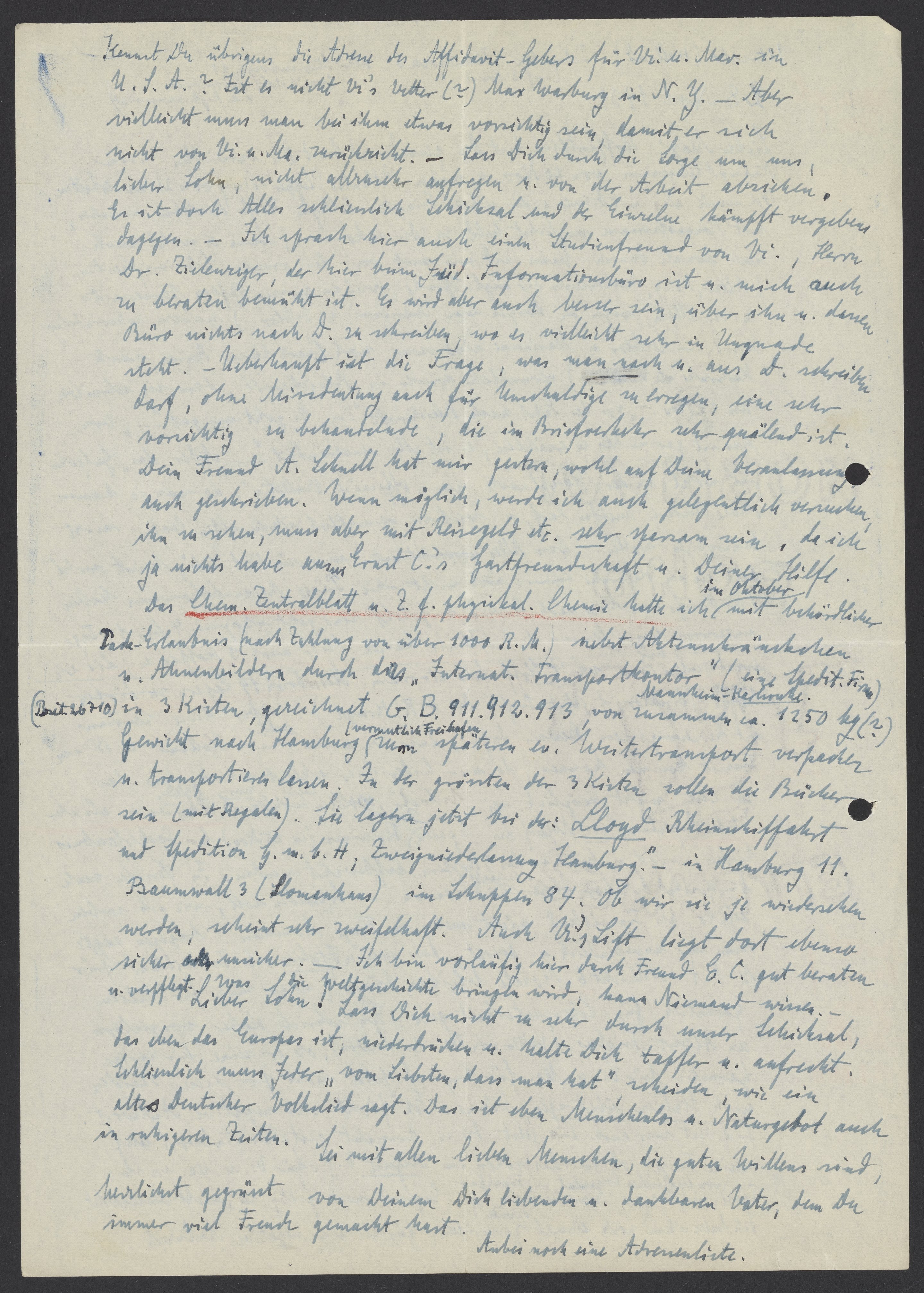 Kennst Du übrigens die Adresse des Affidavit-Gebers für Vi. u. Mar. in U.S.A? Ist er nicht Vi’s Vetter? Max Warburg in N.Y. – Aber vielleicht muss man bei etwas vorsichtig sein, damit er sich nicht von Vi. u. Ma. zurückzieht. – Lass Dich durch die Sorge um uns, lieber Sohn, nicht allzu sehr aufregen, u. von der Arbeit abziehen. Es ist doch Alles schliesslich Schicksal und der Einzelne kämpft vergebens dagegen. Ich sprach hier auch einen Studienfreund von Vi., Herrn Dr. Zielenzigler, der hier beim Jüd. Informationsbüro ist u. mich zu beraten bemüht ist. Es wird aber auch besser sein, über ihn u. dessen Buero nichts nach D. zu schreiben, wo es vielleicht sehr in Ungnade seht. – Überhaupt ist die Frage, was man nach u. aus D. schreiben darf, ohne Missdeutung auch für Unschuldige zu erregen, eine sehr vorsichtig zu behandelnde, die im Briefverkehr sehr quälend ist. Dein Freund A. Schnell hat mir gestern, wohl auf Deine Veranlassung, auch geschrieben. Wenn möglich, werde ich auch gelegentlich versuchen ihn zu sehen, muss aber mit Reisegeld etc. sehr sparsam sein, da ich ja nichts habe ausser Ernst C.‘s Gastfreundschaft u. Deiner Hilfe. Das Chem. Zentralblatt u. Z.f.physikal. Chemie hatte ich im Oktober behördlicher Pack-Erlaubnis (nach Zahlung von über 1000 R.M.) nicht Aktenschränken u. Ahnenbildern durch das „Internat. Transportkontor“ (eine Spedit. Firma) (--26710) in 3 Kisten, gezeichnet G.B. 911.912.913, von zusammen ca. 1250 kg (?) Gewicht nach Hamburg (vermutlich Freihafen) zum späteren ev. Weitertransport verpacken u. transportieren lassen. Zu der grössten der 3 Kisten solle die Bücher sein (mit Regalen). Sie lagern jetzt bei der: „Lloyd Rheinschifffahrt mit Spedition G.m.b.H; Zweigniederlassung Hamburg.“ in Hamburger 11. Baumwall 3 (Slomanhaus) in Schuppen 84. Ob wir sie je wiedersehen werden, scheint sehr zweifelhaft. Auch Vi., Lift liegt dort ebenso sicher oder unsicher. – Ich bin vorläufig hier durch Freund E.C. gut beraten u. verpflegt. Was die Weltgeschichte bringen wird, kann Niemand wissen.