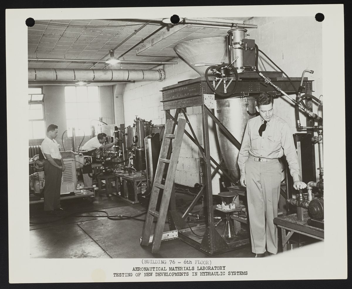 General view of workers testing the features of new hydraulic systems at the Naval Air Material Center's Aeronautical Materials Laboratory. Two workers are seen turning valves on the machinery while a third worker looks on.
