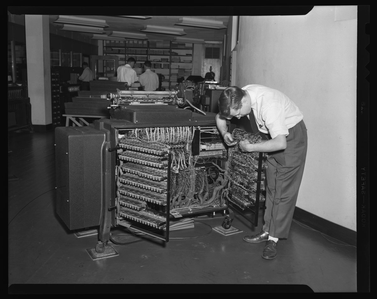 Neil Grover servicing alphabetic tabulator at Dow Tabulating Department