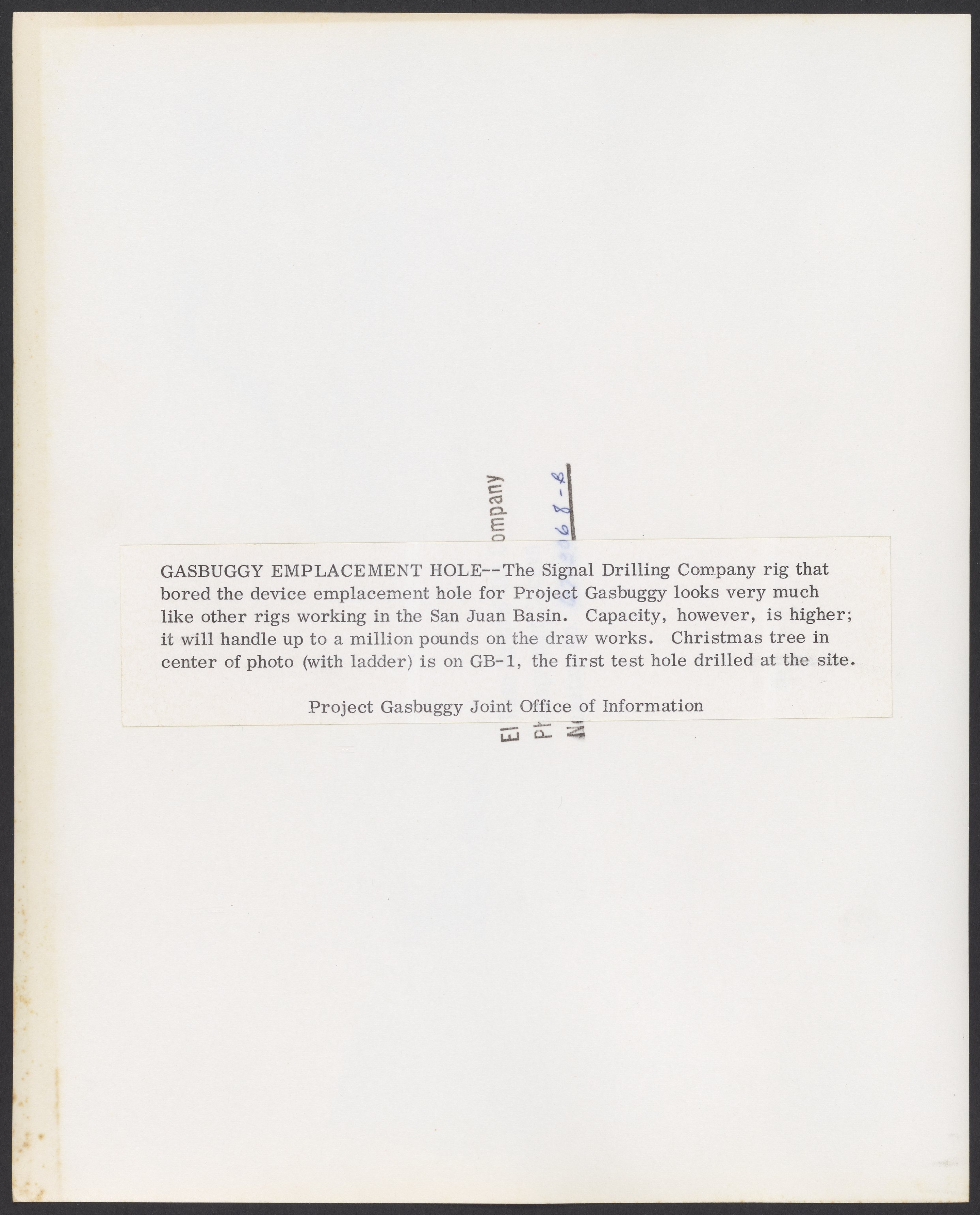 Small JPG1200 x 1480px — 278 KBLarge JPG2880 x 3552px — 1.1 MBFull-sized JPG5076 x 6260px — 2.8 MBOriginal fileTIFF — 5076 x 6260px — 91.0 MBBlack and white photograph of the Signal Drilling Company rig that bored the device emplacement hole for Project Gasbuggy. Also shows the first test hole drilled at the site.