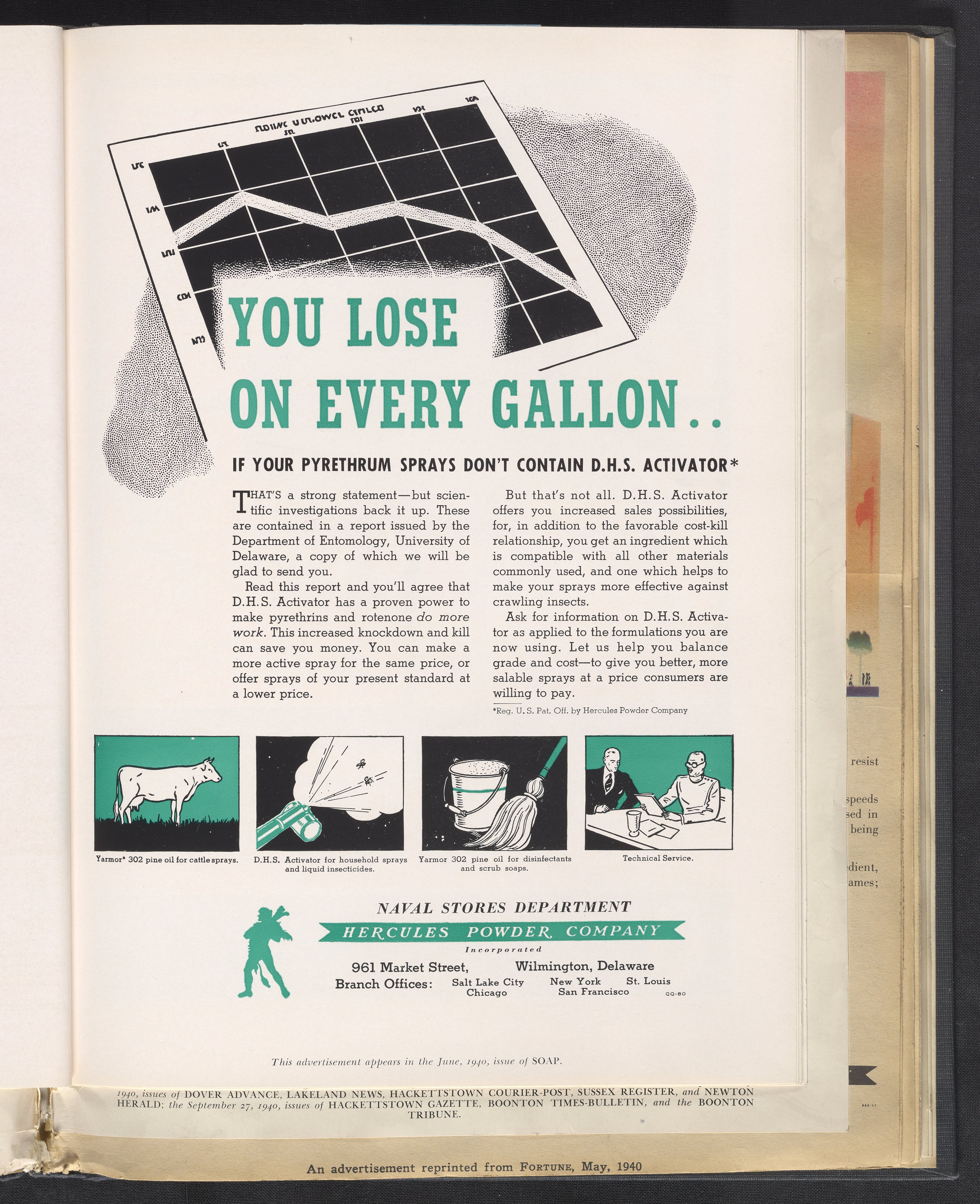 Advertisement for D.H.S. Activator, a trademarked name for Ethylene glycol ether manufactured and sold by the Hercules Powder Company to increase the effectiveness and reduce the manufacturing costs of pyrethrum and rotenone insecticides and sprays. This advertisement was published in the June 1940 issue of Soap.