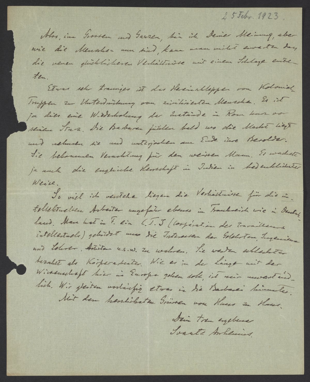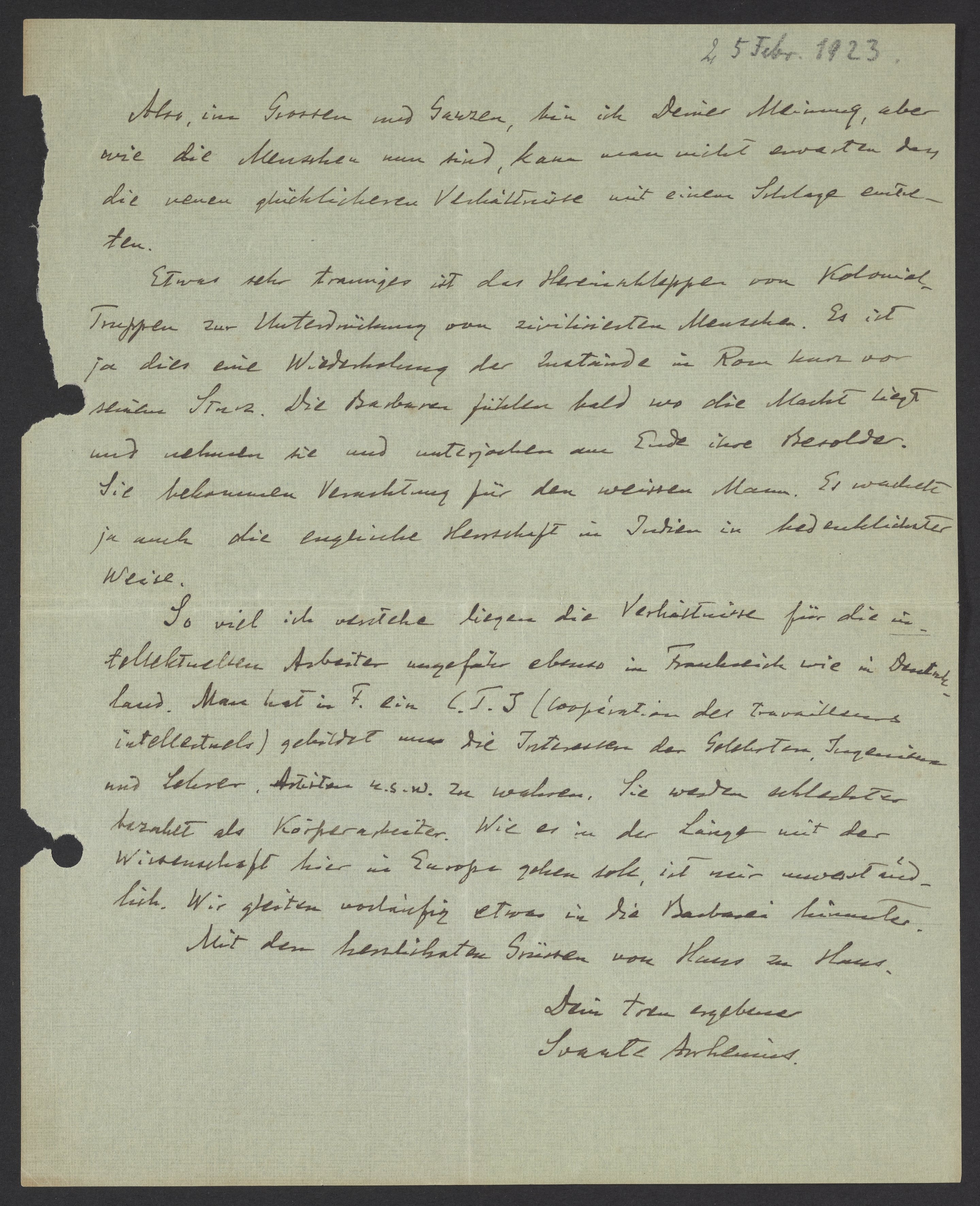 Etwas sehr trauriges ist das Hereinschleppen von Kolonialtruppen zur Unterdrückung von zivilisierten Menschen. Es ist ja diese eine Wiederholung der Zustände in Rom kurz vor einem Sturz. Die Barbaren fühlen bald wo die Macht liegt und nehmen sie und unterjochen am Ende ihre Besolder. Sie bekommen Verachtung für den weissen Mann. Es wackelt ja auch die englische Herrschaft in Indien in bedenklicher Weise.
