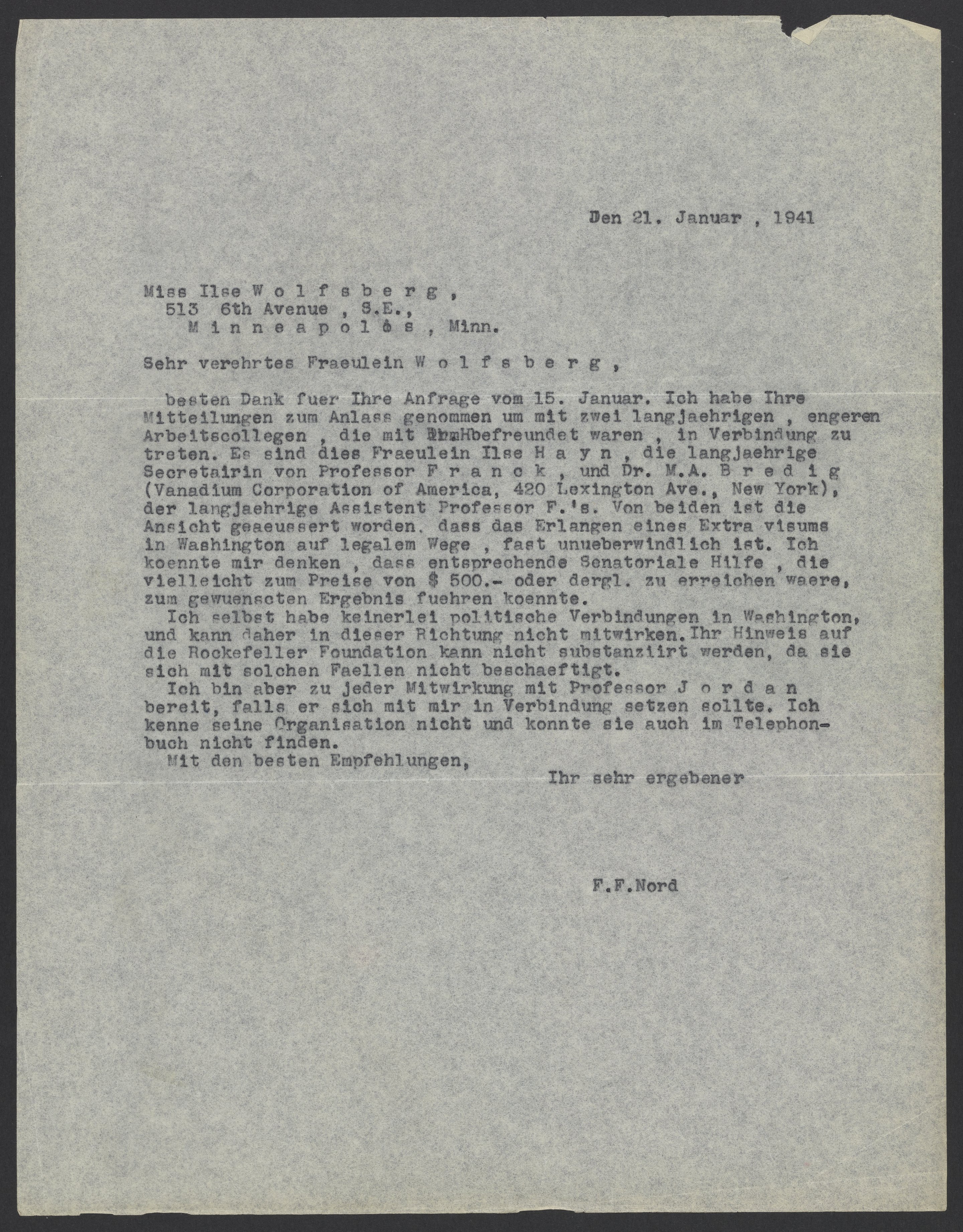 Letter from Friedrich Franz Nord to Ilse Wolfsberg, January 21, 1941