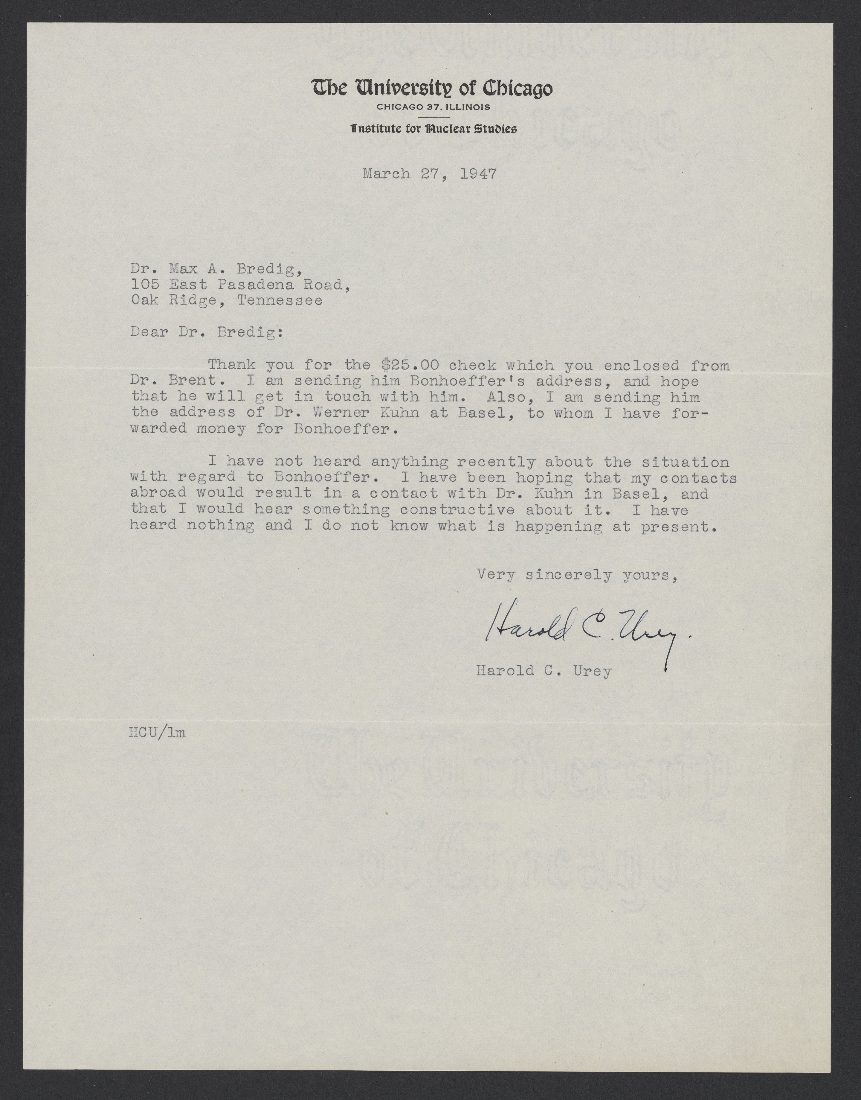 Harold C. Urey (1893-1981) thanks Max Bredig (1902-1977) for forwarding $25.00 to the medical fund of Karl-Friedrich Bonhoeffer (1899-1957). Urey has no news regarding the current status of Bonhoeffer's health.