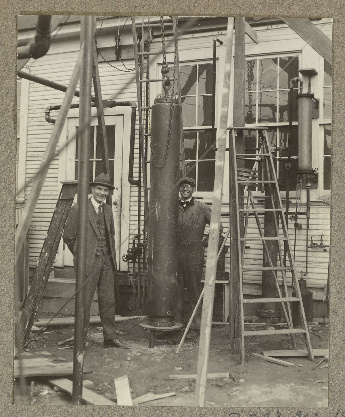 Small JPG1200 x 1448px — 352 KBFull-sized JPG1560 x 1882px — 536 KBOriginal fileTIFF — 1560 x 1882px — 8.5 MBTwo views of assorted apparatus at the Fixed Nitrogen Research Laboratory's Urea Plant. Urea is a water-soluble powder form of carbonic acid frequently used as a fertilizer and feed supplement. The individuals present in the photograph are identified, from left to right, as Mr. Krase, Mr. Weston, and Mr. Gaddy.