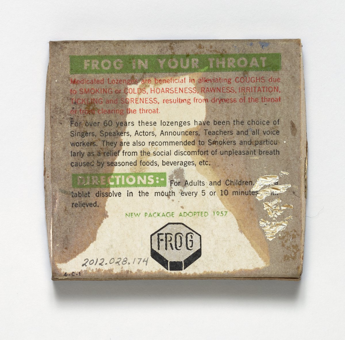 Small JPG1200 x 1182px — 265 KBFull-sized JPG2512 x 2474px — 963 KBOriginal fileTIFF — 2512 x 2474px — 17.8 MBPackage states the "Medicated lozenges are beneficial in alleviating coughs due to smoking or colds, hoarseness, rawness, irritation, tickling and soreness, resulting from dryness of the through or from clearing the throat." It also mentions how the lozenges have been used by singers, speakers, actors, announcers, teachers and all voice workers for over sixty years. Other uses include "...the social discomfort of unpleasant breath caused by seasoned foods, beverages, etc." Packaging consists of a small cardboard box depicting a frog holding an octagonal tablet that reads "frog."