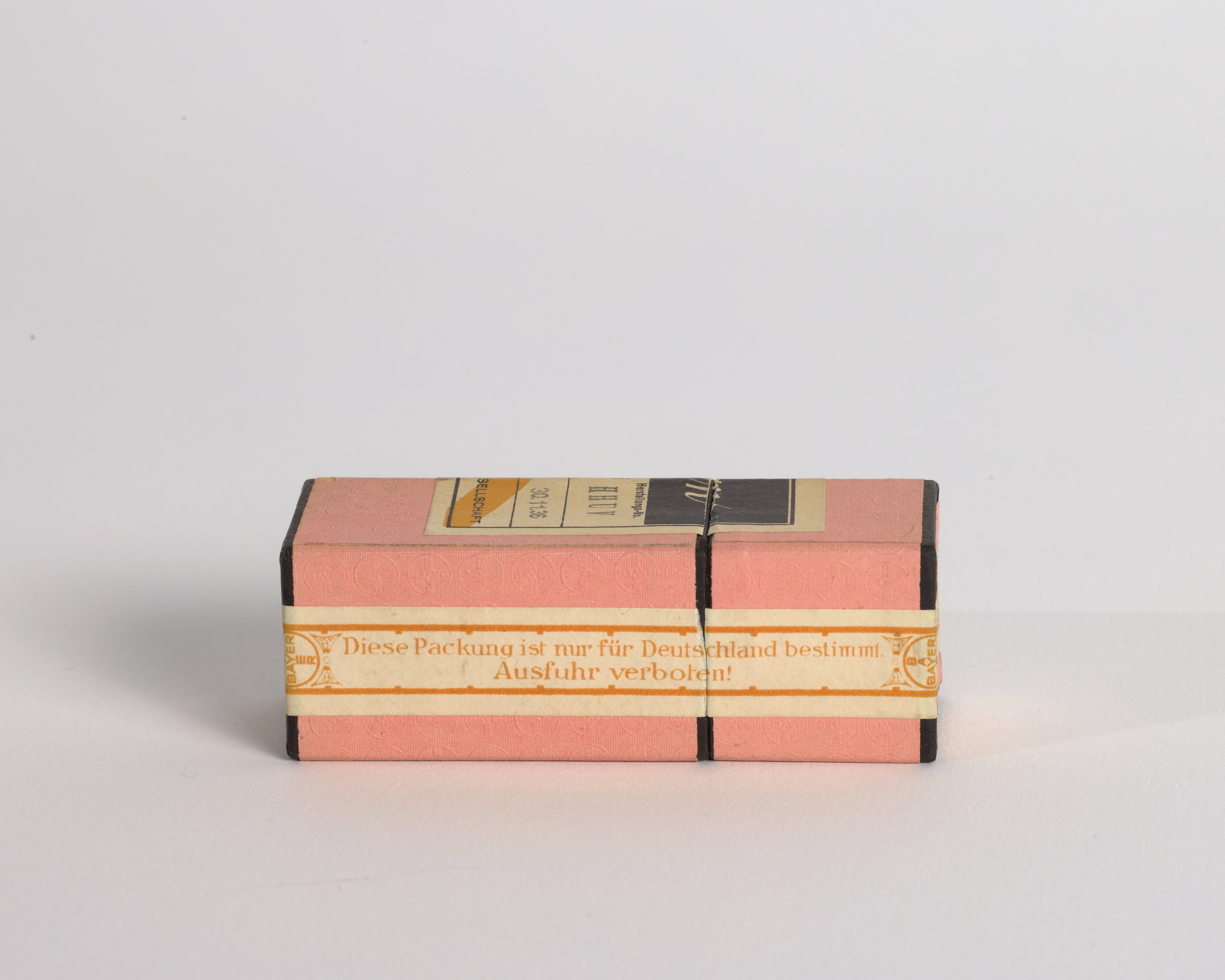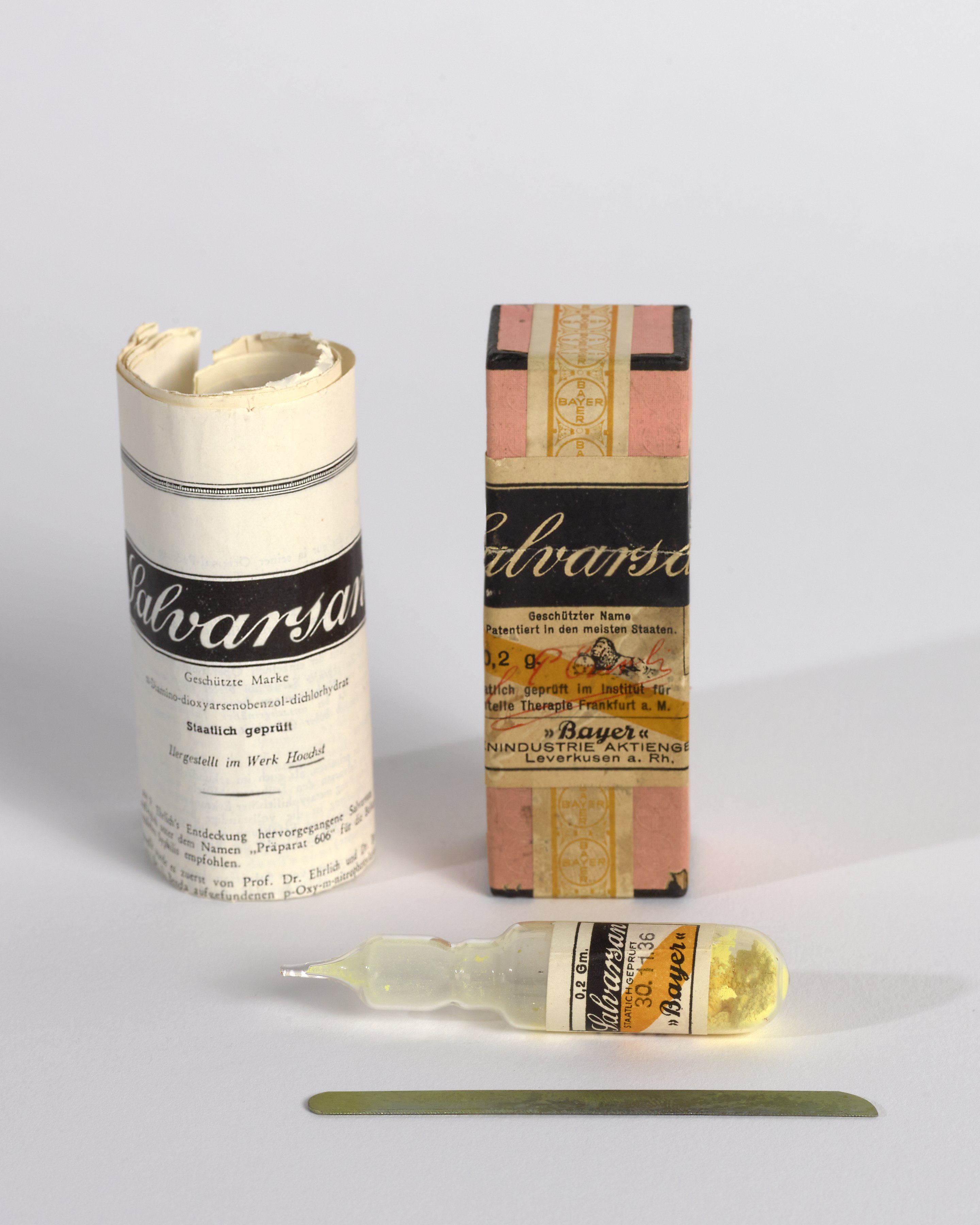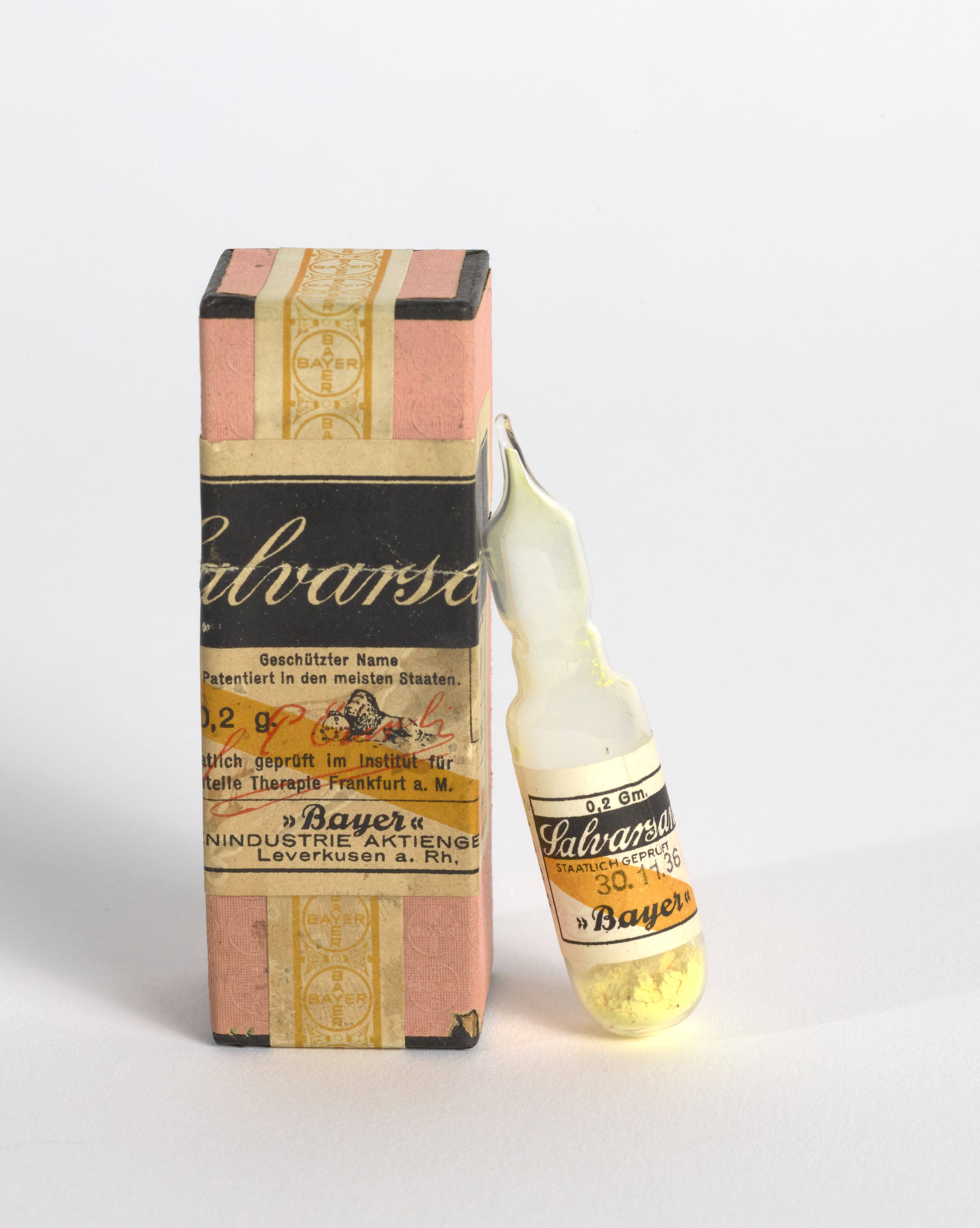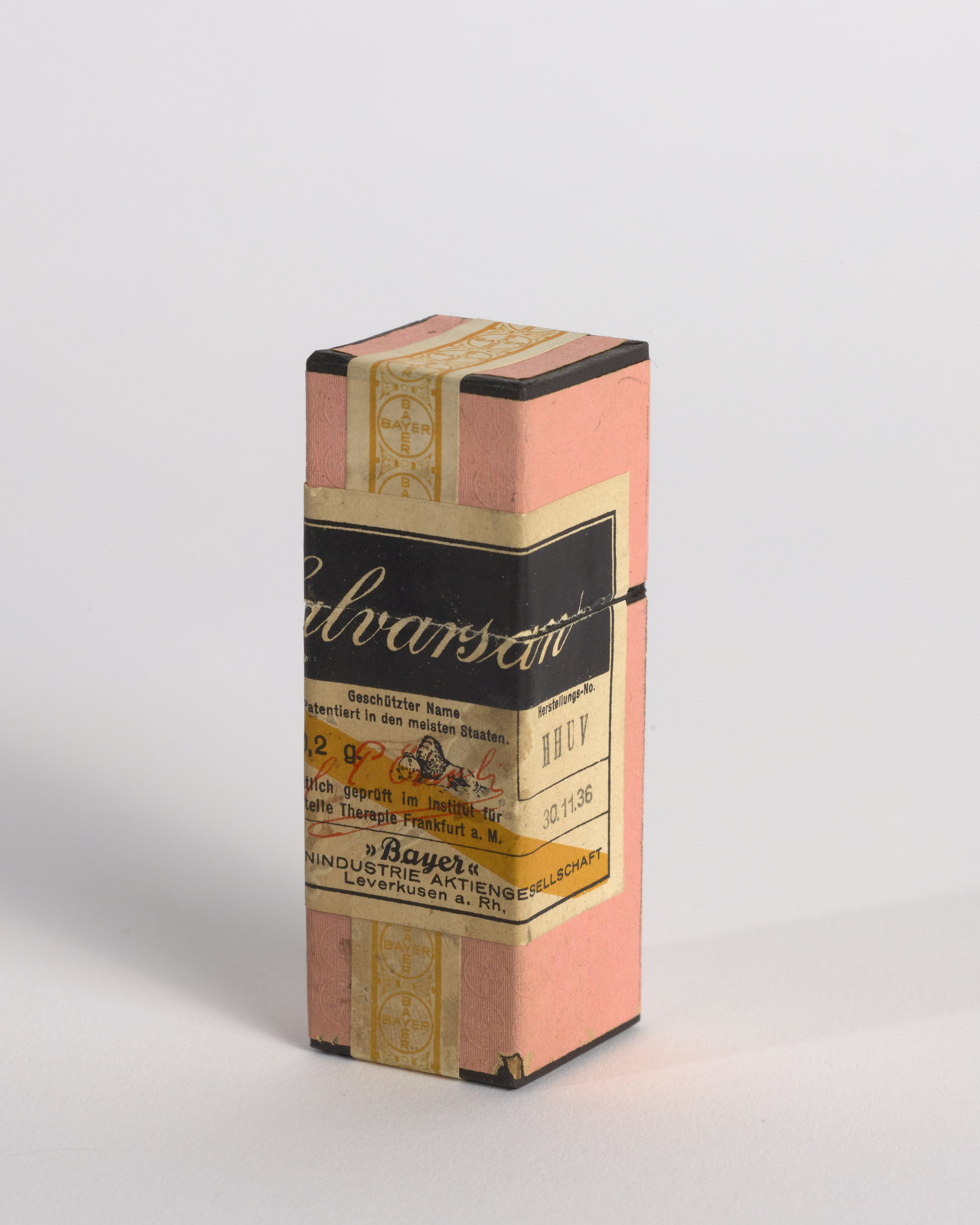 Small JPG1200 x 1500px — 150 KBLarge JPG2880 x 3600px — 704 KBFull-sized JPG6870 x 8588px — 3.5 MBOriginal fileTIFF — 6870 x 8588px — 338 MBSmall pink cardboard box with paper label that reads "Salvarsan" in cursive letters in white text on black background. Inside the box is a small glass vial containing a medicine sample, a small blade, and an information pamphlet written in German.