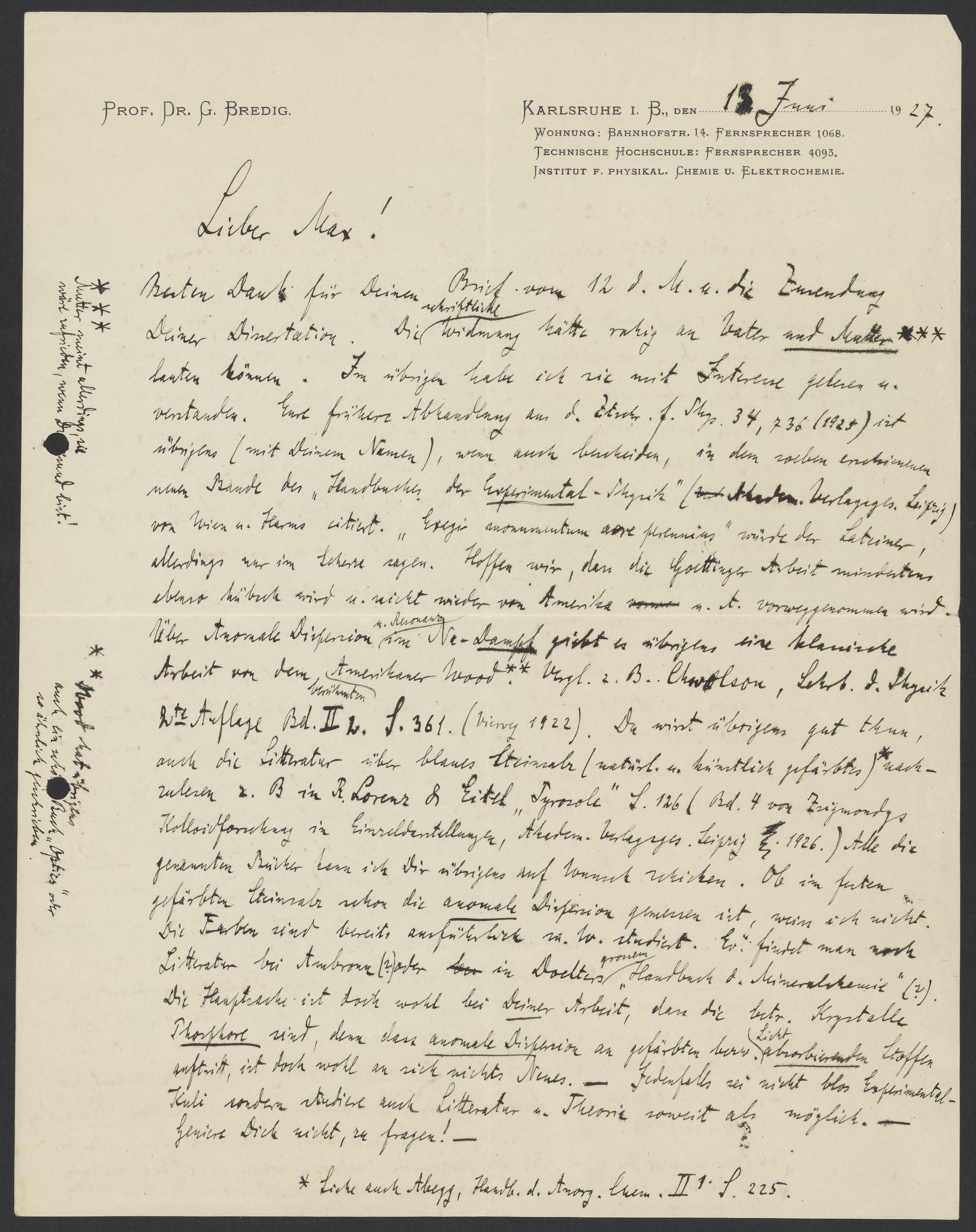 Letter from Georg Bredig to Max Bredig, June 13, 1927