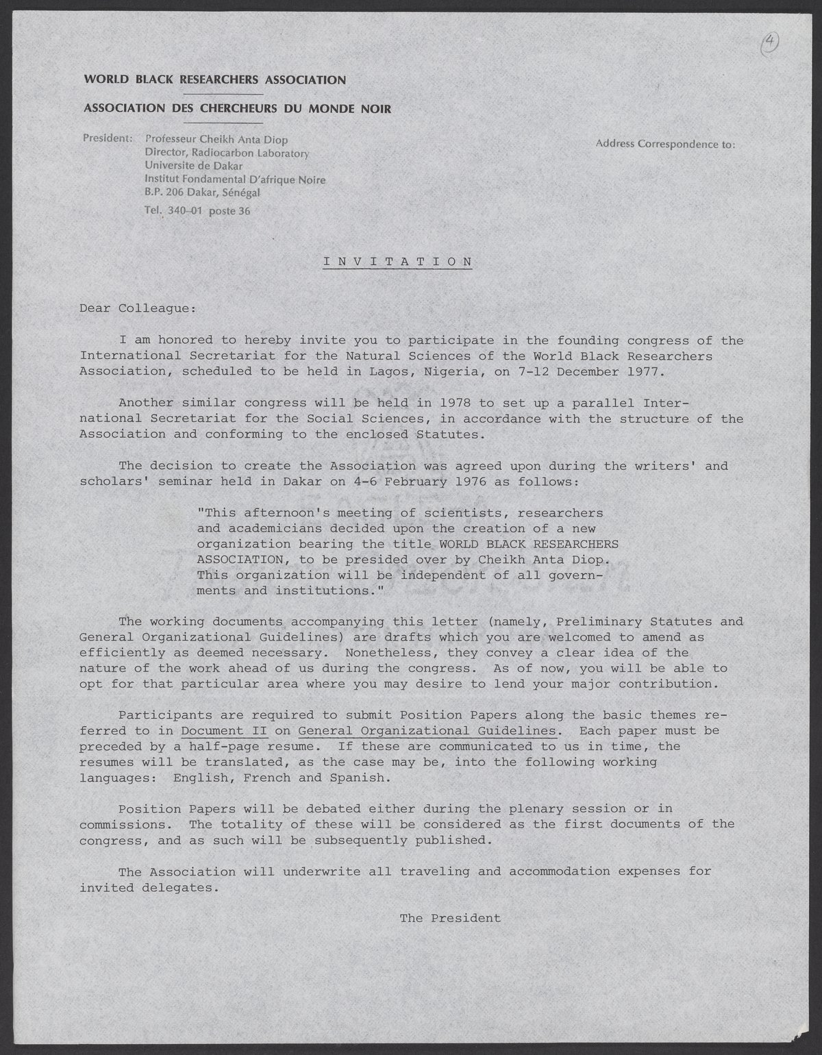 Invitation to the founding congress of the International Secretariat for the Natural Sciences of the World Black Researchers Association. Anthropologist and physicist Cheikh Anta Diop (1923-1986) wrote the invitation, on behalf of the World Black Researchers Association (WBRA).