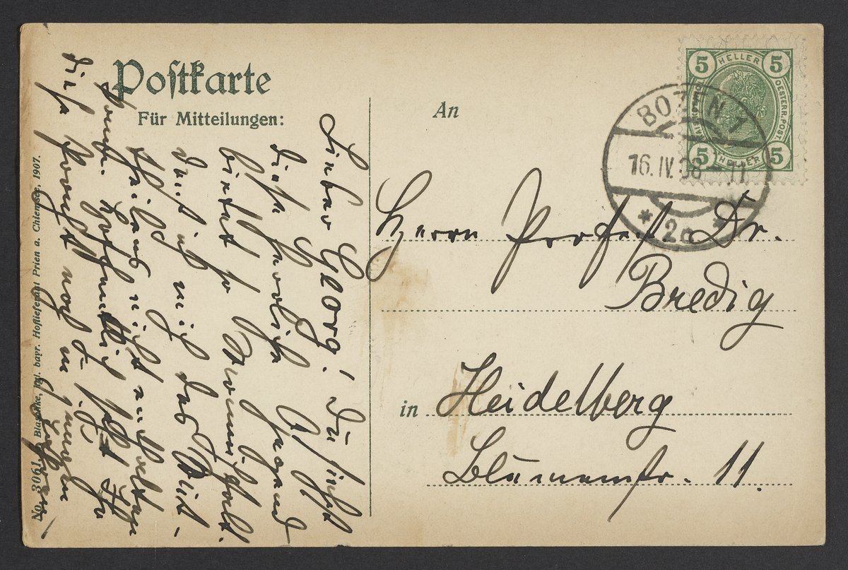 Small JPG1200 x 802px — 298 KBLarge JPG2880 x 1924px — 1.6 MBFull-sized JPG3506 x 2342px — 2.2 MBOriginal fileTIFF — 3506 x 2342px — 23.5 MBPostcard from an unidentified sender to Georg Bredig (1868-1944). The postcard features an image of earth pyramids near the Oberbozen.