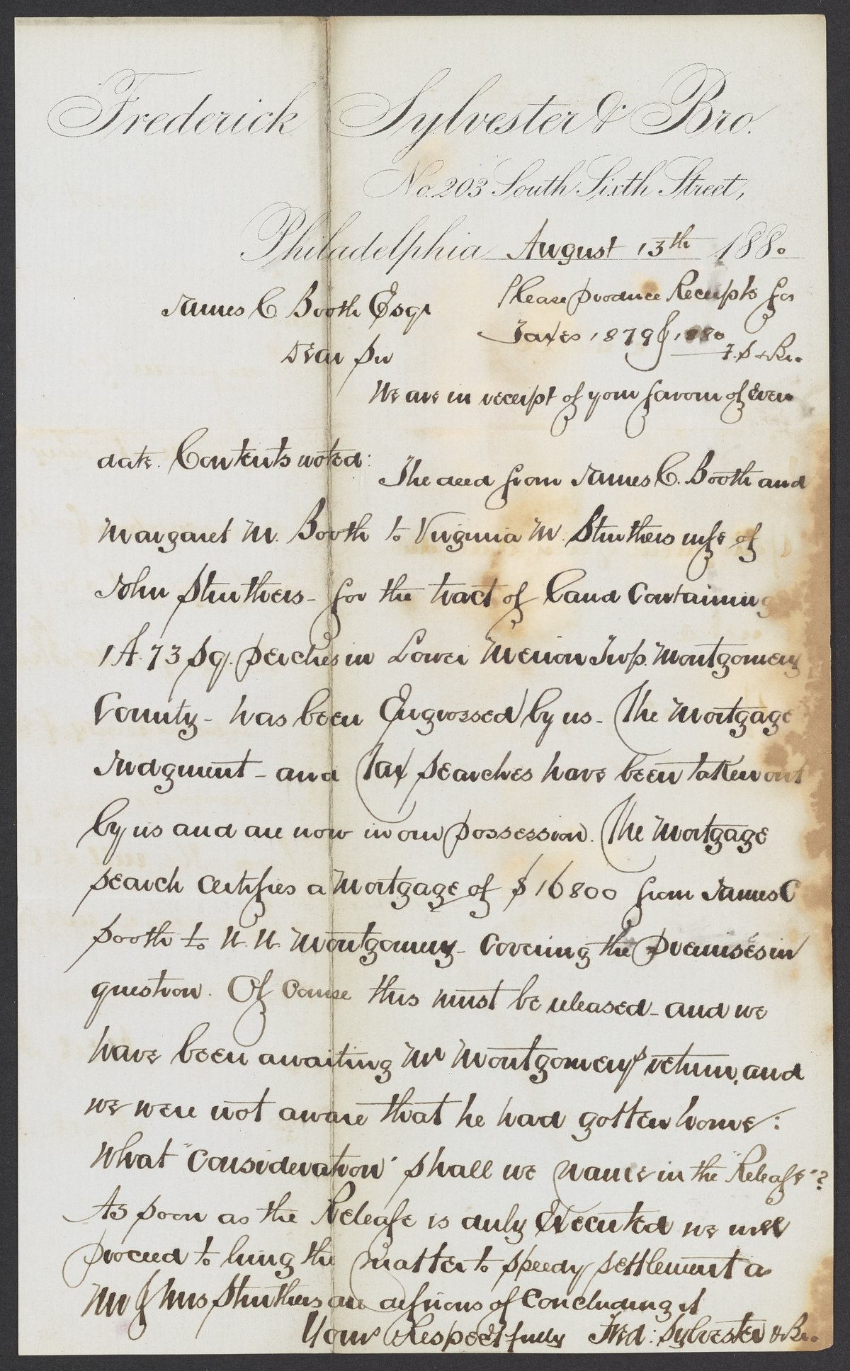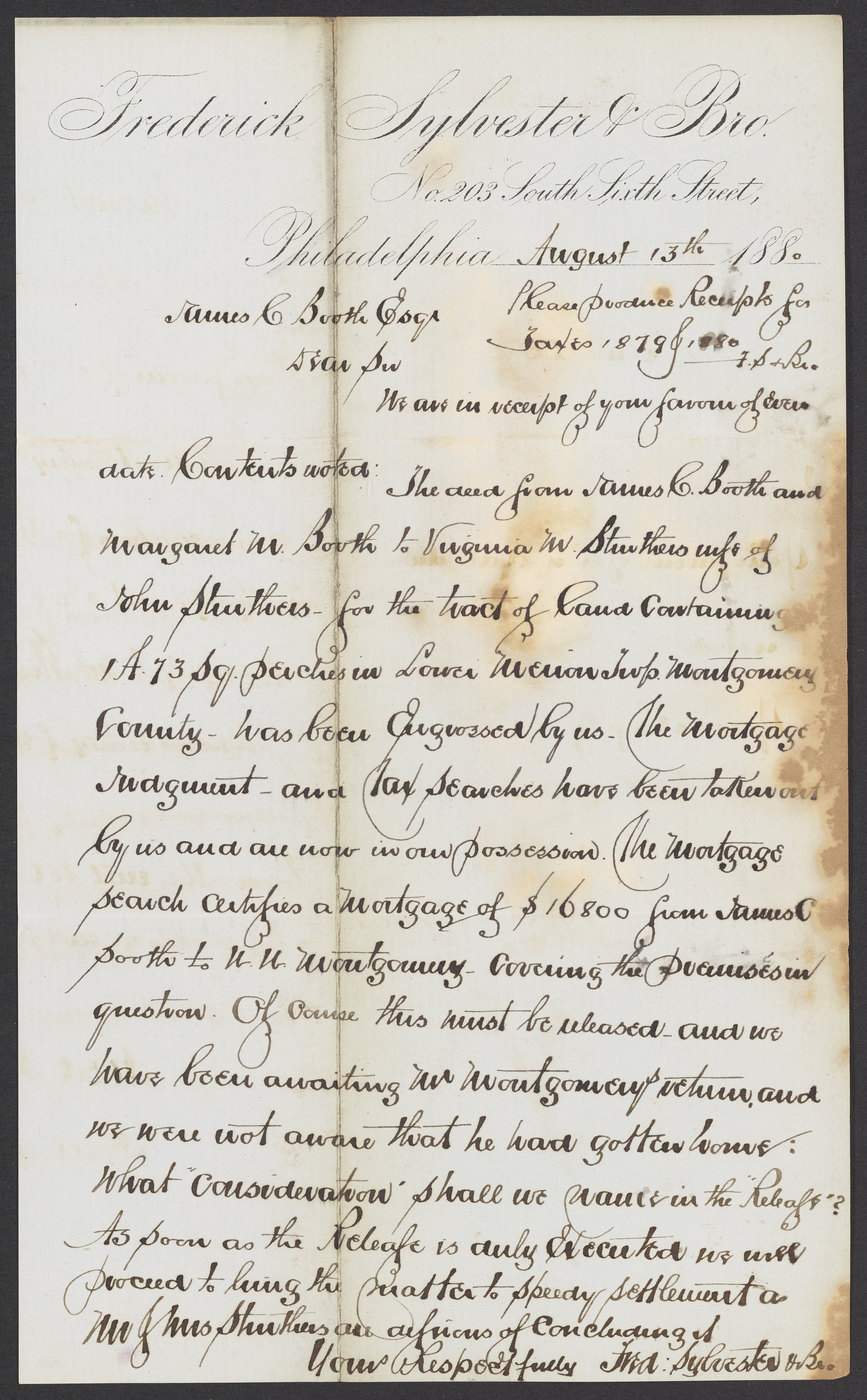 Letter from Frederick Sylvester & Brother to James Curtis Booth, August 13, 1880