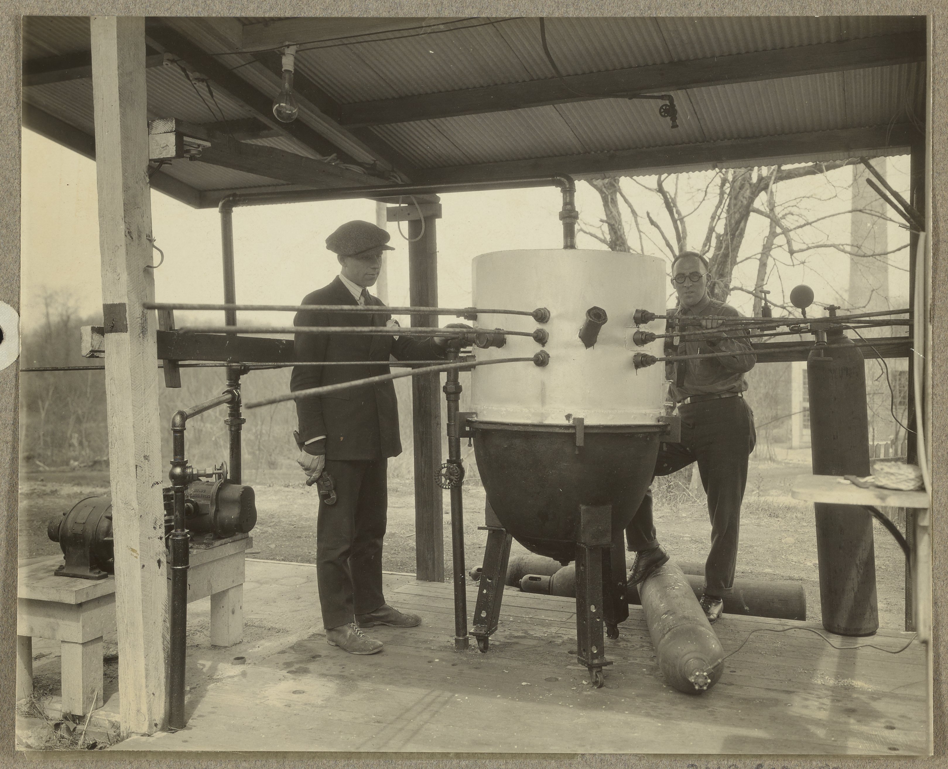 “C.M. Sullivan and P.N. Tierney with Iron Burner Used for Ammonia Catalyst Preparation,” April 1926. Travis P. Hignett Collection of Fixed Nitrogen Research Laboratory Photographs, Box 1. Science History Institute. Philadelphia. https://digital.sciencehistory.org/works/pc289j10v.