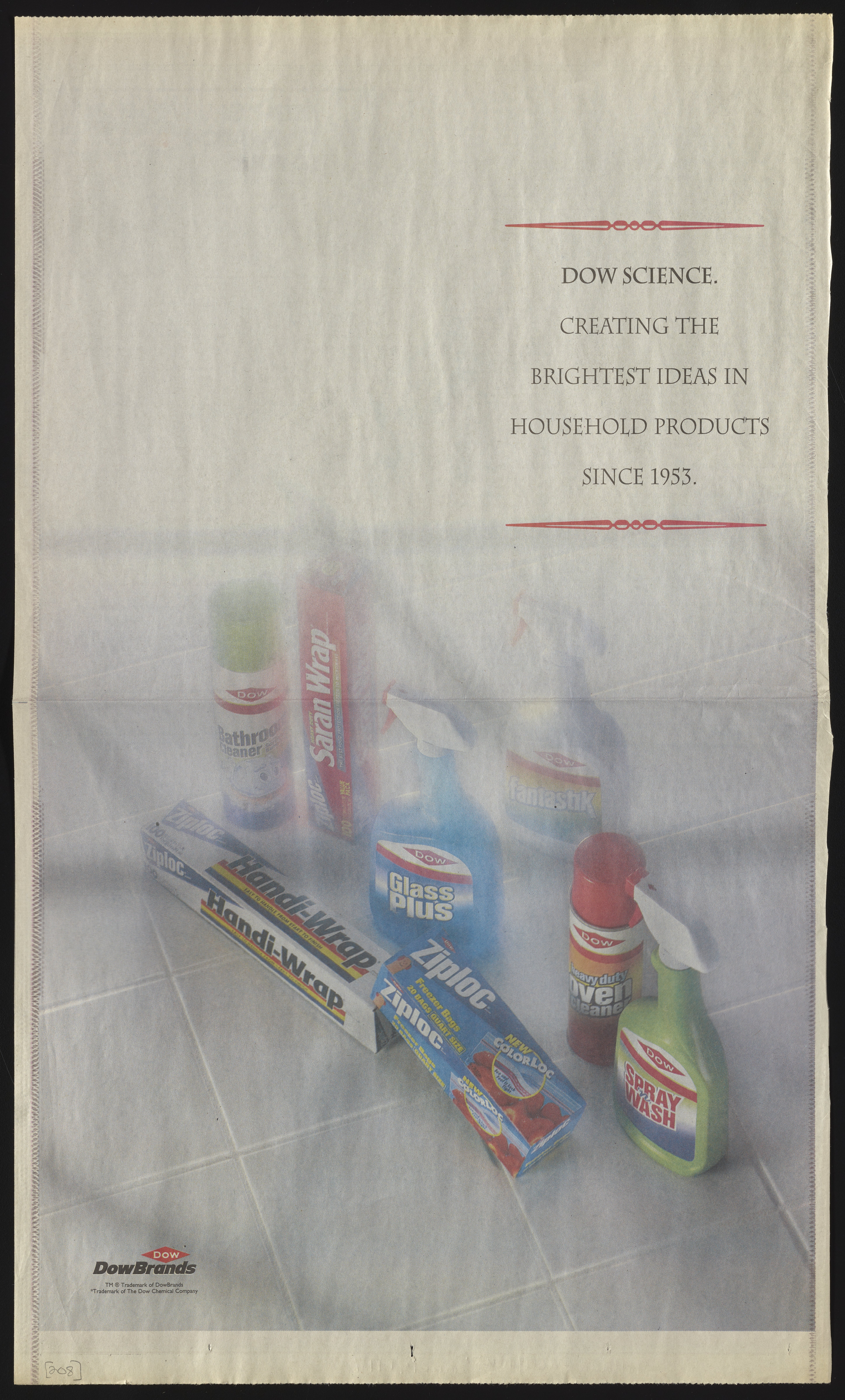Dow Chemical Company. “Dow Science. Creating the Brightest Ideas in Household Products Since 1953.,” May 18, 1997. Advertisements from the Dow Chemical Historical Collection, Box 7. Science History Institute. Philadelphia. https://digital.sciencehistory.org/works/pg15bf62v.
