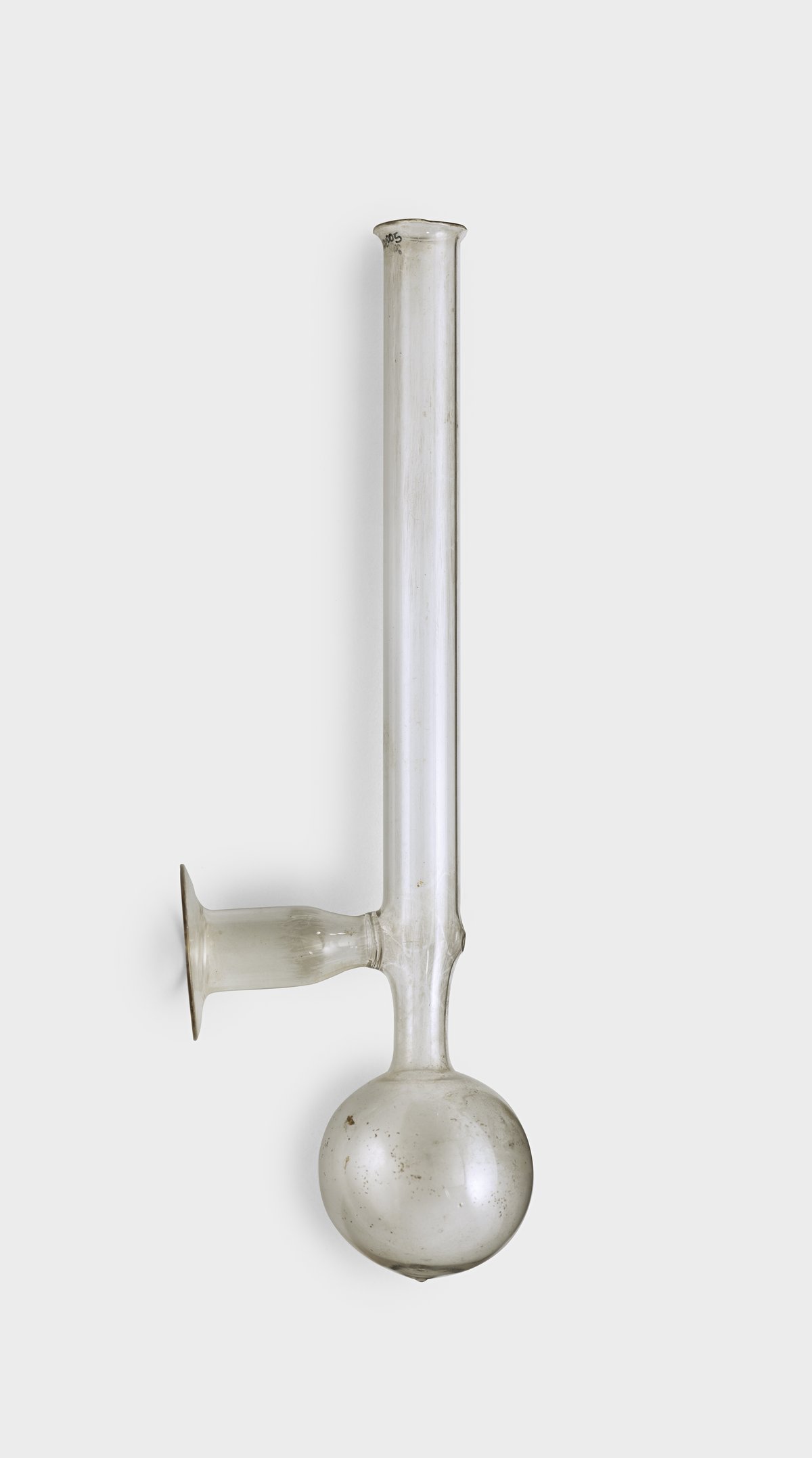 Long stem, round bottom flask with custom flange. Needle-size hole on opposite side of flange allows for release of pressure.