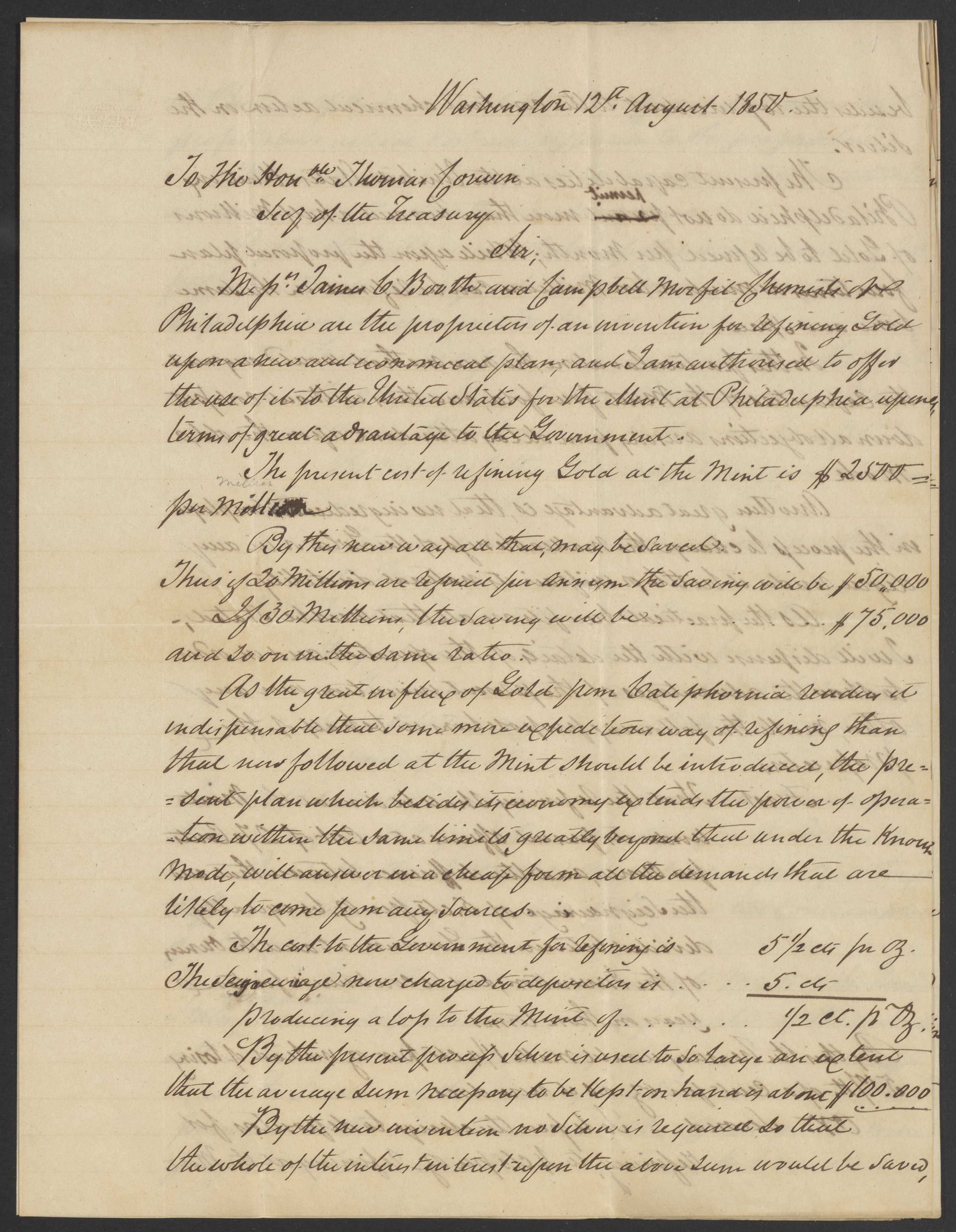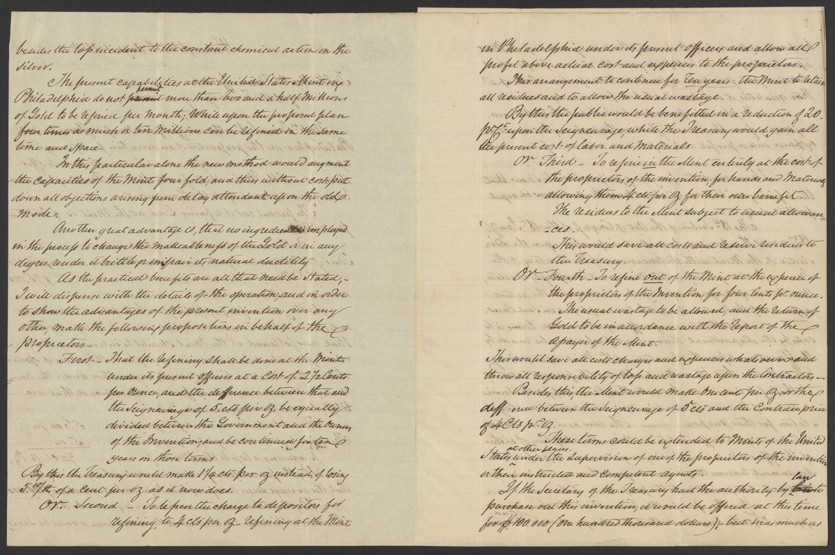 Small JPG1200 x 1547px — 340 KBLarge JPG2880 x 3713px — 1.4 MBFull-sized JPG3415 x 4403px — 1.8 MBOriginal fileTIFF — 3415 x 4403px — 43.1 MBHenry M. Morfit (1793-1865) sends James Curtis Booth (1810-1888) a copy of a long letter sent to Thomas Corwin (1794-1865), Secretary of the Treasury, which outlines the refining process developed by Booth and Morfit's son, Campbell Morfit (1820-1897), and offers it for consideration.
