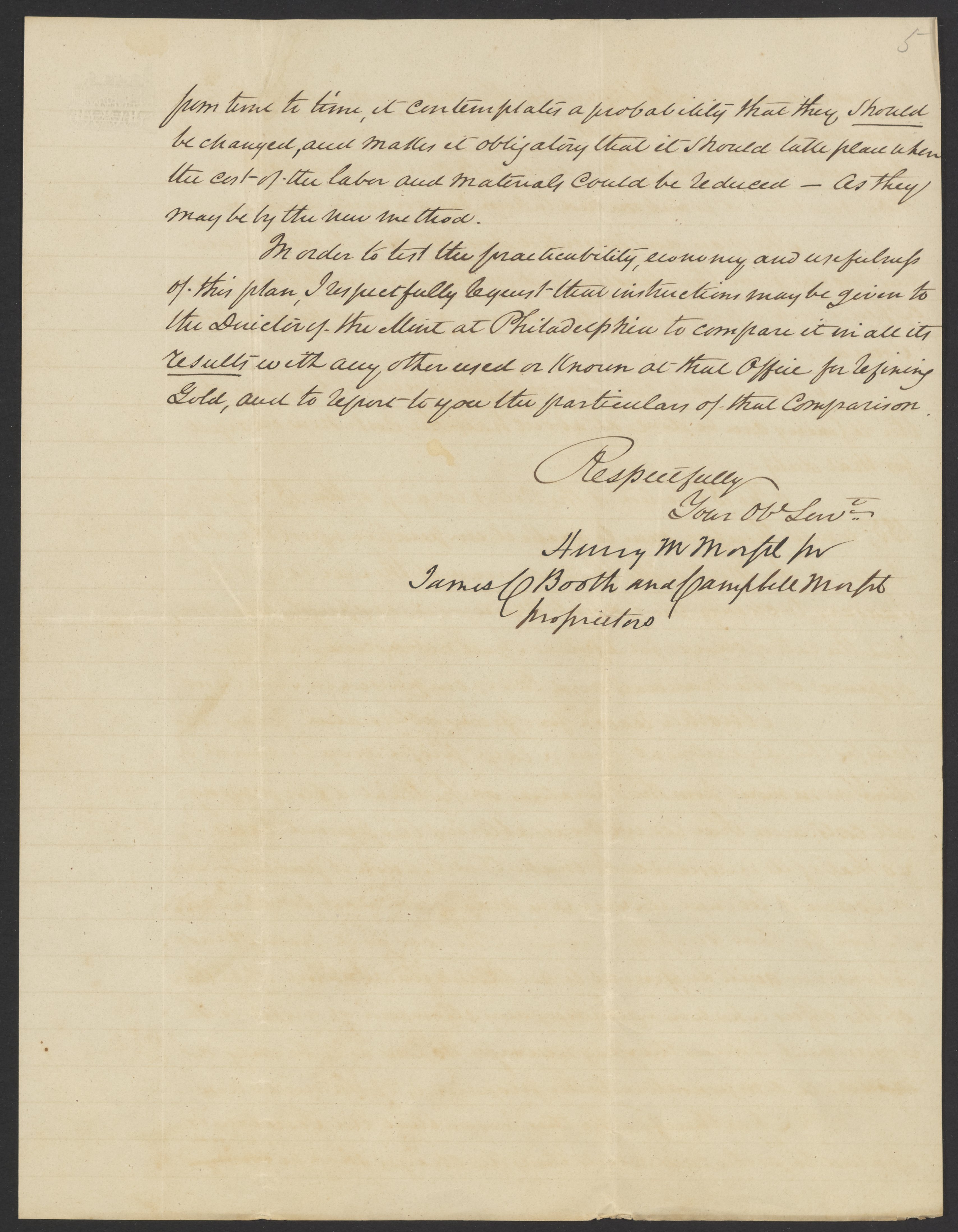 Morfit, a claims lawyer in Washington, D.C. and a political figure in the Andrew Jackson presidential administrations, appears to have served as go-between for his son, Campbell and Booth in their efforts to interest the U.S. Mint in their process for refining gold.
