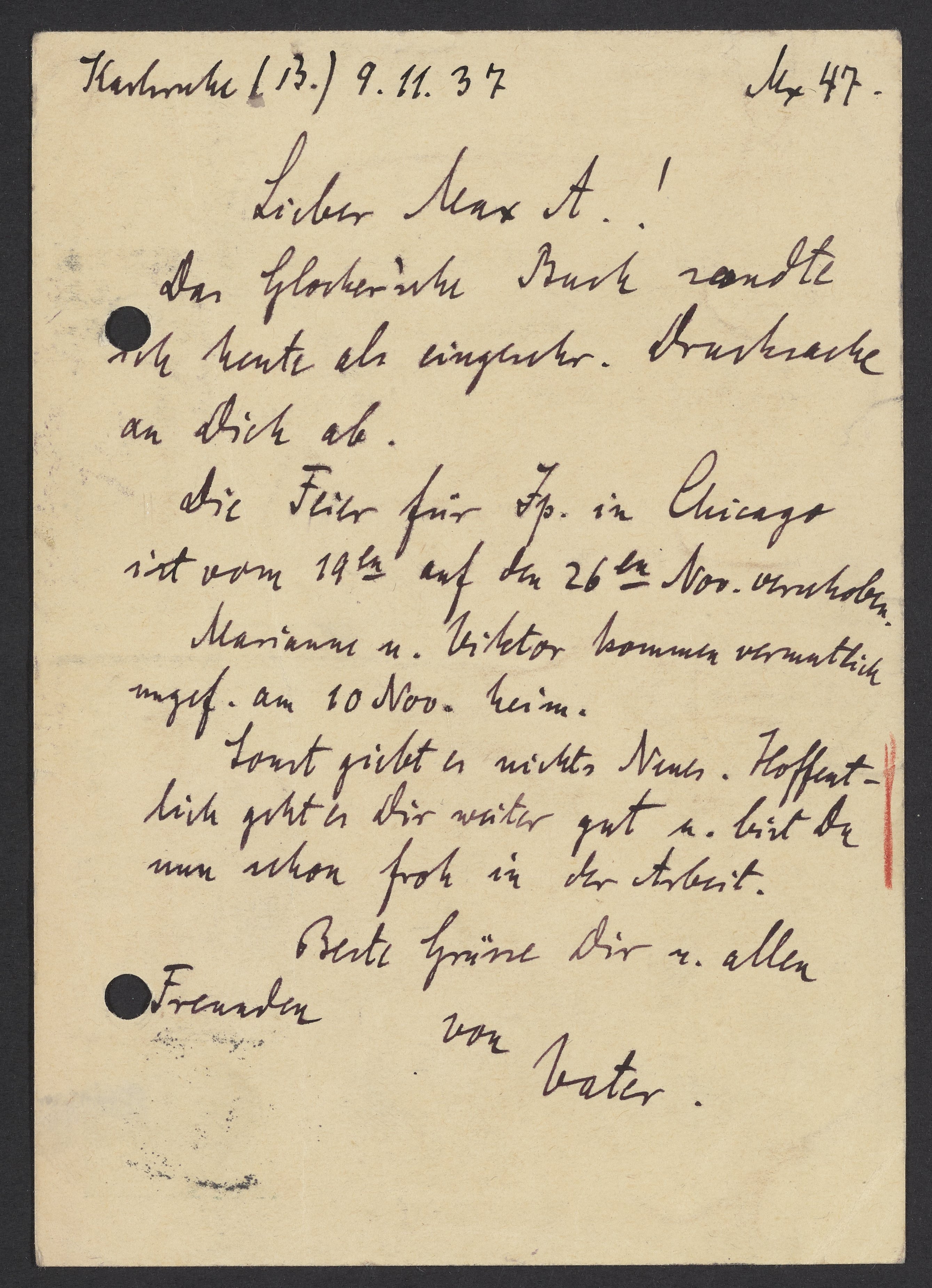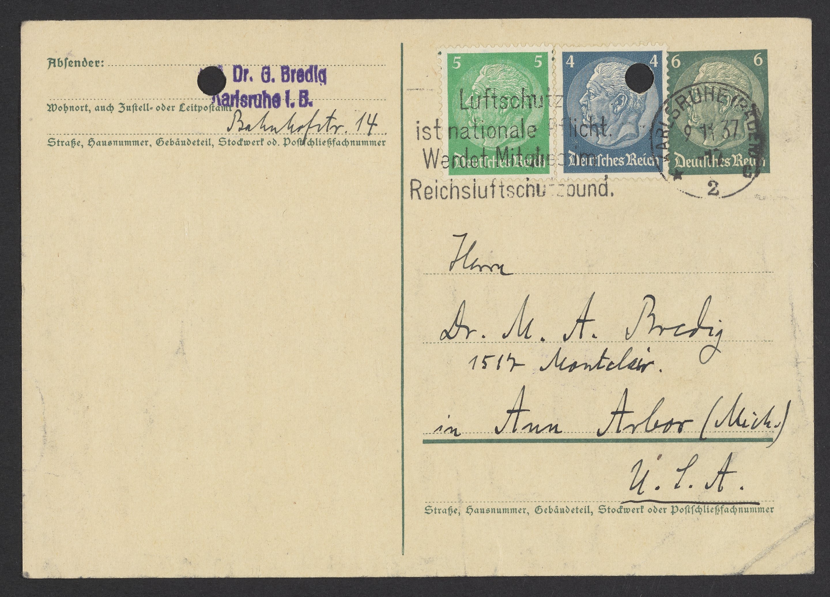 Postcard from Georg Bredig to Max Bredig, November 9, 1937