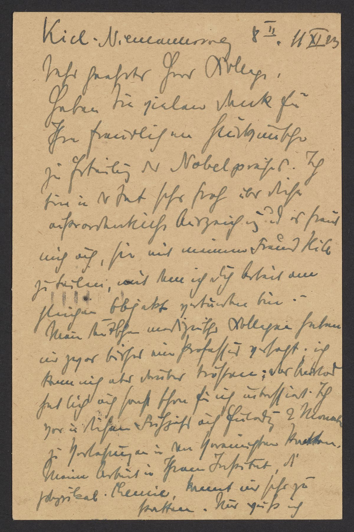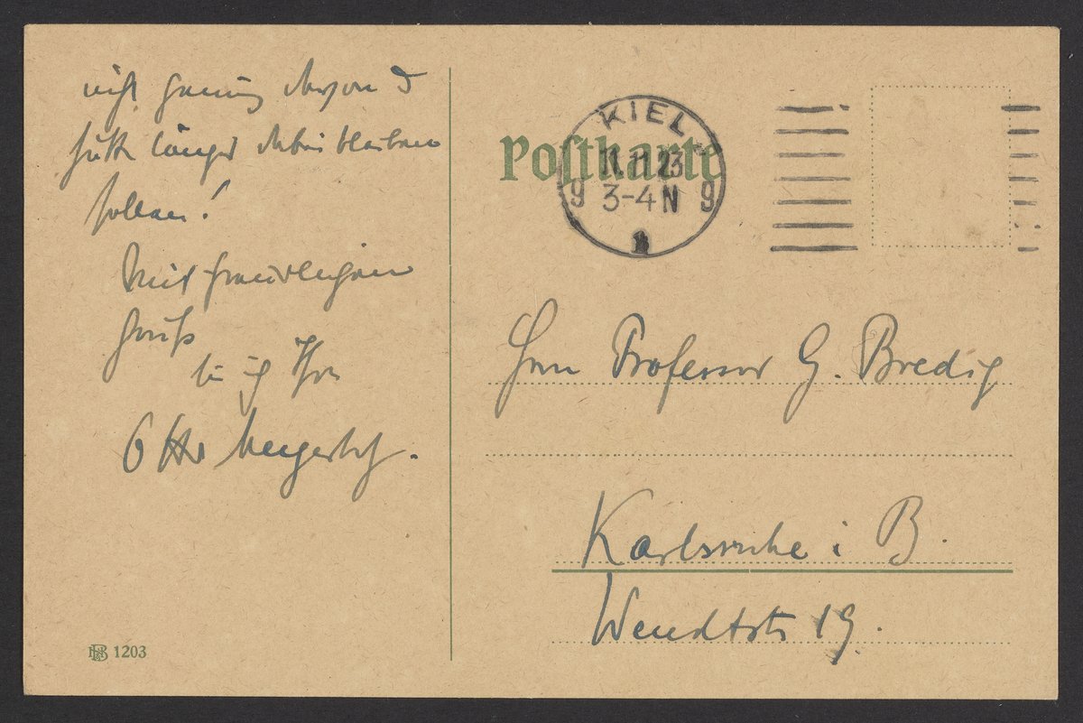 Postcard from Otto Meyerhof to Georg Bredig, November 1923