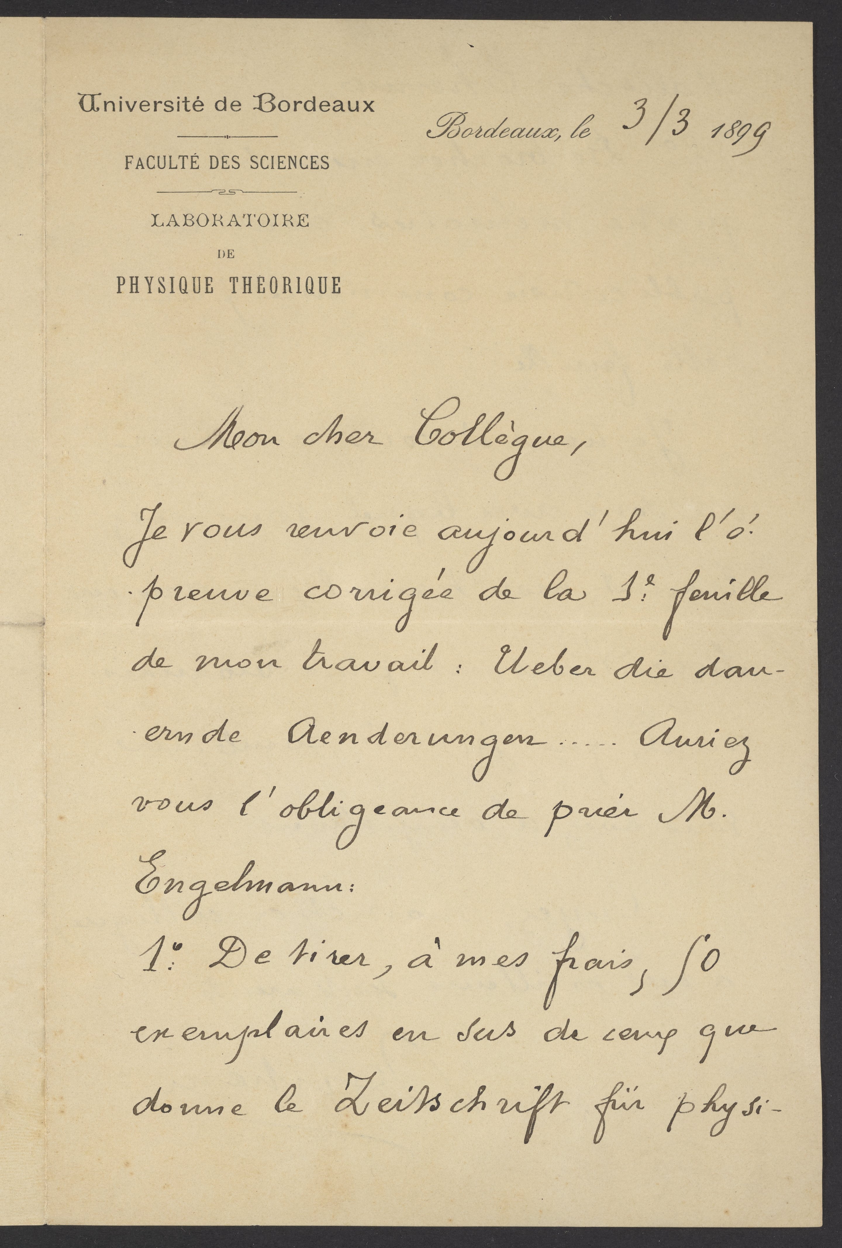 Letter from Pierre Duhem to Georg Bredig, March 1899