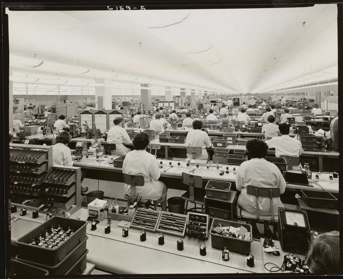 The production room at the Helipot Division of Beckman Instruments, Inc., where mostly women employees assemble potentiometers, dials, and other small devices.
