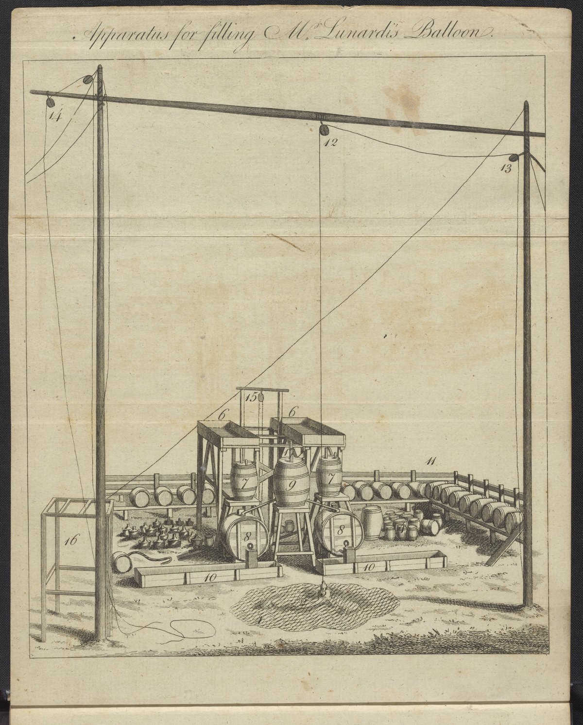 Lunardi, Vincent. “Apparatus for Filling Mr. Lunardi's Balloon.” In An Account of the First Aërial Voyage in England. London, England: John Bell, 1784. https://digital.sciencehistory.org/works/pn89d710t.