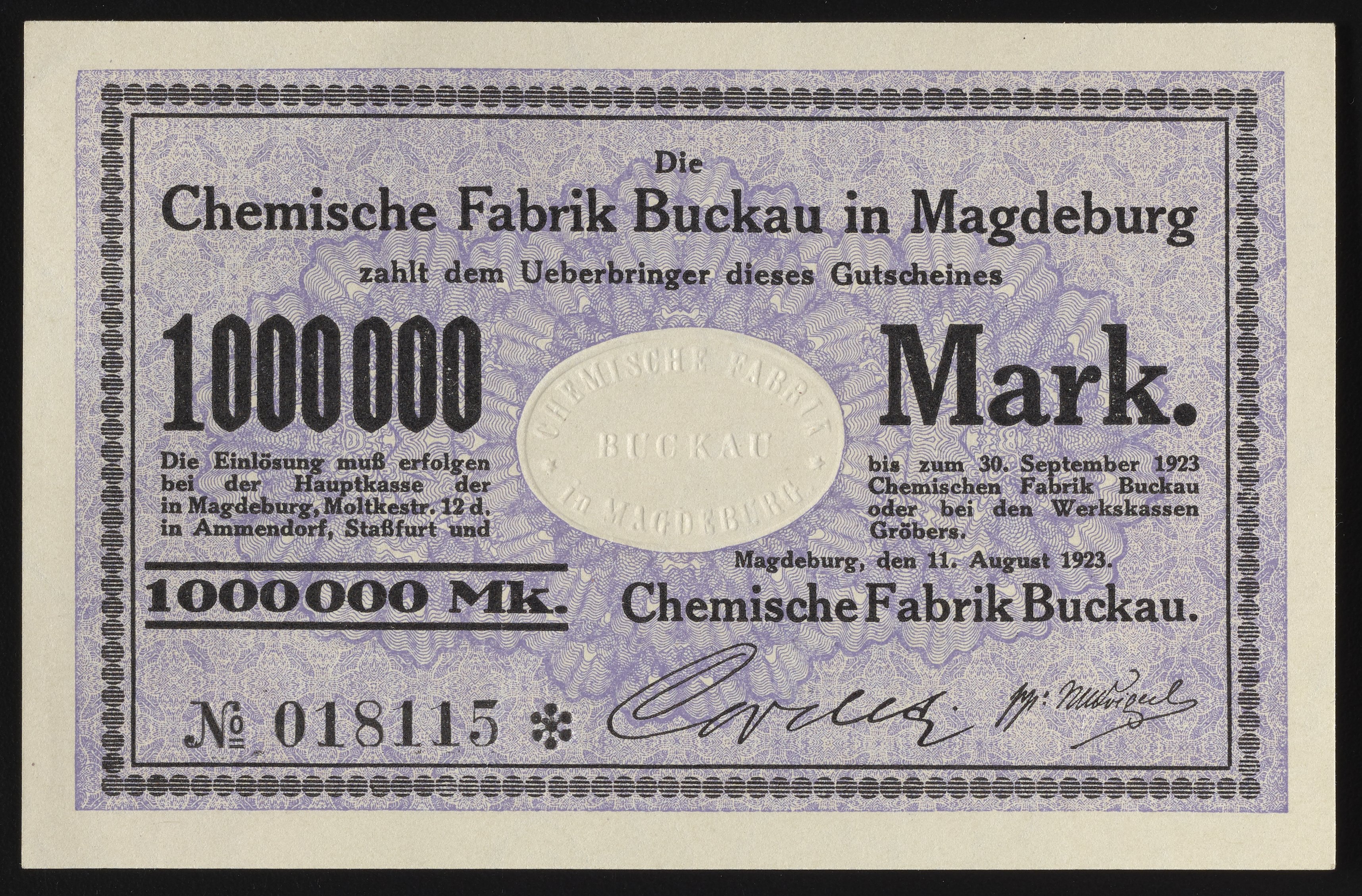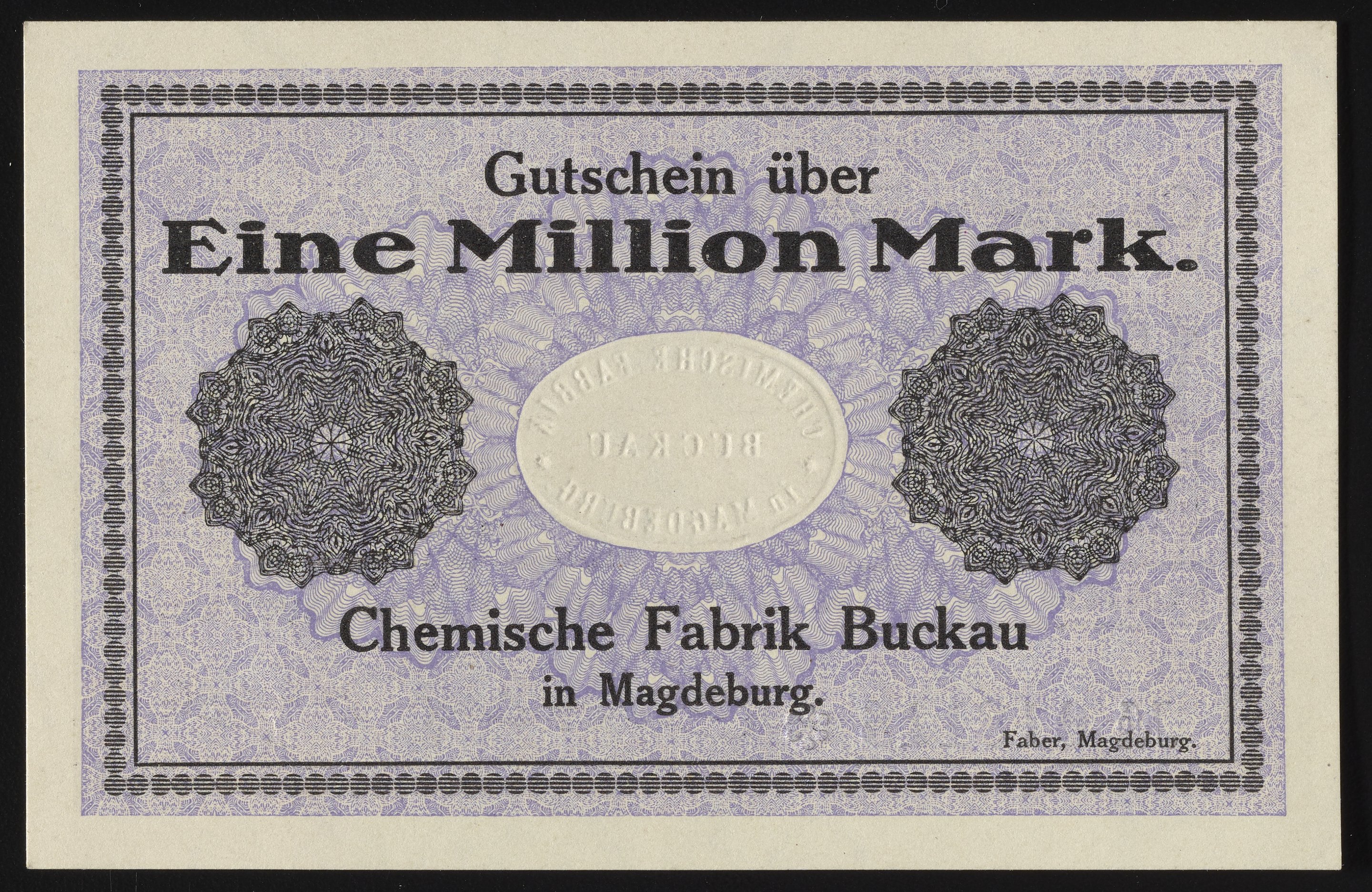 Small JPG1200 x 790px — 309 KBLarge JPG2880 x 1896px — 1.5 MBFull-sized JPG3432 x 2259px — 2.0 MBOriginal fileTIFF — 3432 x 2259px — 22.2 MBThis Eine Million Mark Gutschein, or one million Mark voucher, was issued by Chemische Fabrik Buckau. The center includes an embossed company seal. Paper features a watermark design.