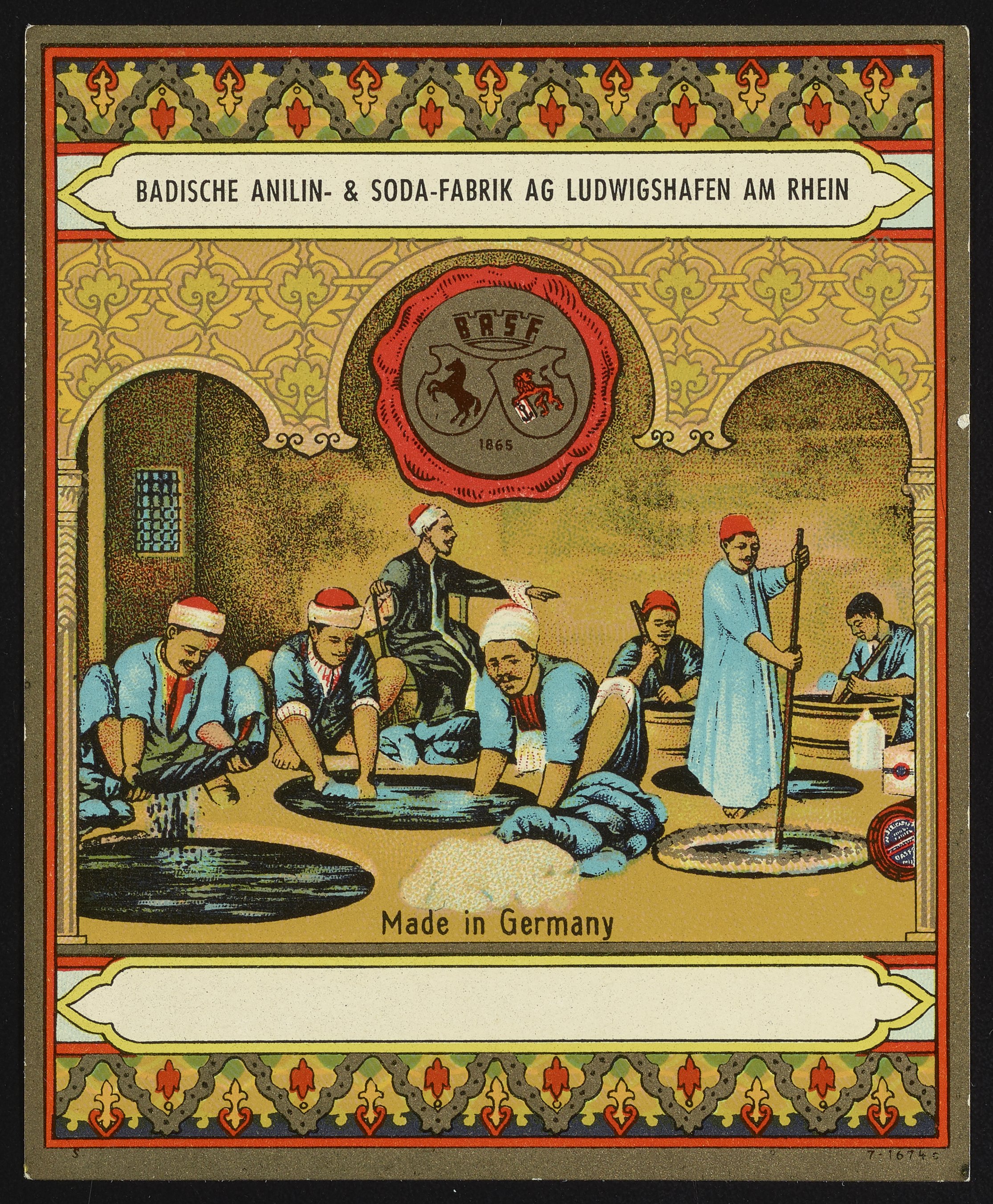 “Badische Anilin & Soda-Fabrik Dye Label with Indigo Dye Workers.” Dye transfer prints. Ludwigshafen am Rhein, Germany: Badische Anilin- & Soda-Fabrik, circa 1900. Science History Institute. Philadelphia. https://digital.sciencehistory.org/works/pn89d780h.