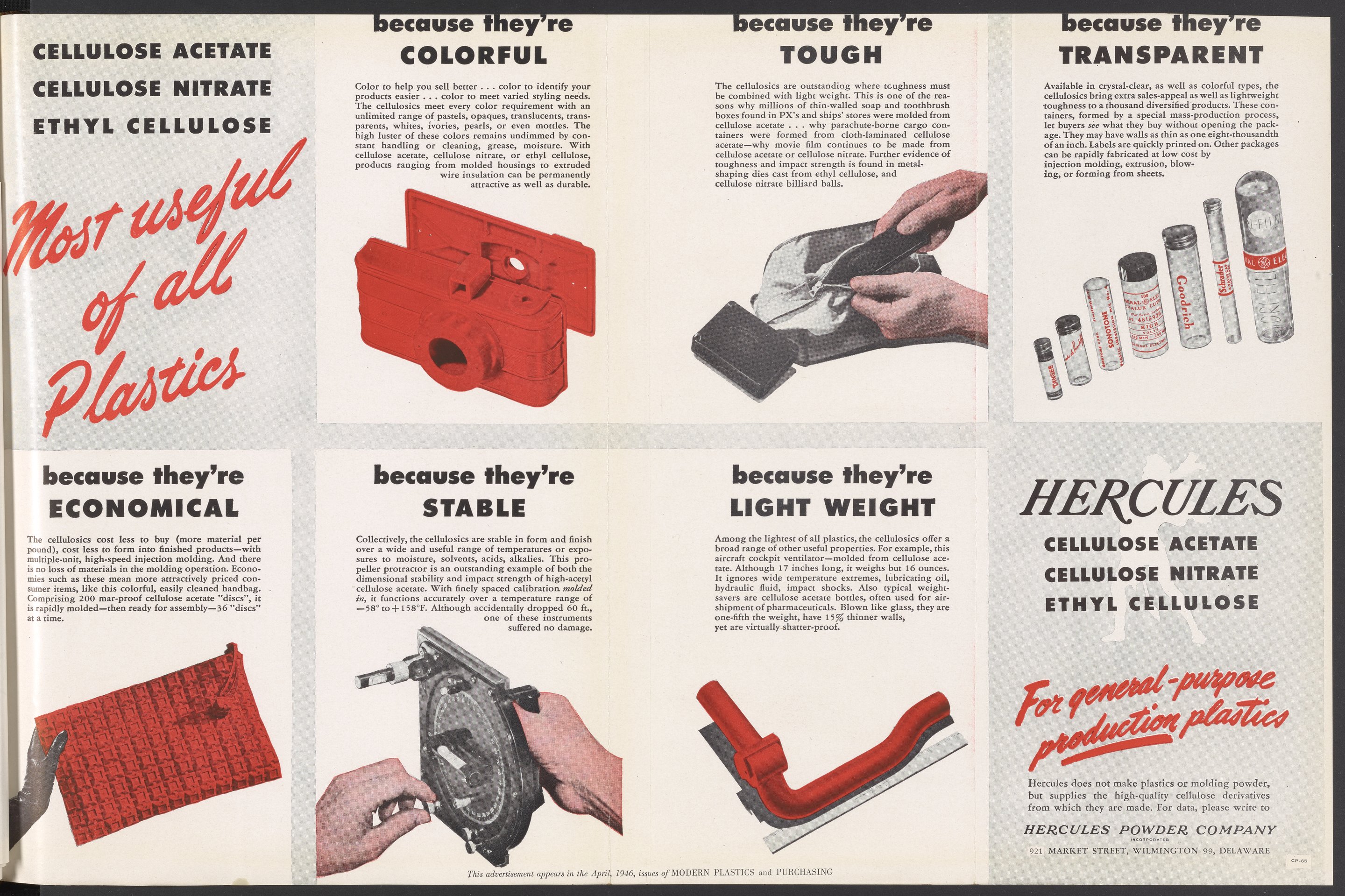Hercules Incorporated. “Most Useful of All Plastics.” 1946 Hercules Advertisements, 1946. Records of Hercules Incorporated, Volume 1946. Science History Institute. Philadelphia. https://digital.sciencehistory.org/works/pol6et0.