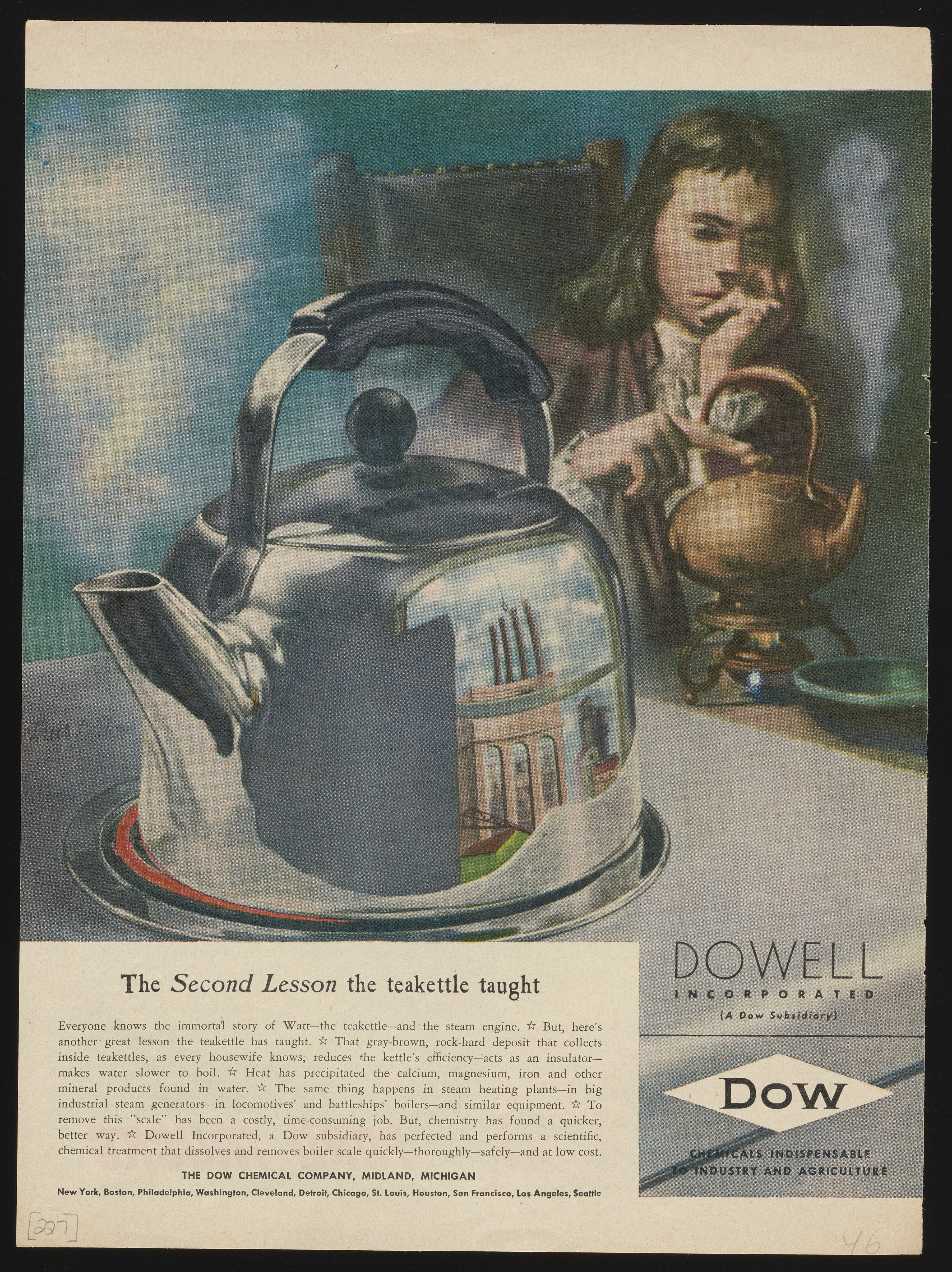 Dow Chemical Company. “The Second Lesson the Teakettle Taught Us,” 1946. Advertisements from the Dow Chemical Historical Collection, Box 7. Science History Institute. Philadelphia. https://digital.sciencehistory.org/works/pr76f4234.