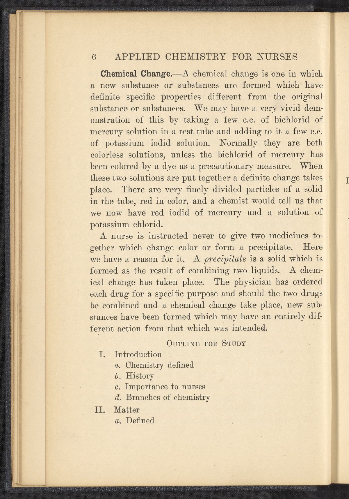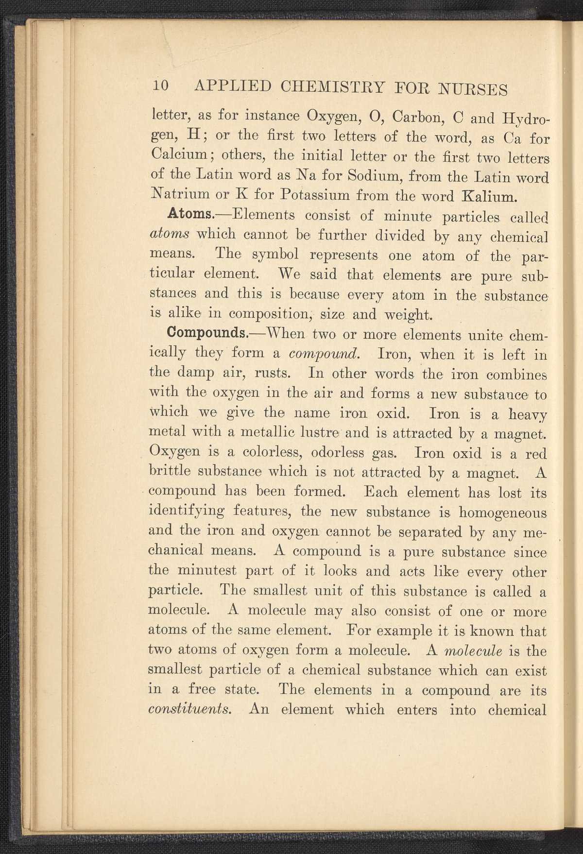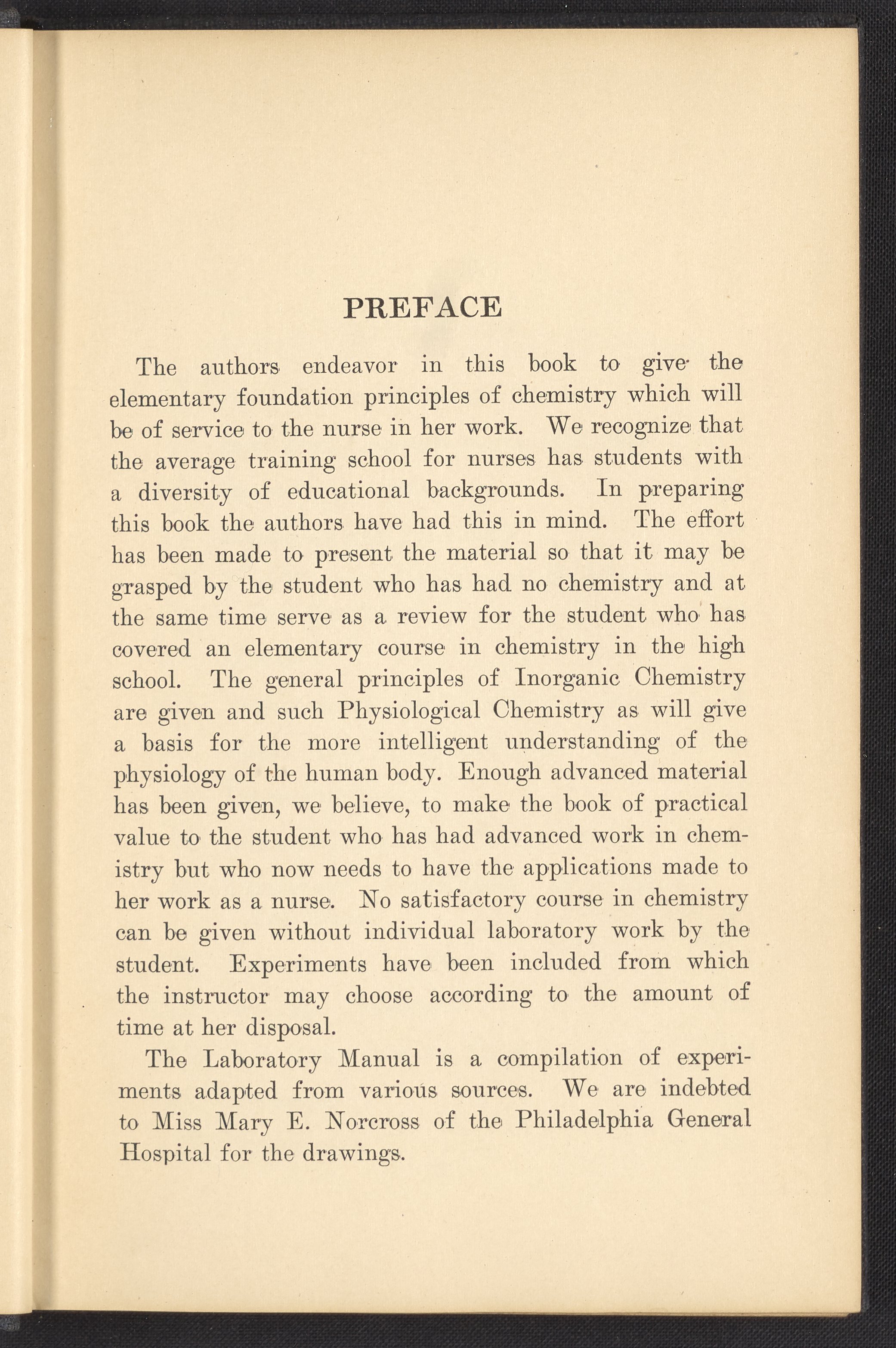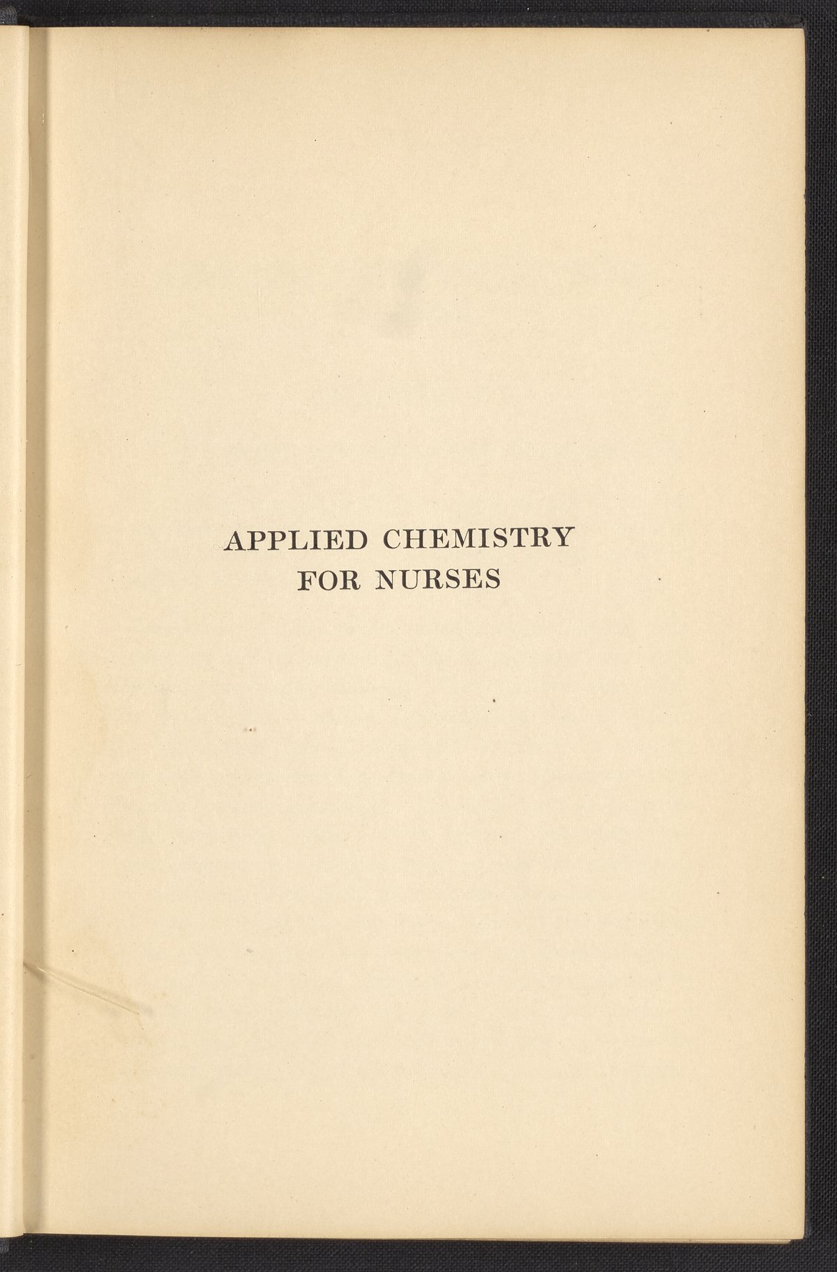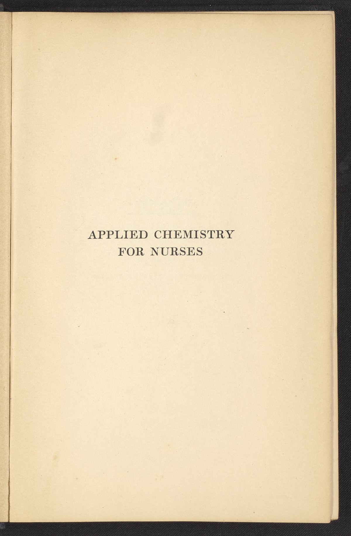 Small JPG1200 x 1657px — 591 KBFull-sized JPG2320 x 3204px — 1.8 MBOriginal fileTIFF — 2320 x 3204px — 21.3 MBPublished in 1926, this textbook of chemistry was intended to instill "the elementary foundation principles of chemistry which will be of service to the nurse in her work." The work contains chapters that discuss general principles of chemistry as well as chapters specialized to chemistry as it applies to the human body such as digestion, metabolism, blood, and excretions. The volume is digitized in its entirety.