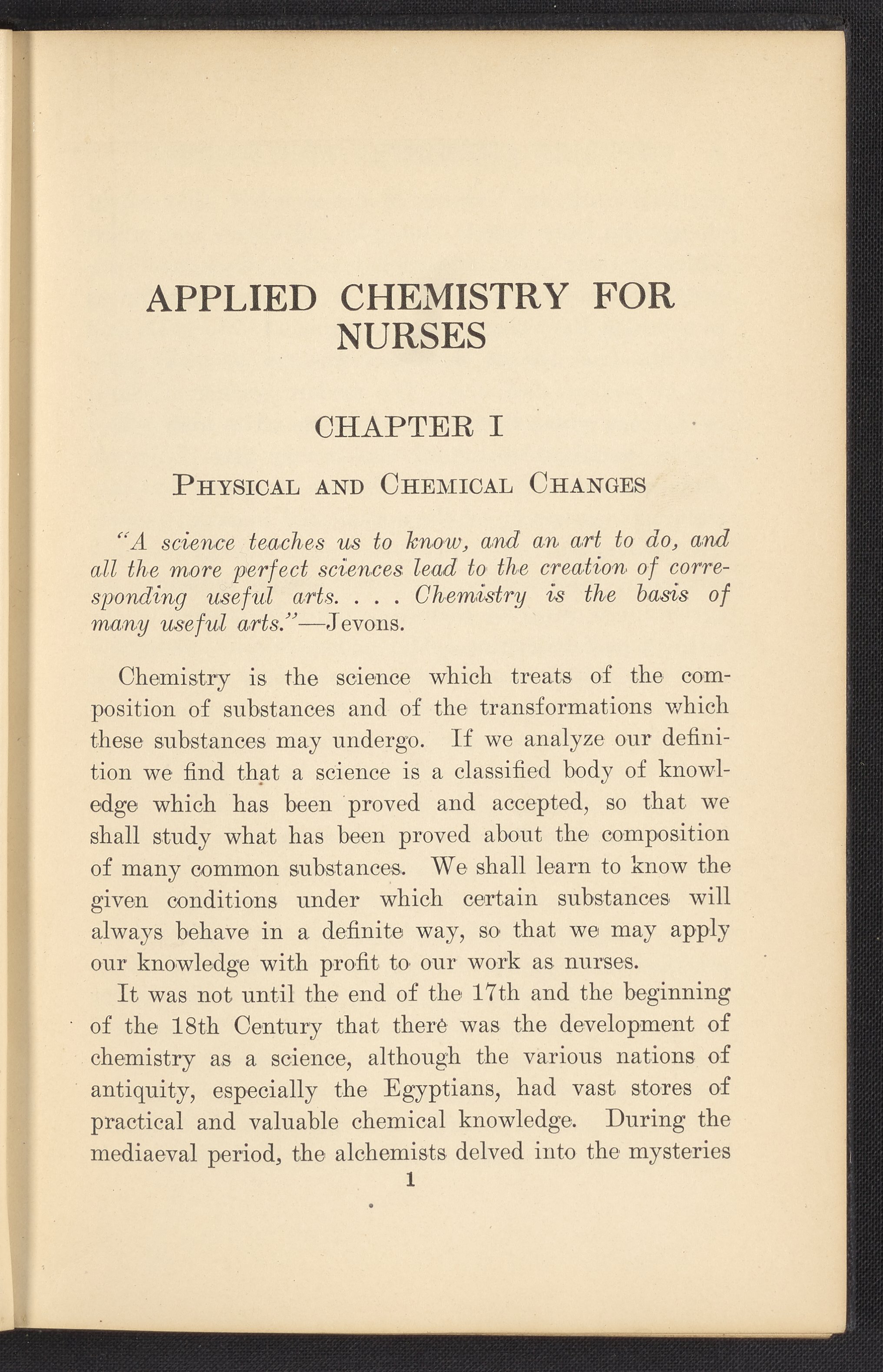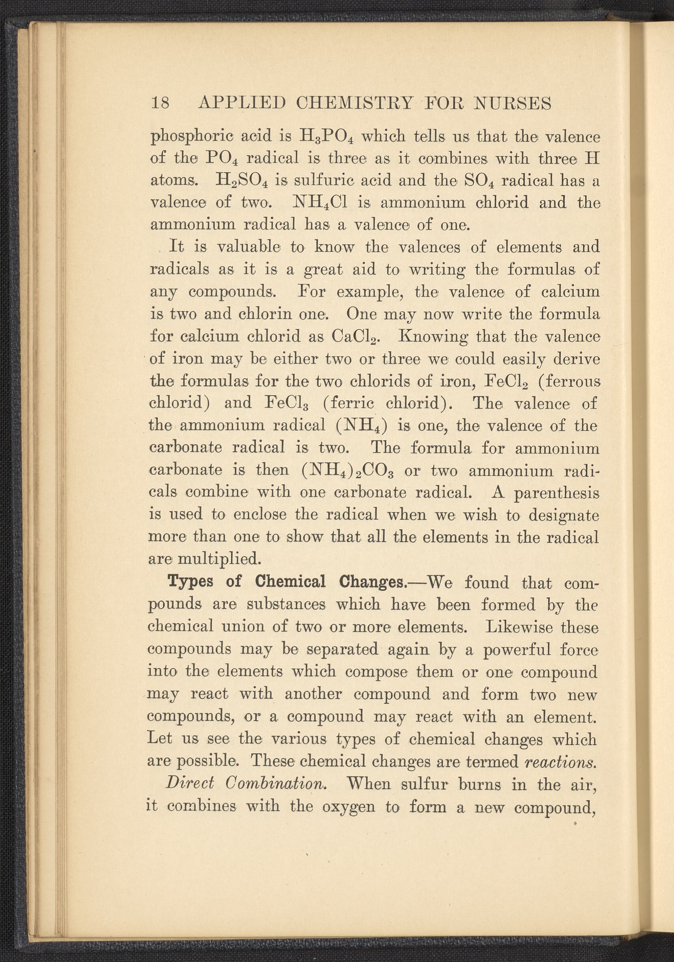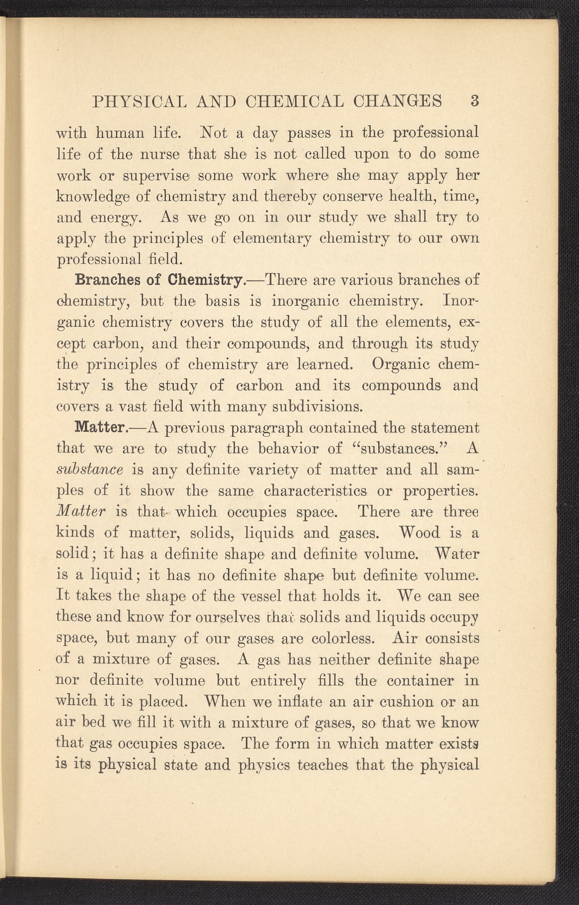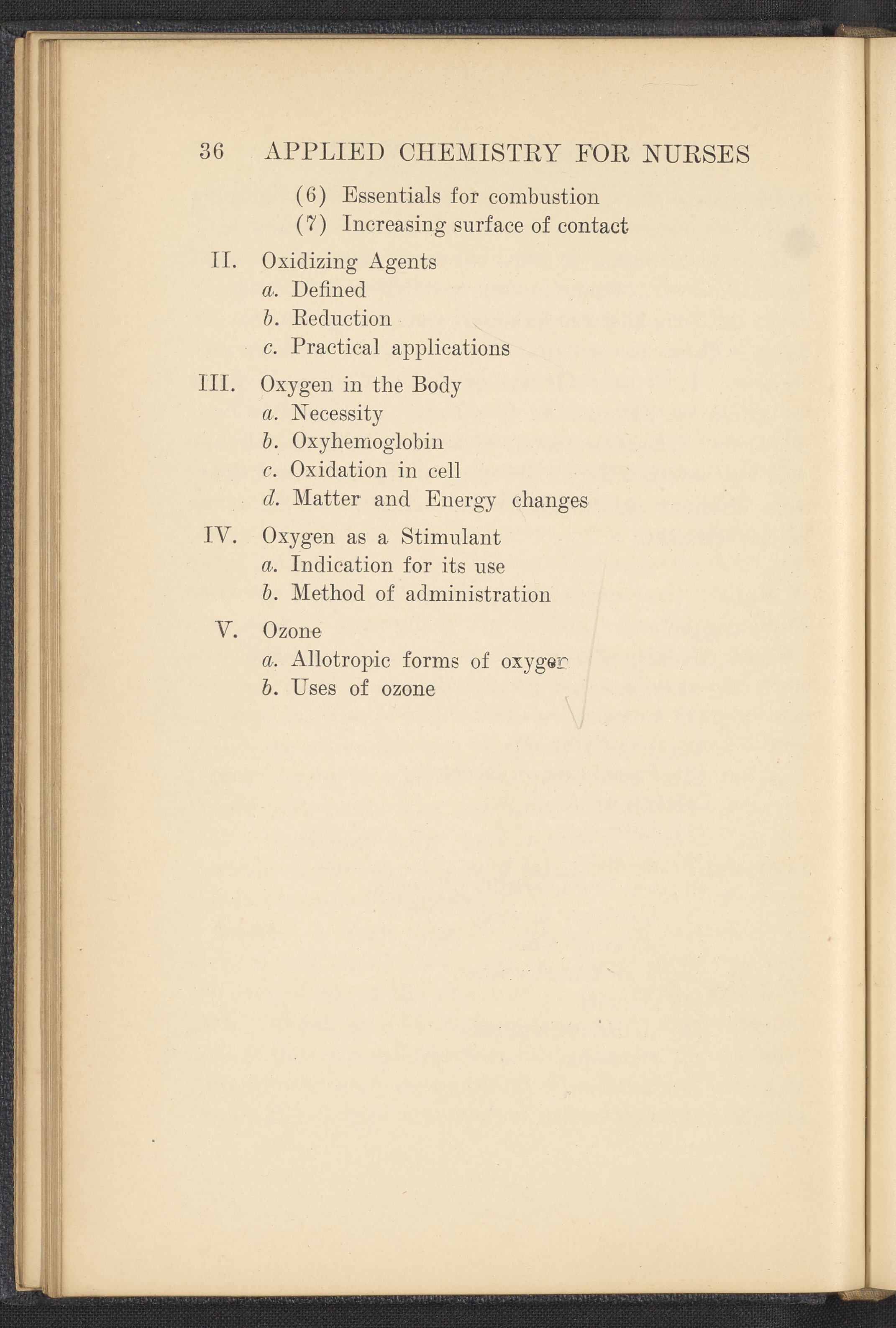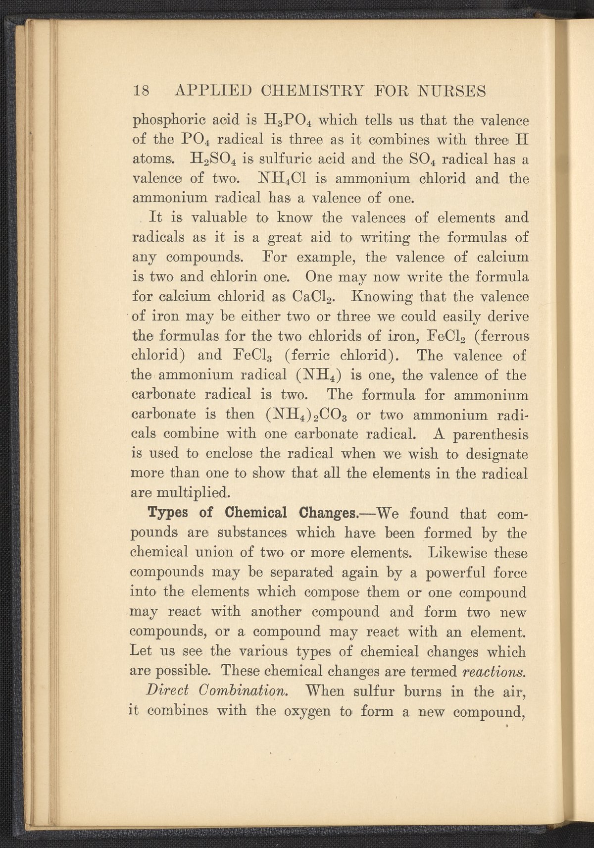 Small JPG1200 x 1657px — 591 KBFull-sized JPG2320 x 3204px — 1.8 MBOriginal fileTIFF — 2320 x 3204px — 21.3 MBPublished in 1926, this textbook of chemistry was intended to instill "the elementary foundation principles of chemistry which will be of service to the nurse in her work." The work contains chapters that discuss general principles of chemistry as well as chapters specialized to chemistry as it applies to the human body such as digestion, metabolism, blood, and excretions. The volume is digitized in its entirety.
