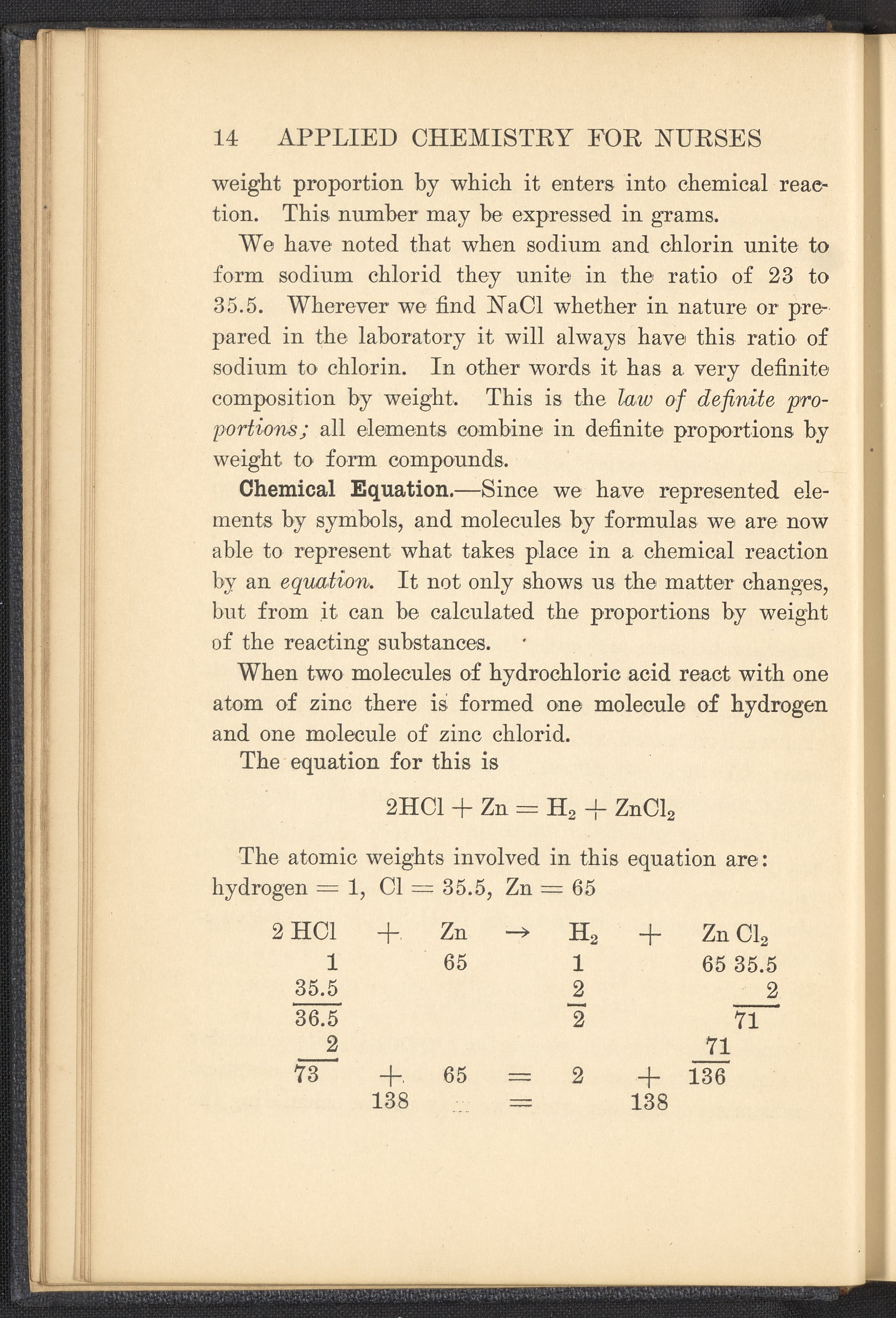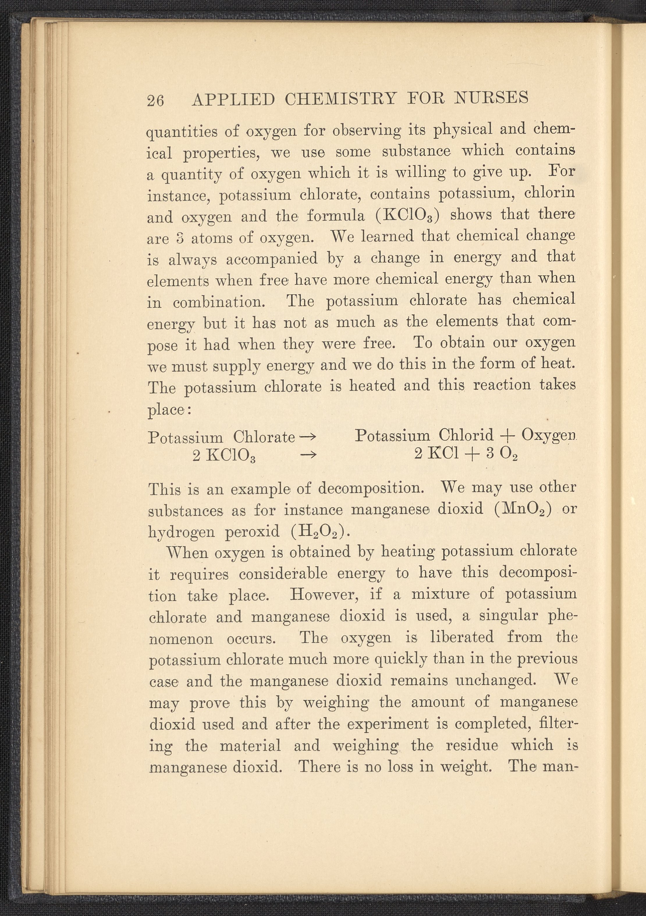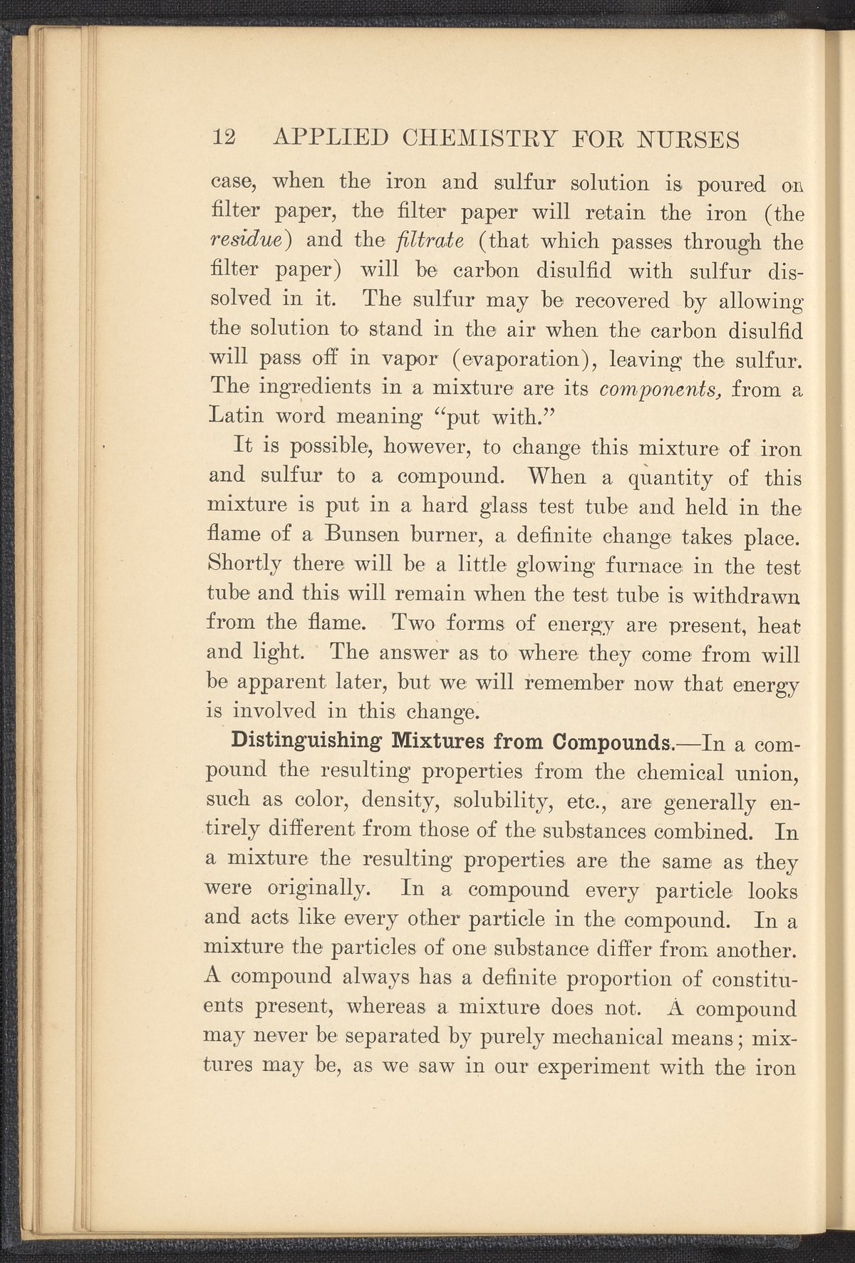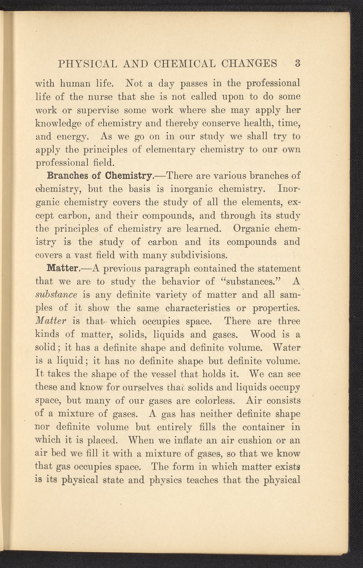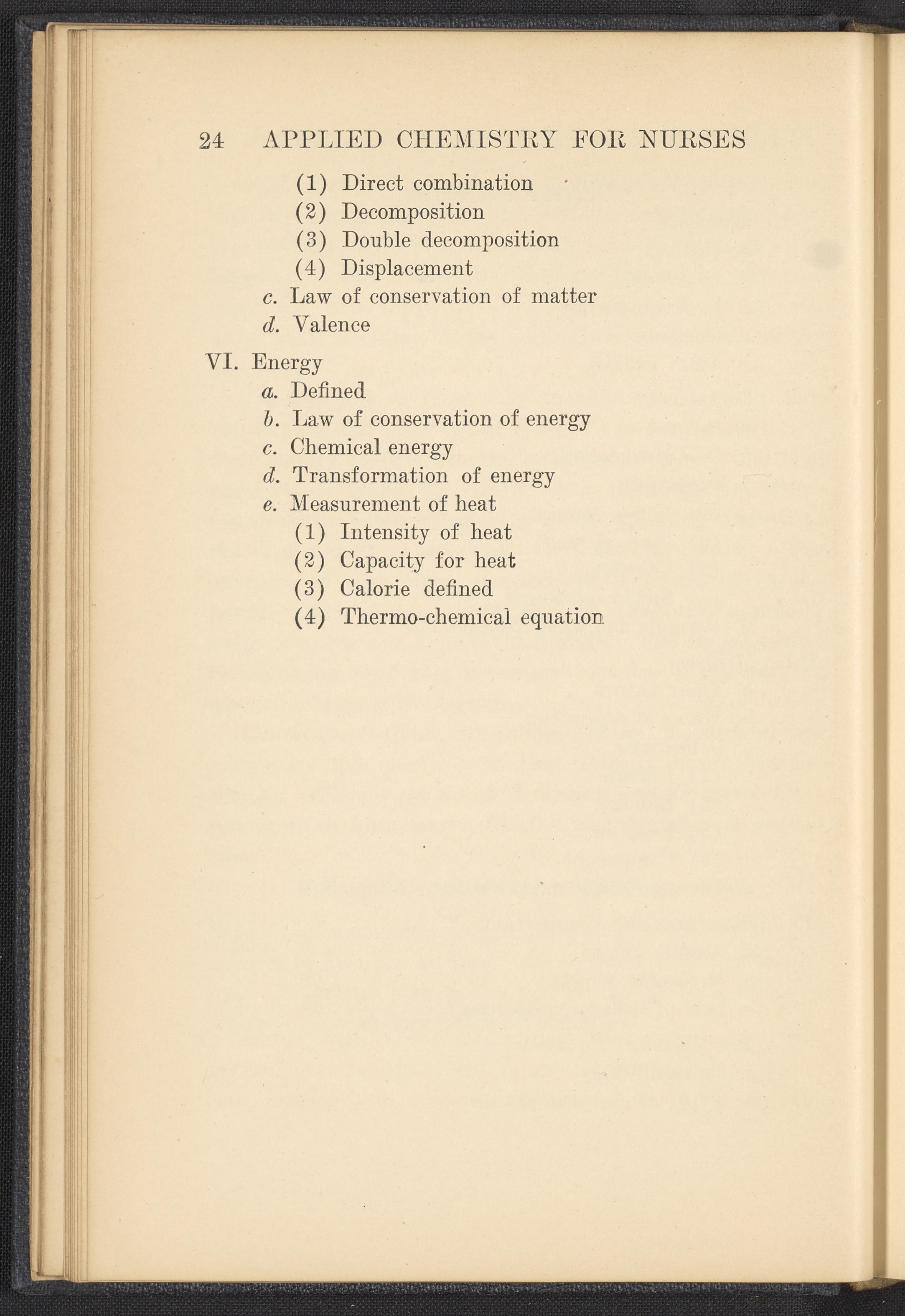 Small JPG1200 x 1657px — 591 KBFull-sized JPG2320 x 3204px — 1.8 MBOriginal fileTIFF — 2320 x 3204px — 21.3 MBPublished in 1926, this textbook of chemistry was intended to instill "the elementary foundation principles of chemistry which will be of service to the nurse in her work." The work contains chapters that discuss general principles of chemistry as well as chapters specialized to chemistry as it applies to the human body such as digestion, metabolism, blood, and excretions. The volume is digitized in its entirety.