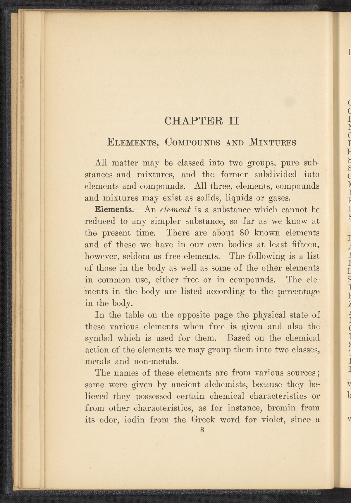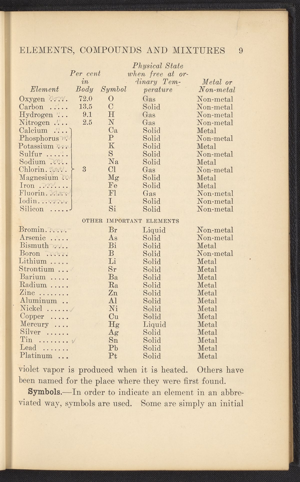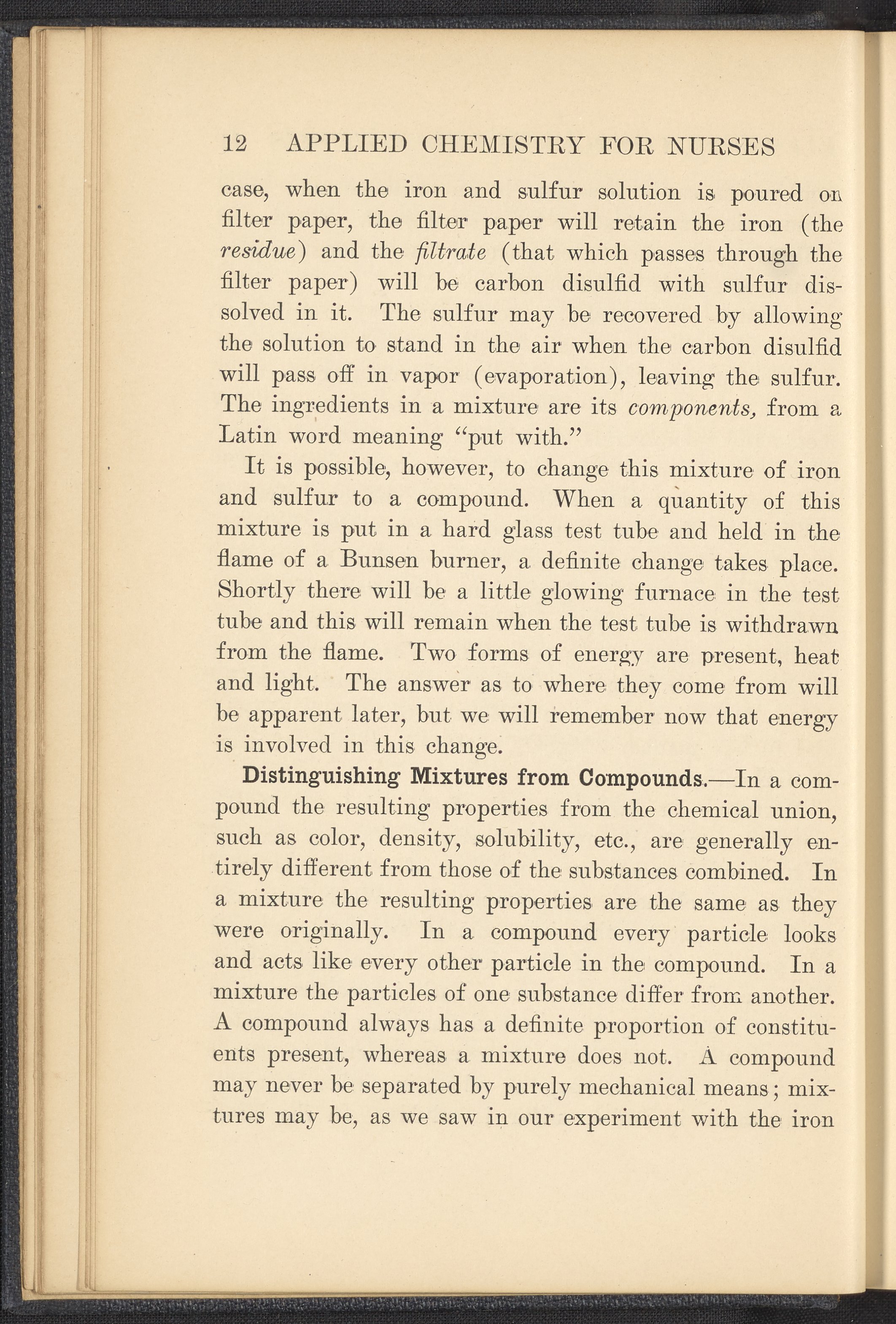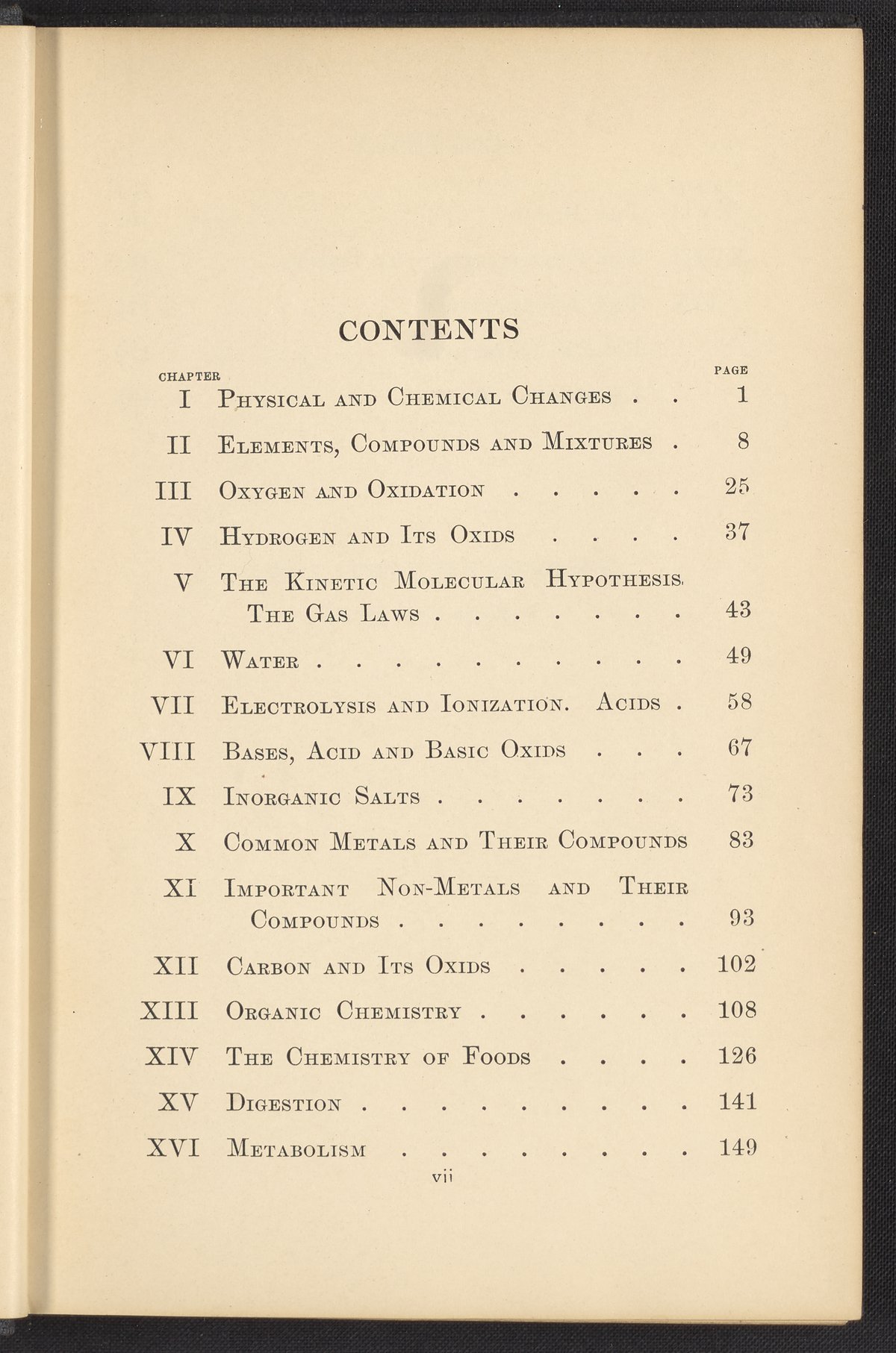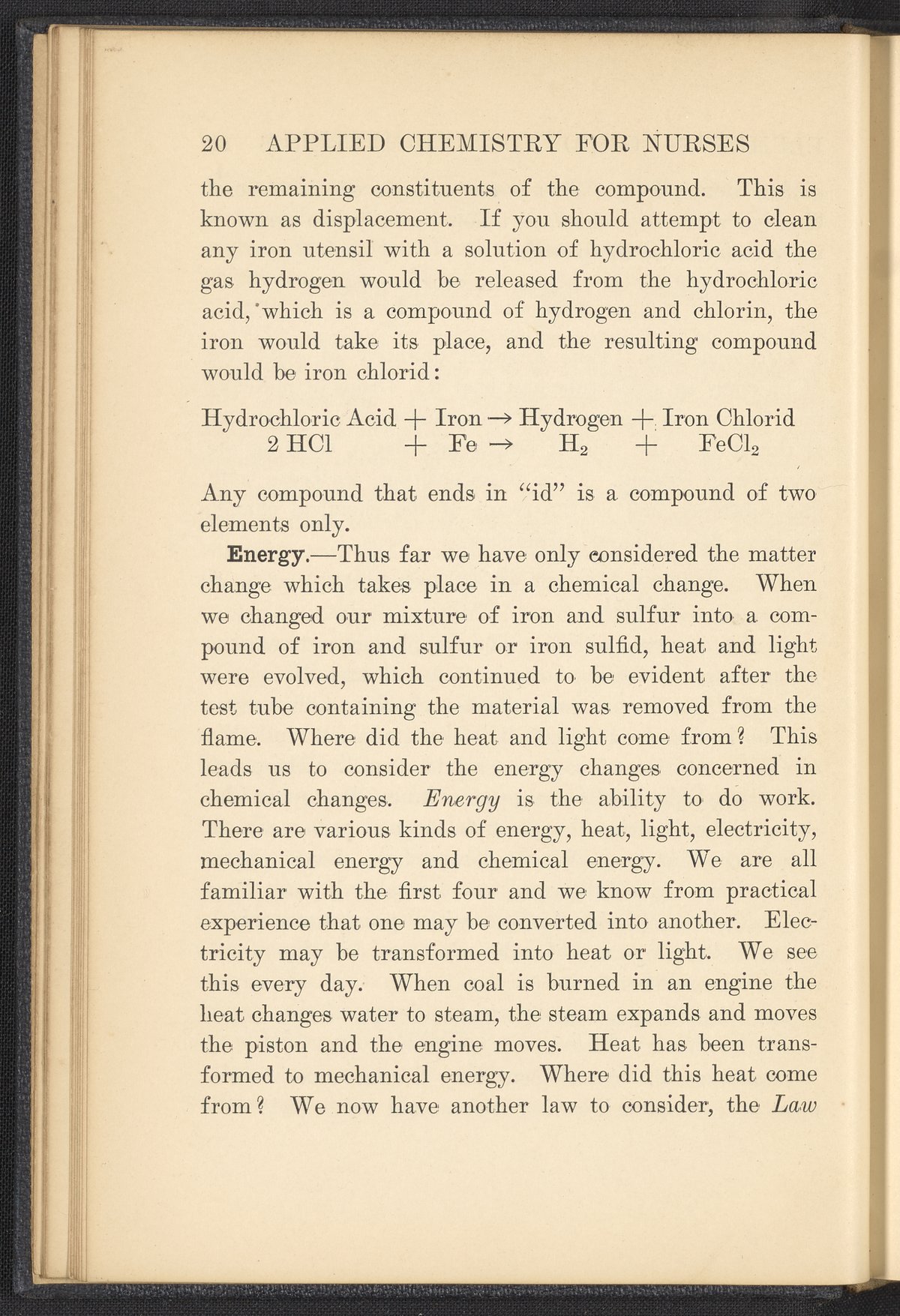 Small JPG1200 x 1657px — 591 KBFull-sized JPG2320 x 3204px — 1.8 MBOriginal fileTIFF — 2320 x 3204px — 21.3 MBPublished in 1926, this textbook of chemistry was intended to instill "the elementary foundation principles of chemistry which will be of service to the nurse in her work." The work contains chapters that discuss general principles of chemistry as well as chapters specialized to chemistry as it applies to the human body such as digestion, metabolism, blood, and excretions. The volume is digitized in its entirety.