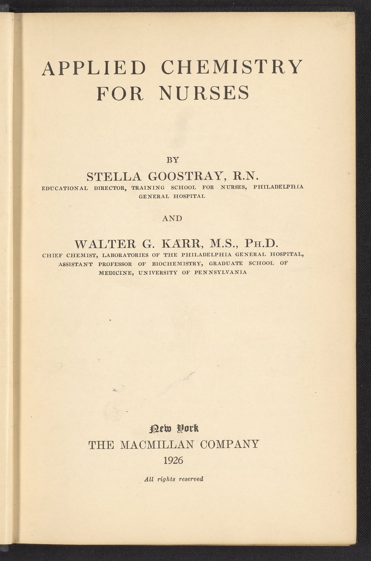 Goostray, Stella. “Applied Chemistry for Nurses.” New York, New York: Macmillan & Co., 1926. RT87 .G66 1926. Science History Institute. Philadelphia. https://digital.sciencehistory.org/works/psjiyao.