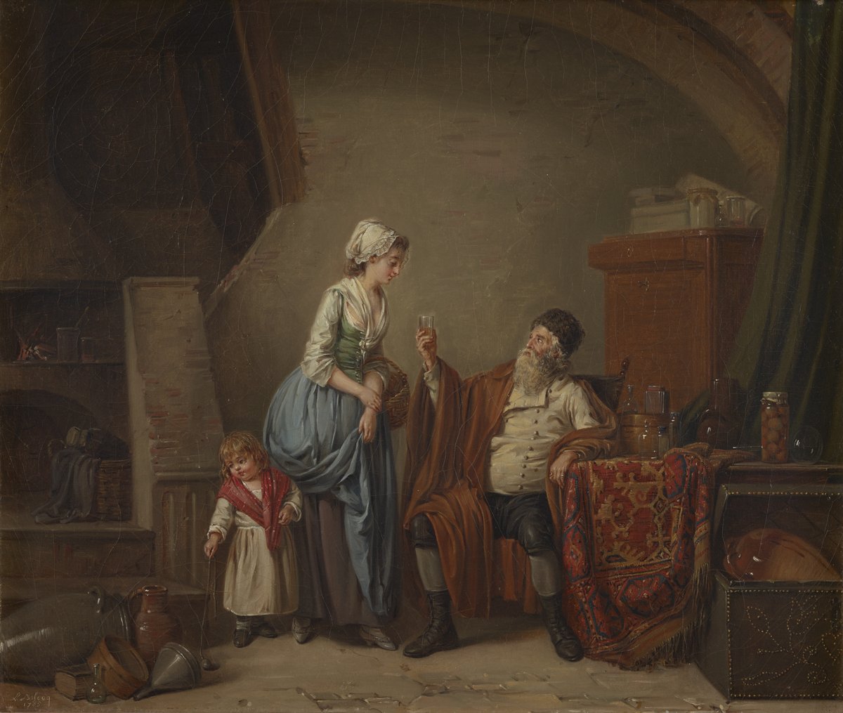 In a large stone chamber, a young woman in a blue skirt leans close to study a flask held by an elderly, bearded iatrochemist. He rests against a table covered with an embroidered carpet, topped with other glass vessels and jars. At left, a small child plays among discarded earthenware pots. Through an alcove to the rear of the room, that iatrochemist's furnace and experimental equipment can be seen.
