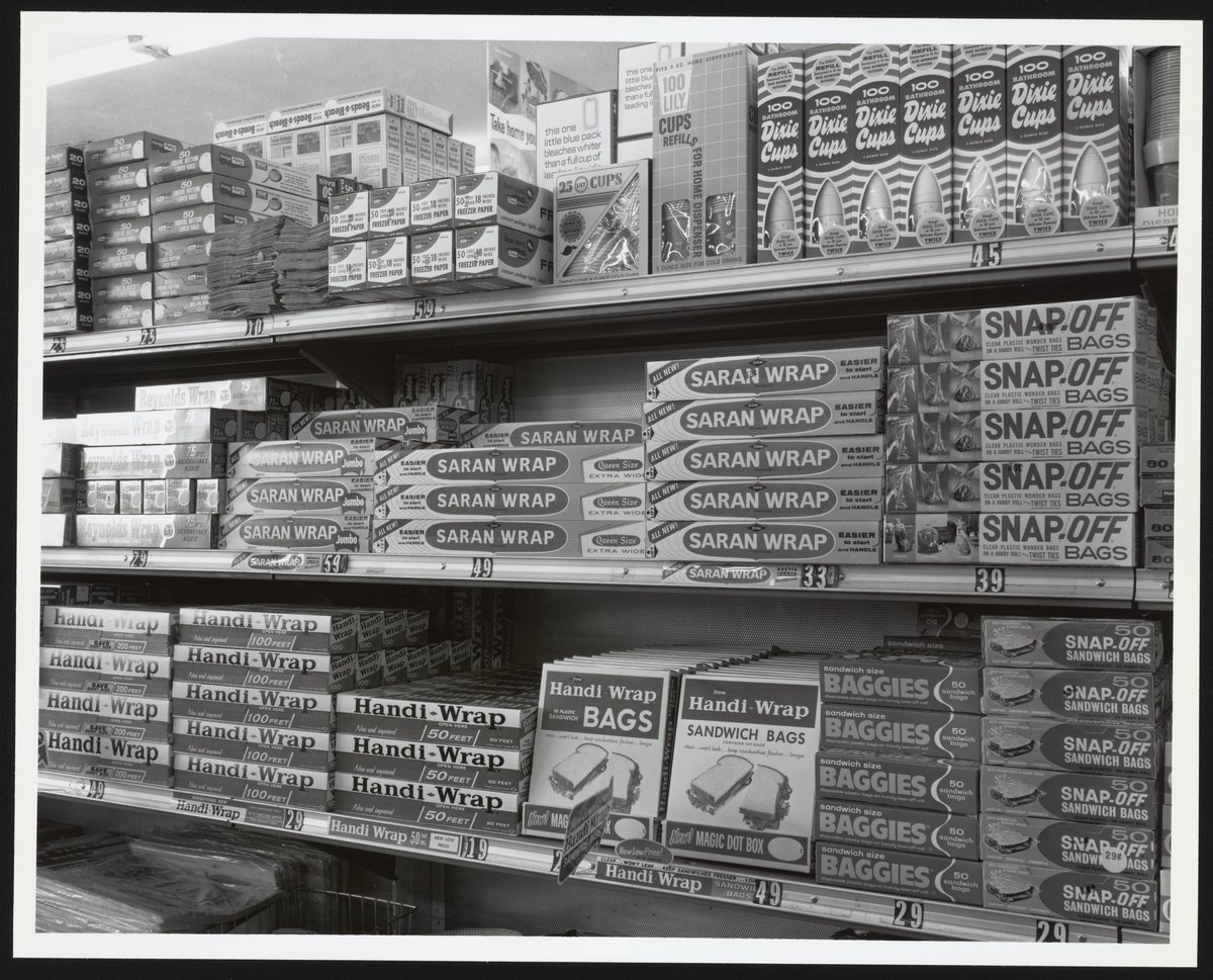 Household supplies sales display featuring Saran Wrap and Handi-Wrap