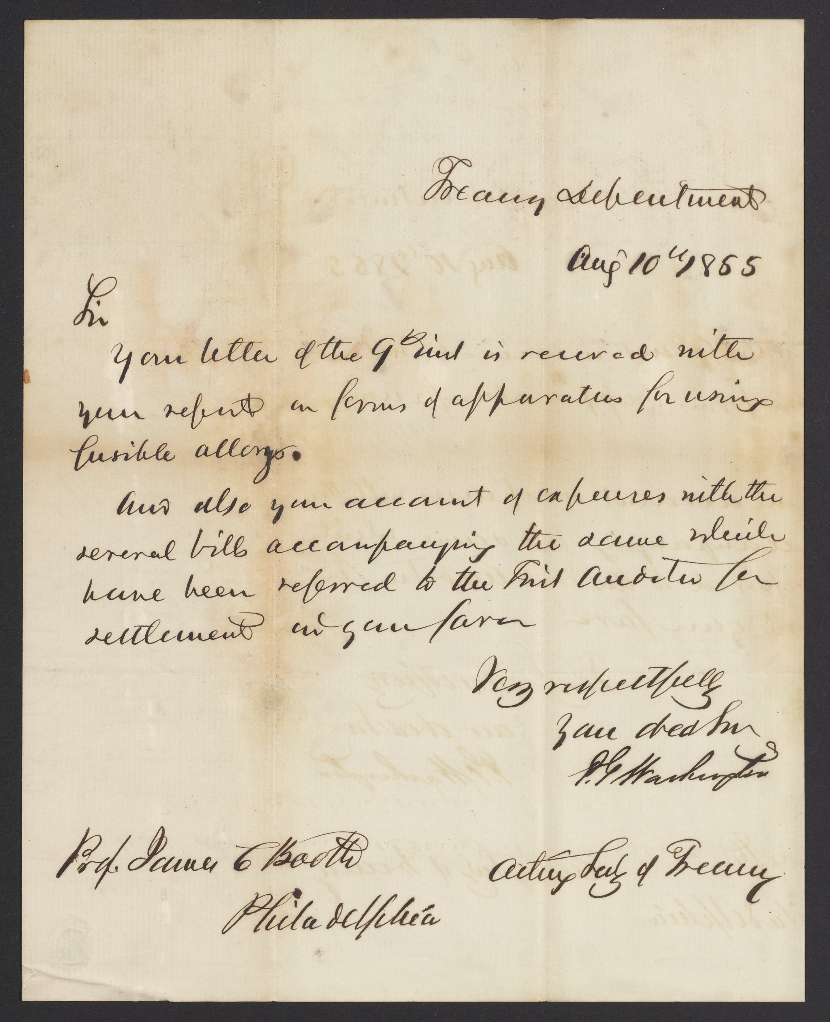 Washington, J. G. “Letter from J. G. Washington to James Curtis Booth, August 10, 1855,” August 10, 1855. Papers of James Curtis Booth, Box 2, Folder 3. Science History Institute. Philadelphia. https://digital.sciencehistory.org/works/pweohxe.