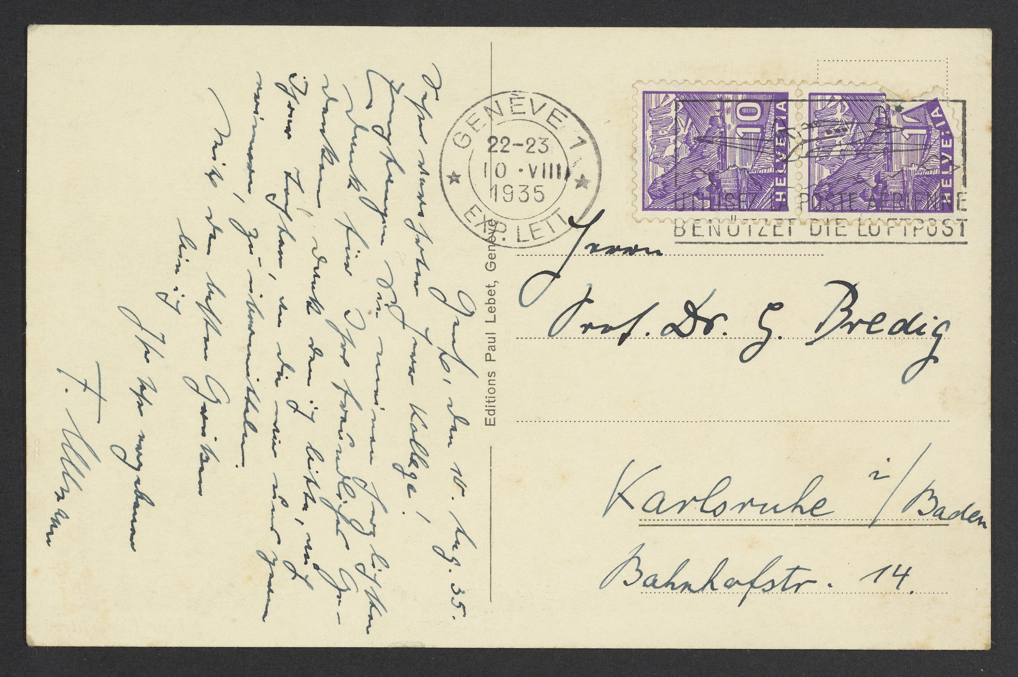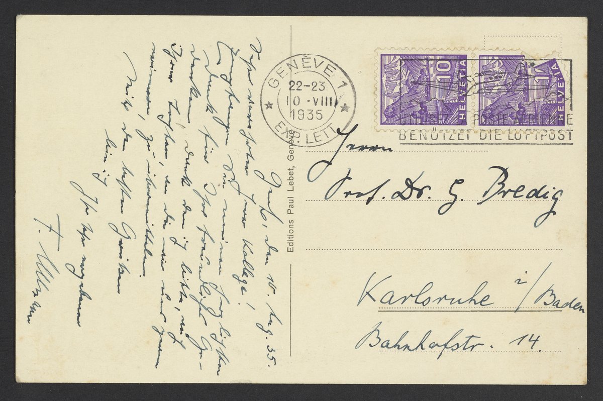 “Postcard of Geneva,” August 19, 1935. Papers of Georg and Max Bredig, Box 22. Science History Institute. Philadelphia. https://digital.sciencehistory.org/works/pxskc2n.