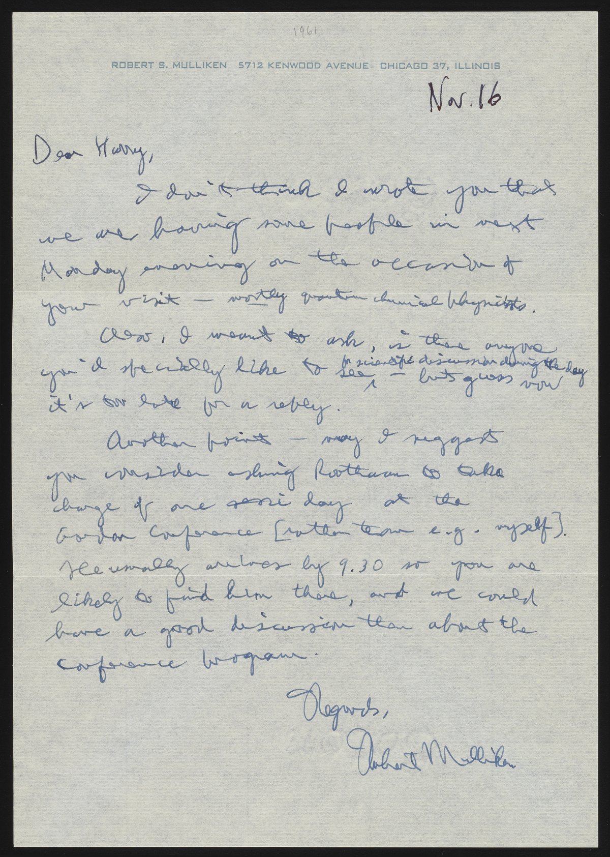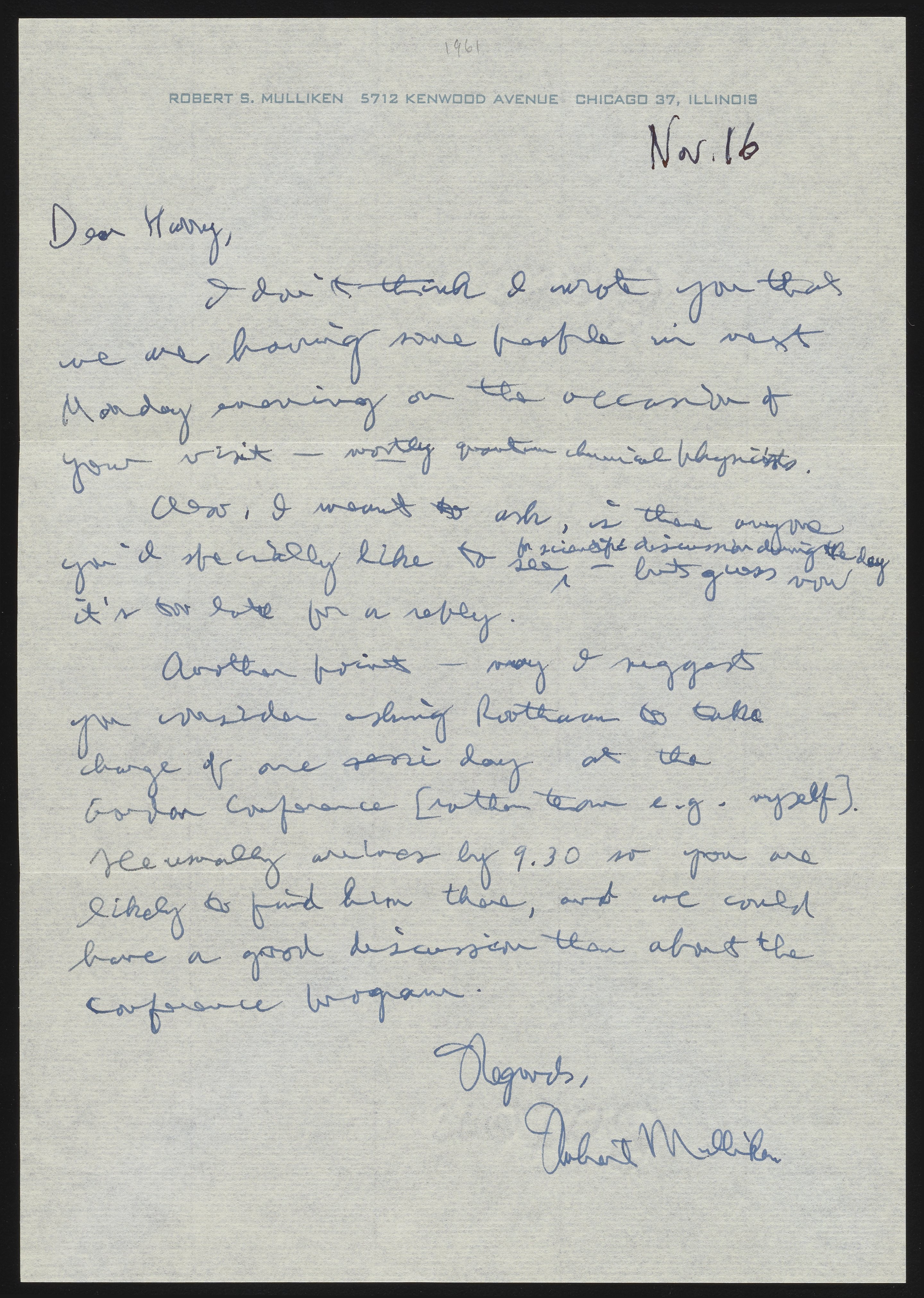 Letter from Robert S. Mulliken to Harrison Shull, 1961