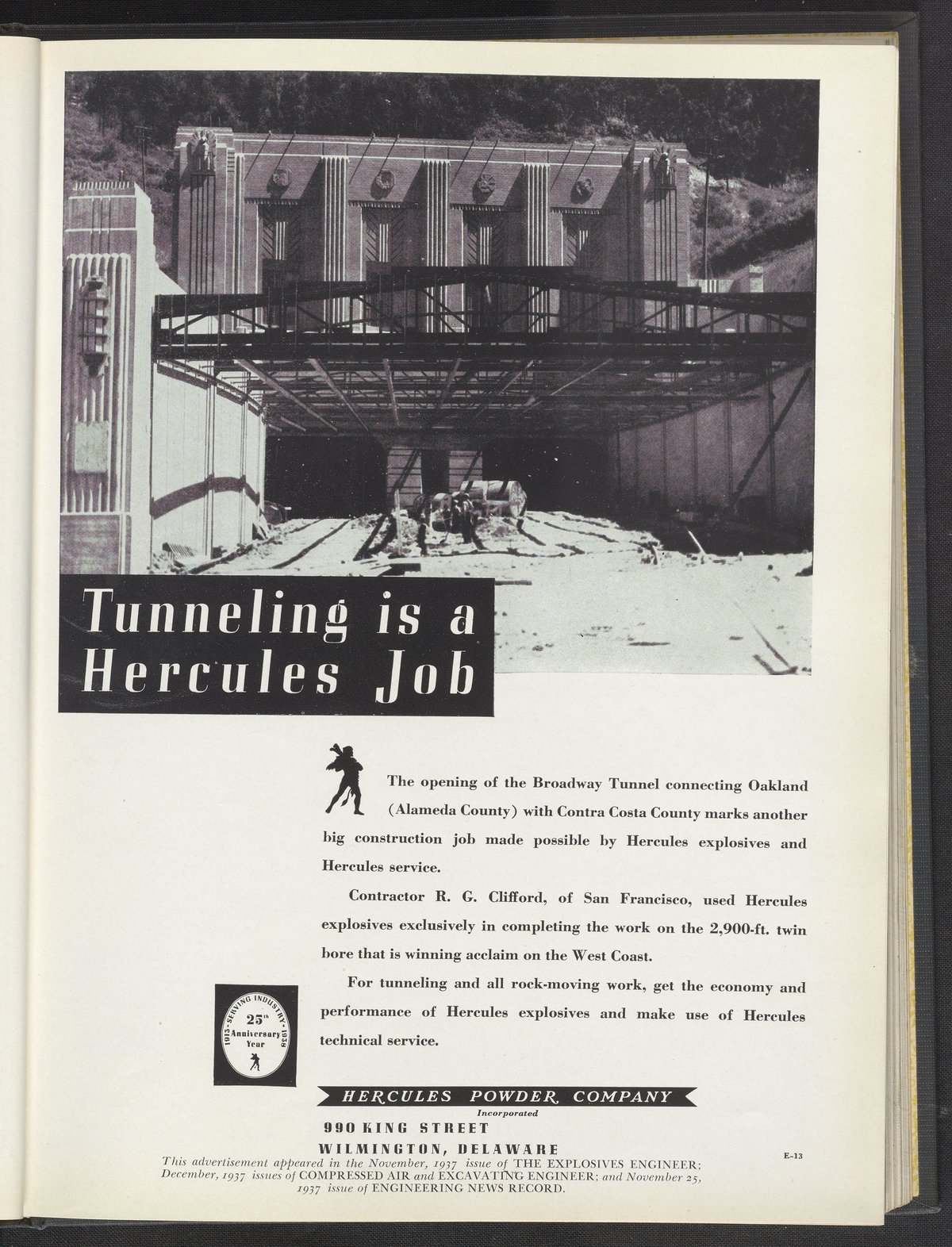 Hercules Incorporated. “Tunneling Is a Hercules Job.” 1937 Hercules Advertisements, 1937. Records of Hercules Incorporated, Volume 1937. Science History Institute. Philadelphia. https://digital.sciencehistory.org/works/pz50gw89b.